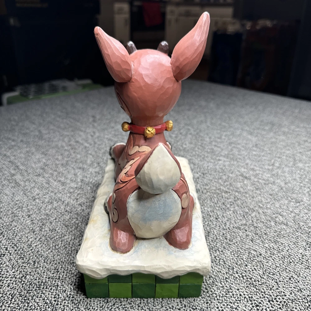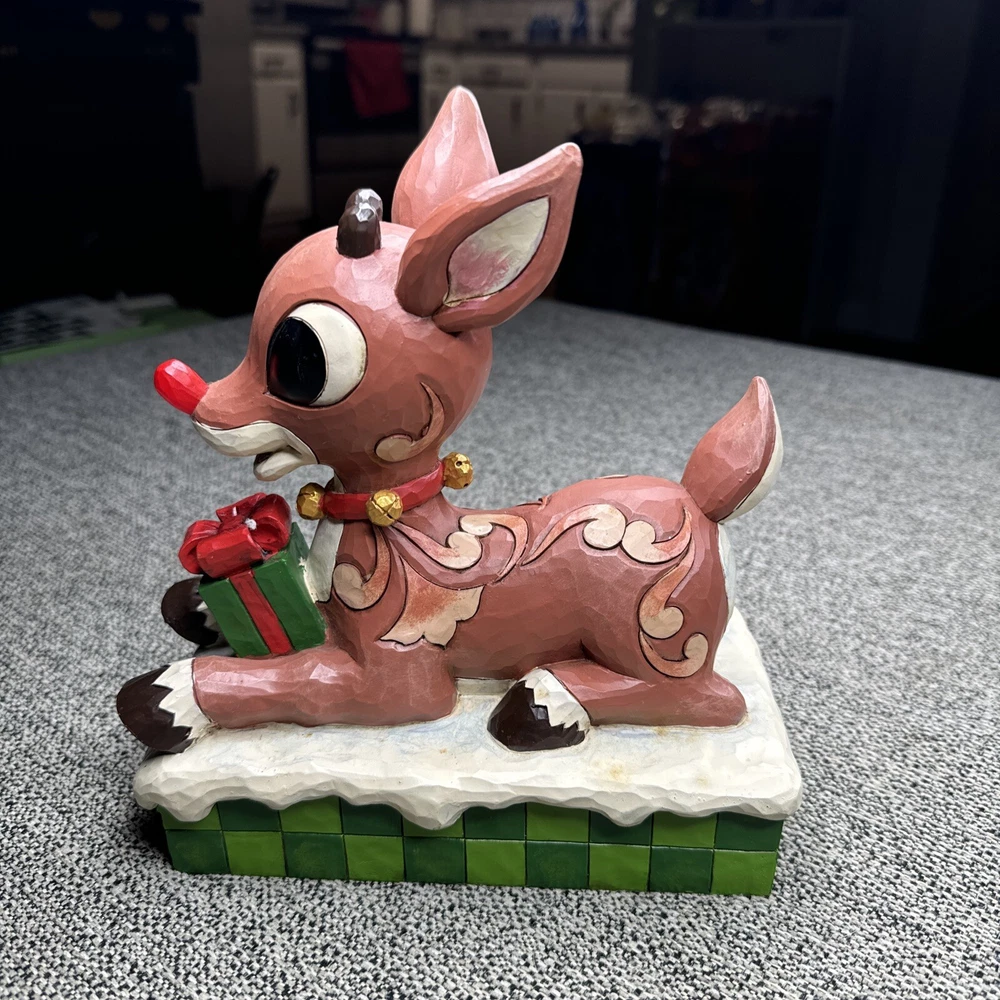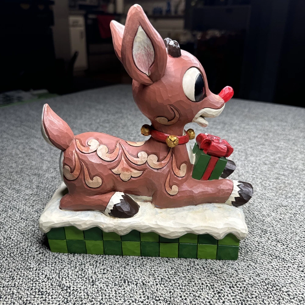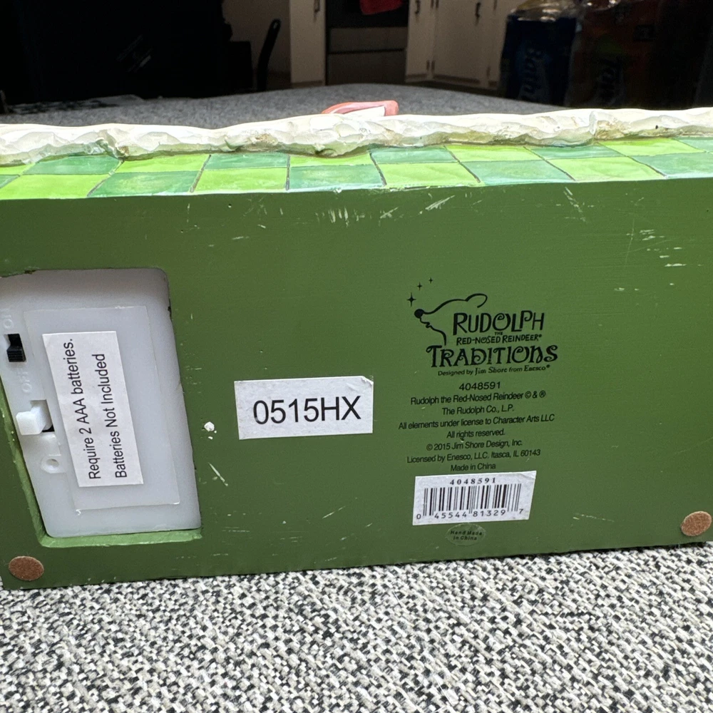 Requires 2x AAA batteries not included. The Jim Shore Rudolph The Red Nosed Reindeer figurine is a medium-sized collectible featuring a traditional style design. This 2015 manufactured figurine depicts Rudolph with an all-over red color and a matte finish. It includes a unique feature of a light-up nose, powered by AAA batteries. This original piece from the Jim Shore collection is 7 inches in length, 9 inches in height, and 4 inches in width, making it a festive addition to any holiday decor with its animated theme of Rudolph the Red-Nosed Reindeer.
