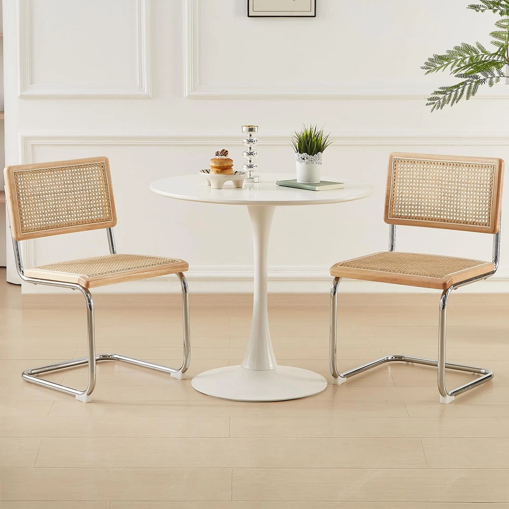 【Mid-Century Modern Design】Blending Minimalism with a touch of retro luxury, with sleek lines and simple design, We have 8 different materials and colors of seat for different styles of table, the rattan chair must be a perfect piece to your dream home. 【Ergonomic Design】Featuring an ergonomic hand-woven rattan back and padded seat with high-density foam cushioning,our cane chair ensure comfortable and breathable seating experience; The armless dining chair suitable for individuals of different body types, will not make people feel constrained; 【Sturdy and Durable】The robust metal frame enhances the durability of the kitchen table chairs, with a maximum weight-bearing capacity of up to 200 lbs.The floor is also protected from scratching thanks to the rubber feet on dining chair legs. 【Easy to Clean and Storage】The chairs can be stacked together for easy storage; installation is very simple, with instructions and tools!the backrest is not easy to dirty, high-quality rattan fabric seat is sitting for a long time without collapsing,resistant to dirty good wipe. 【Multipurpose&Excellent Customer Service】 Mid-century modern style, Sturdy chairs can be used in dining room, guest room, living room, kitchen, lounge, extra room and so on.We have worry-free quality assurance&friendly customer support, e-mail us when you need help.