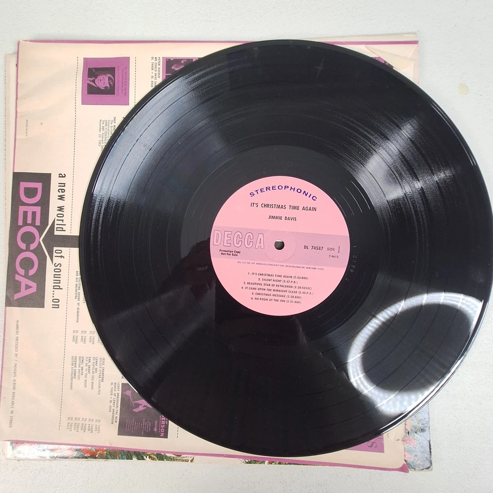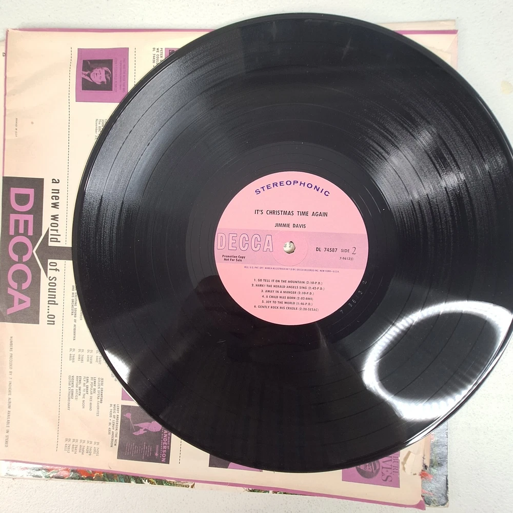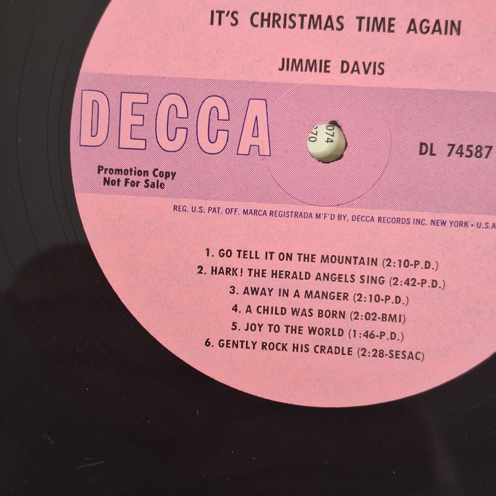Record Size:12"Format:RecordArtist:Jimmie DavisUPC:Does not applyStyle:1960s, Traditional ChristmasSpeed:33 RPMCountry/Region of Manufacture:United StatesCatalog Number:DL 74587Record Label:DeccaMaterial:VinylInlay Condition:Very Good Plus (VG+)Features:Original Cover, Original Inner SleeveRecord Grading:Very Good Plus (VG+)gtin13:Does not applyType:LPRelease Year:1964Number of Audio Channels:StereoEra:1960sEdition:First PressingLanguage:EnglishGenre:Country, Gospel, Holiday, Religious & DevotionalCase Type:Cardboard SleeveSleeve Grading:Very Good Plus (VG+)Occasion:ChristmasRelease Title:It's Christmas Time AgainSeller Notes:“Plays Well”