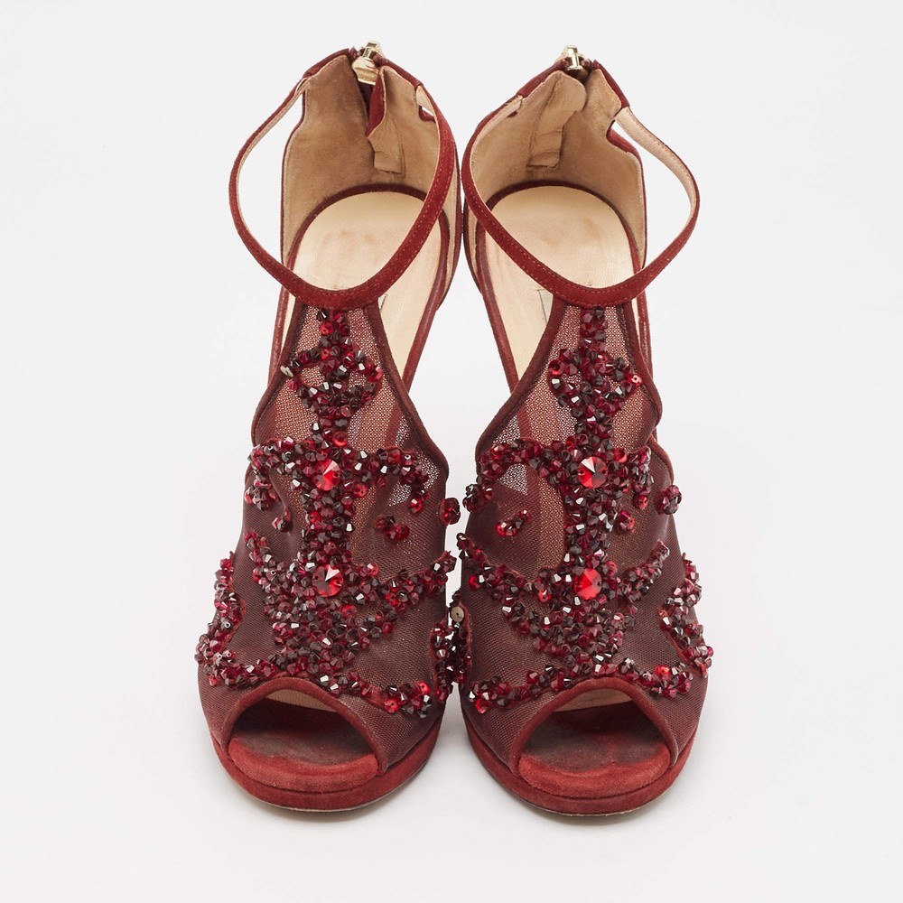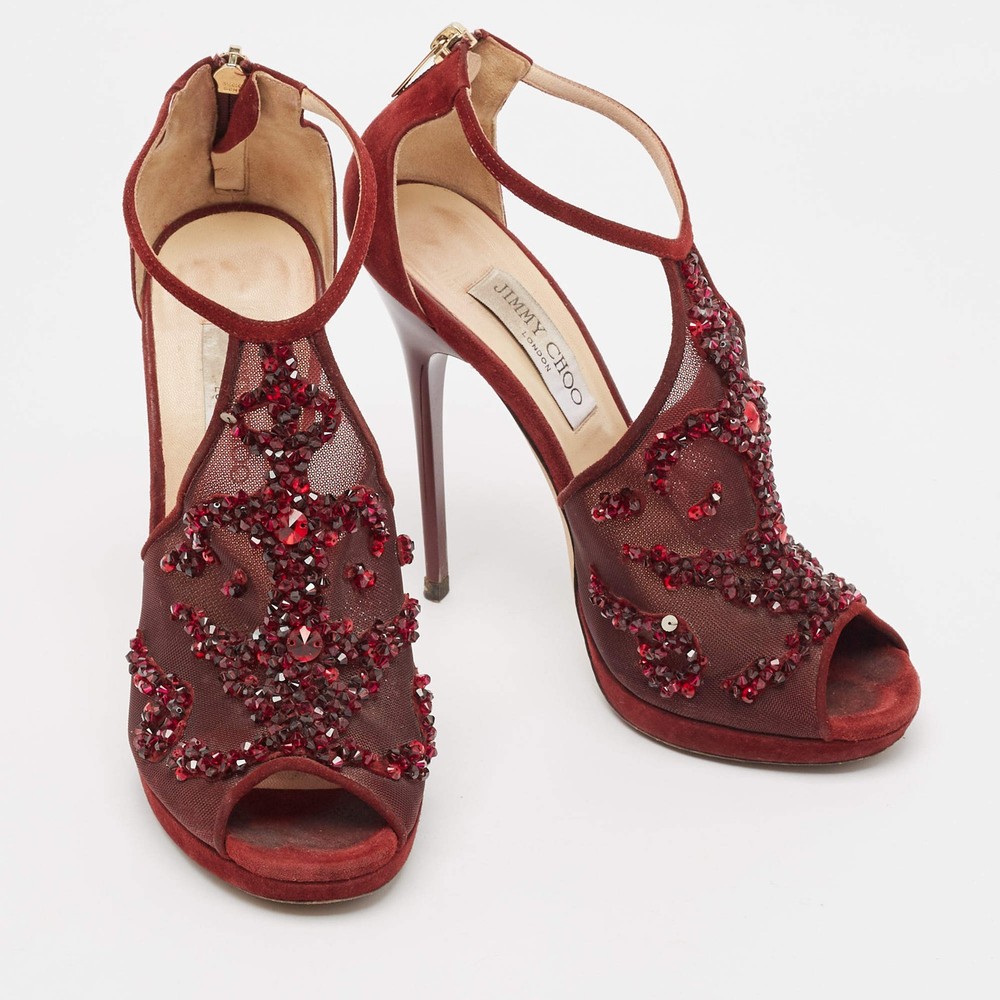Our eBay Store About Us Contact Us Add to Favorite Sellers Jimmy Choo Burgundy Mesh and Suede Embellished Ankle Strap Sandals Size 38.5 These sandals will frame your feet in an elegant manner. Crafted from quality materials, they display a classy design and comfortable insoles. Product Details Brand Jimmy Choo Color Burgundy Includes The Luxury Closet Packaging Outsole Length 21cm Outsole Width 7.5 cm Size 38.5 Certified by The Luxury Closet This item has gone through a detailed authentication process overseen by our experts. We offer a lifetime guarantee of authenticity on all our items. How We Check The in-house team of experts at The Luxury Closet is highly trained to verify the authenticity and the condition of the luxury products. They ensure that only 100% authentic items are put on sale.The evaluation process is unique with its own mix of assessment criteria and differs according to the category. Each item is evaluated based on the following combination of hallmarks, hardware, stitching, symmetry, material, craftsmanship, stamping, codes, hologram stickers, and packaging. Our authenticators also check if the items have been modified or amended (e.g., aftermarket diamonds, replaced batteries, repaired bags, etc.) International Buyers Import duties, taxes and charges are not included in the item price. These charges are the buyers responsibility. Please check with your country’s customs office to determine what these additional cost will be prior to buying.