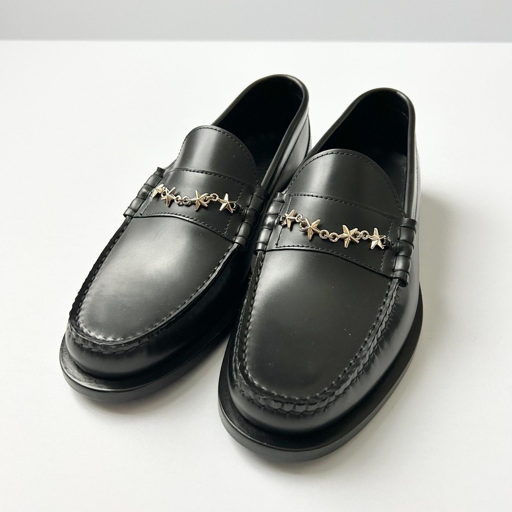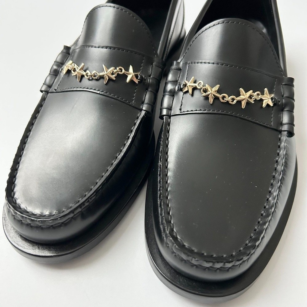 Jimmy Choo Mocca Gold Tone Star Chain Loafers in Black Leather. Brand new without tags or box. Size 39 IT, 9 US. Jimmy Choo black leather moccasin loafers showcase a sophisticated blend of classic tailoring and whimsical detail. Crafted in Italy from premium smooth shiny calf leather, these flats feature a distinctive gold-tone star chain embellishment across the vamp, adding a celestial touch to the traditional penny loafer silhouette. The almond toe and slight block heel provide a timeless profile, while the tonal stitching and leather soles ensure durability and comfort for all-day wear. Material: Smooth Leather Hardware: Gold-tone Star Chain Toe Shape: Almond Heel Type: Low Block Heel Origin: Made in Italy Style: Penny Loafer Celestial, Dark Academia, Preppy, Luxury, Designer, Starry, Office Wear, Minimalist, Italian Leather, Chic, Classic, Sophisticated, Statement Shoe SKU 7725