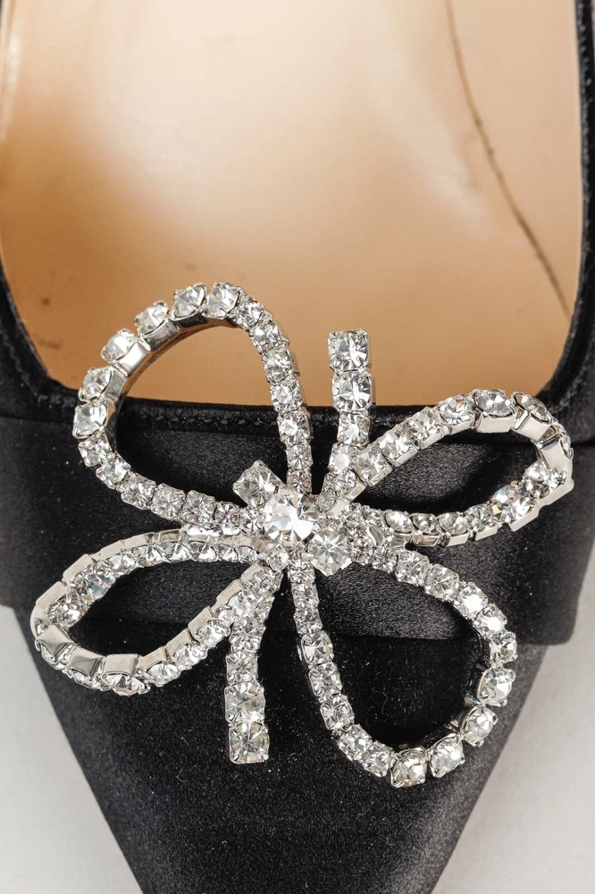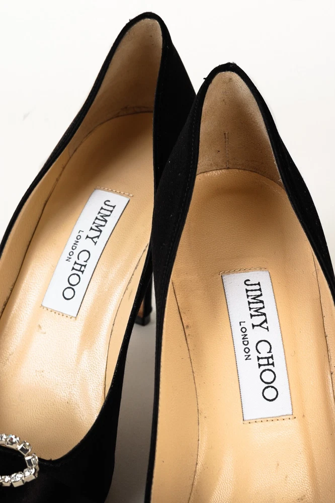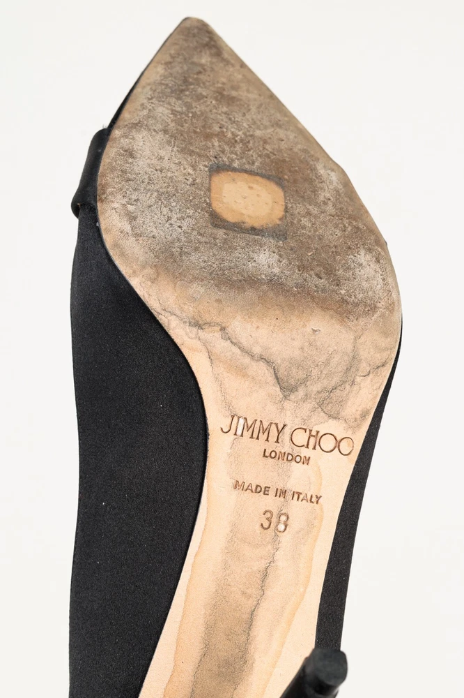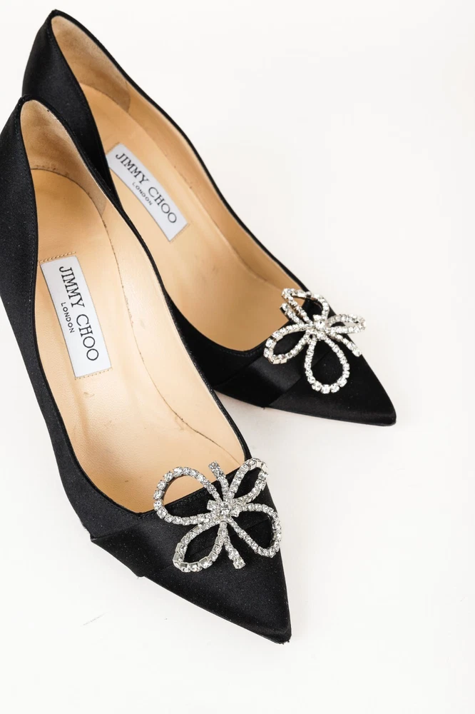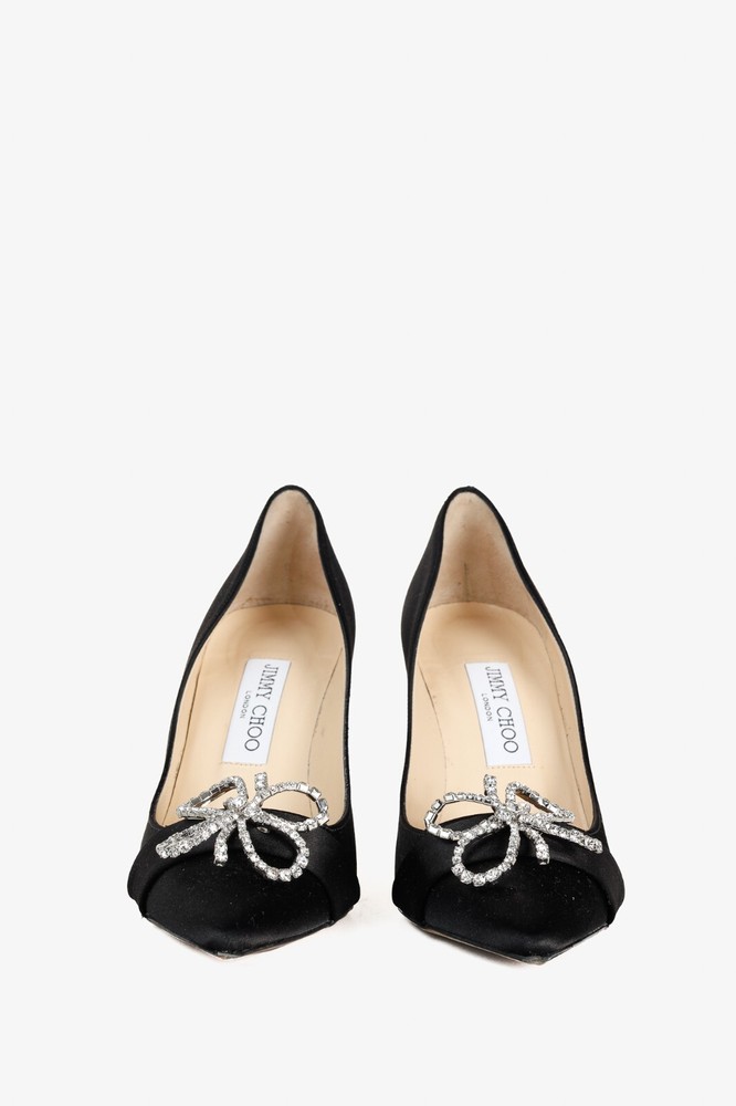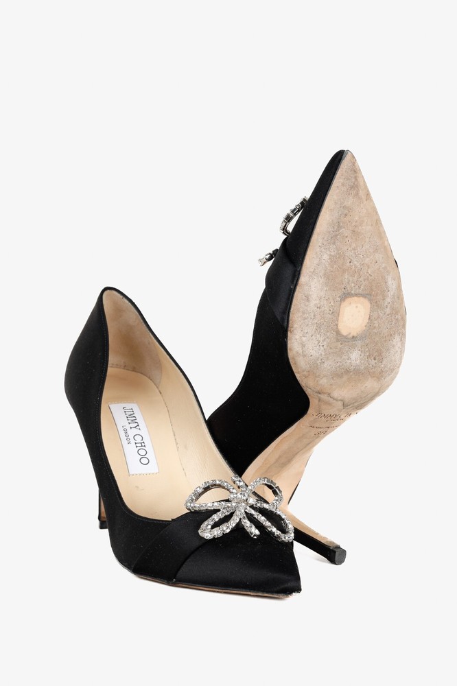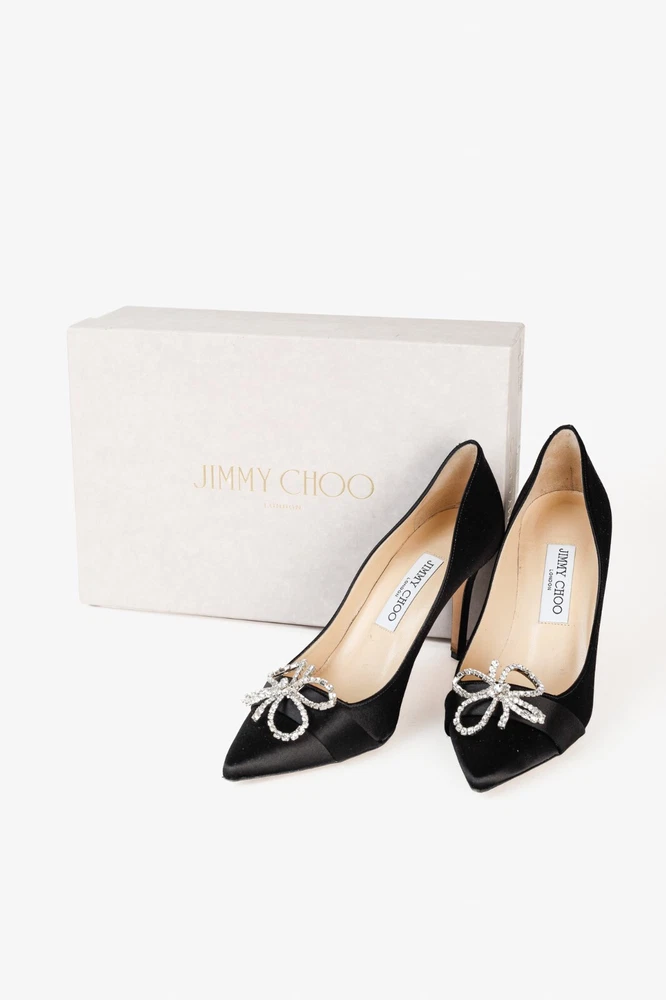 Circa 2016, the Veil 85 pumps from Jimmy Choo are crafted in a black satin, and are embellished with crystal bows on the vamps. They feature covered stiletto heels, closed pointed toes, and leather lining and soles. Size: 38 (US 7.5) Condition: Excellent; very light marking on upper, very light scratching on toes, light signs of wear on insoles, moderate wear on outsoles. Comes with dustbag and box. Approximate Measurements: Insole Length: 9.5” (24 cm) Heel Height: 3.5” (9 cm) Composition: Satin upper, crystal embellishments, leather lining and soles.