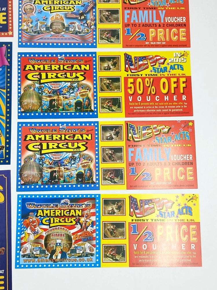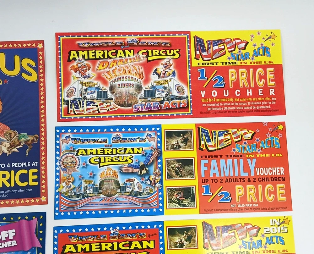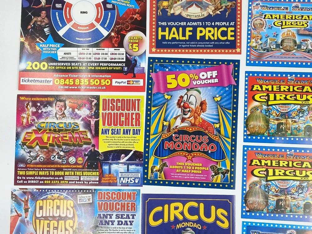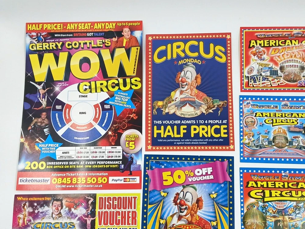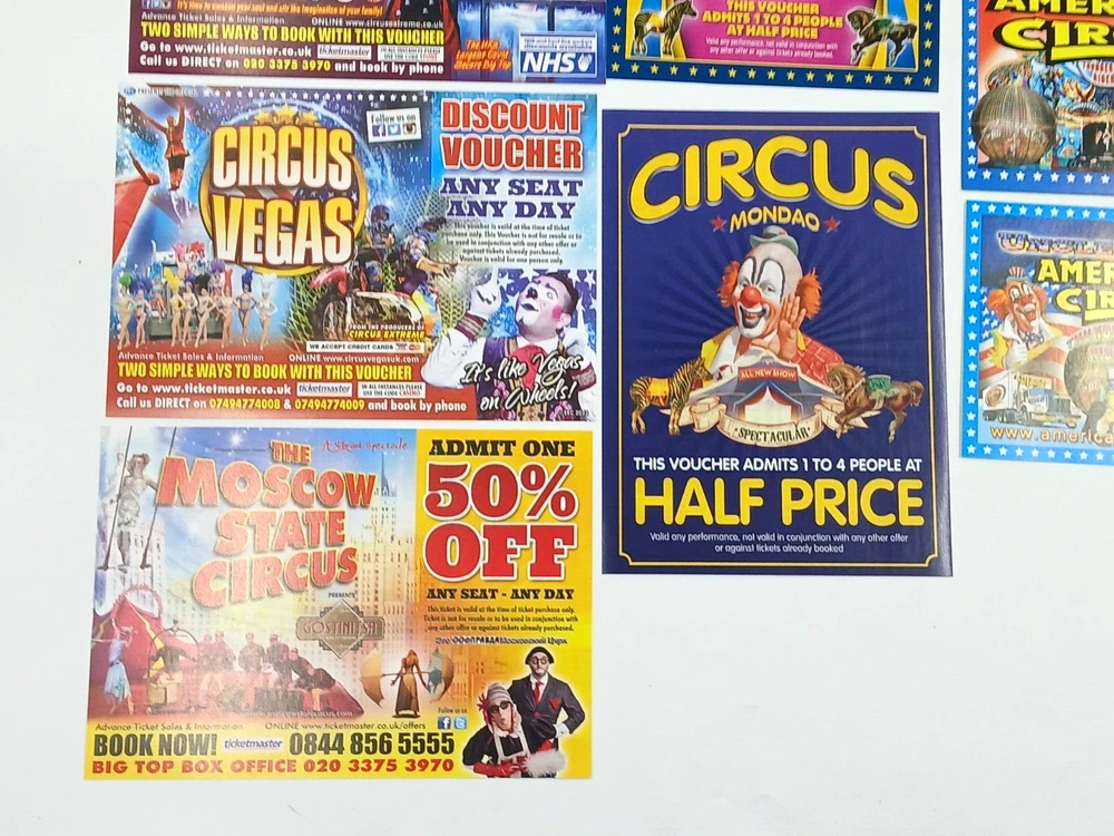 Job Lot Circus Flyers/Vouchers Includes: Circus Mondao, Uncle Sam's Great American Circus, Gery Cottle's WOW circus, Moscow State Circus, Circus Vegas, Circus Extreme Any questions, please ask Thanks for looking!