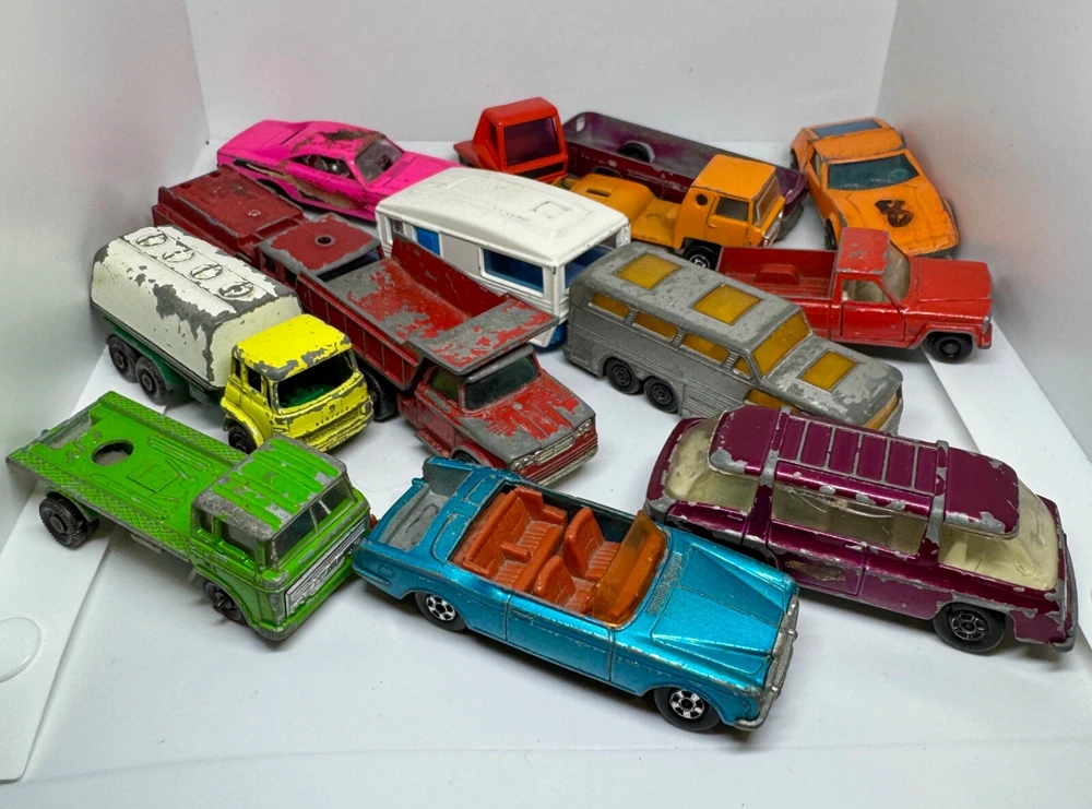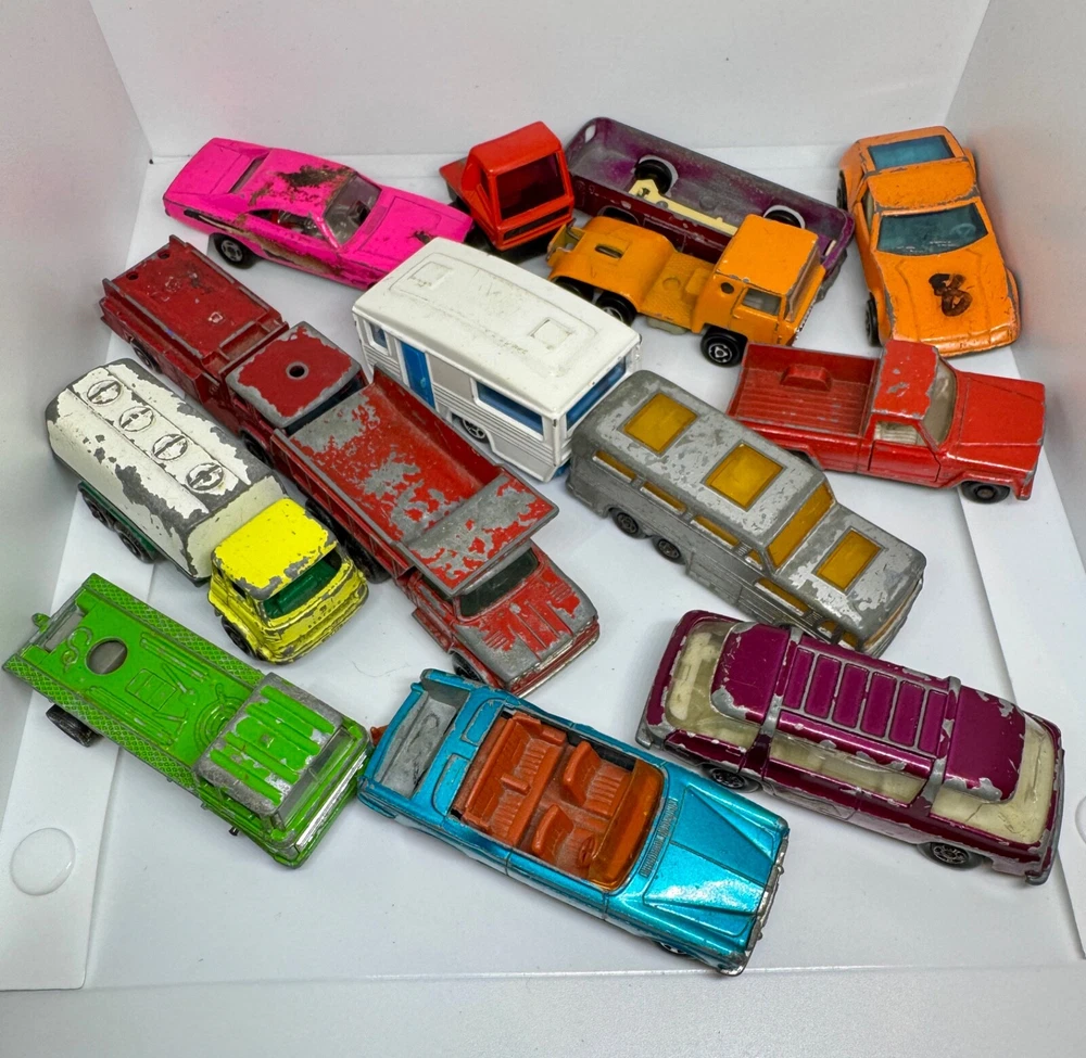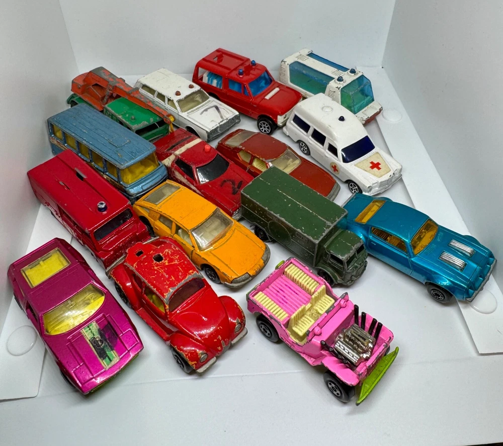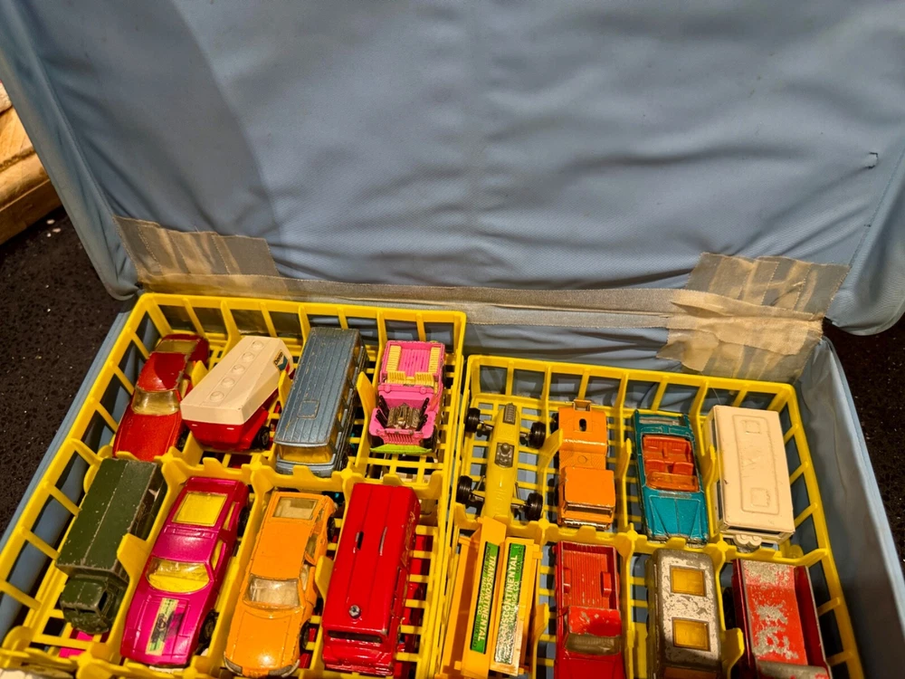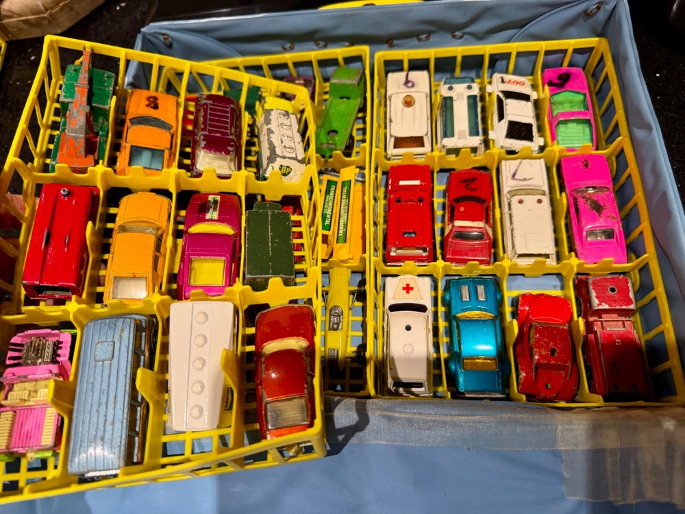 Job Lot Group Vintage Matchbox Lesney Corgi Diecast Metal Model Toy Cars Approximately 30 individual pieces. They come in an original vintage Matchbox Carry Case. This lot comes from a house clearance, and I am selling them as found. They are in various, play-worn conditions, so please expect paint chips, wear, damage, missing parts, etc. Some of them have numbers painted in black on them. The carry case is also well worn and has been taped over the years. They would be great for restoration / parts, etc or for a starter collection. 99p start - no reserve. UK postage will be via Royal Mail Tracked 48.
