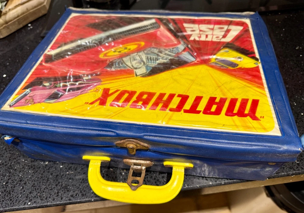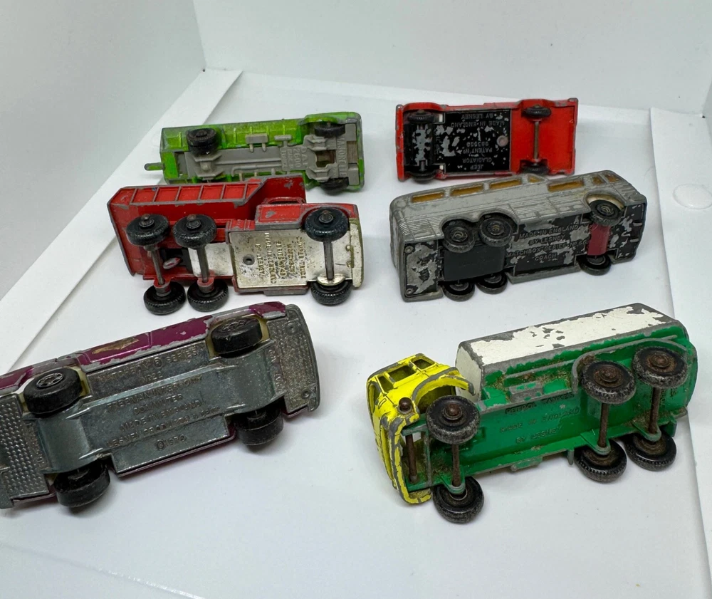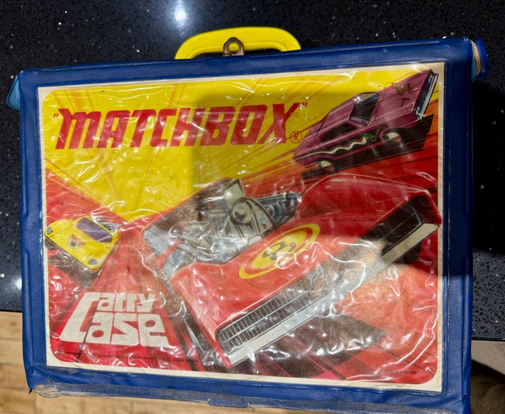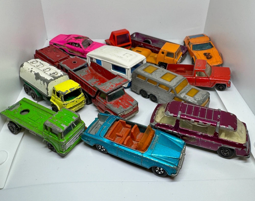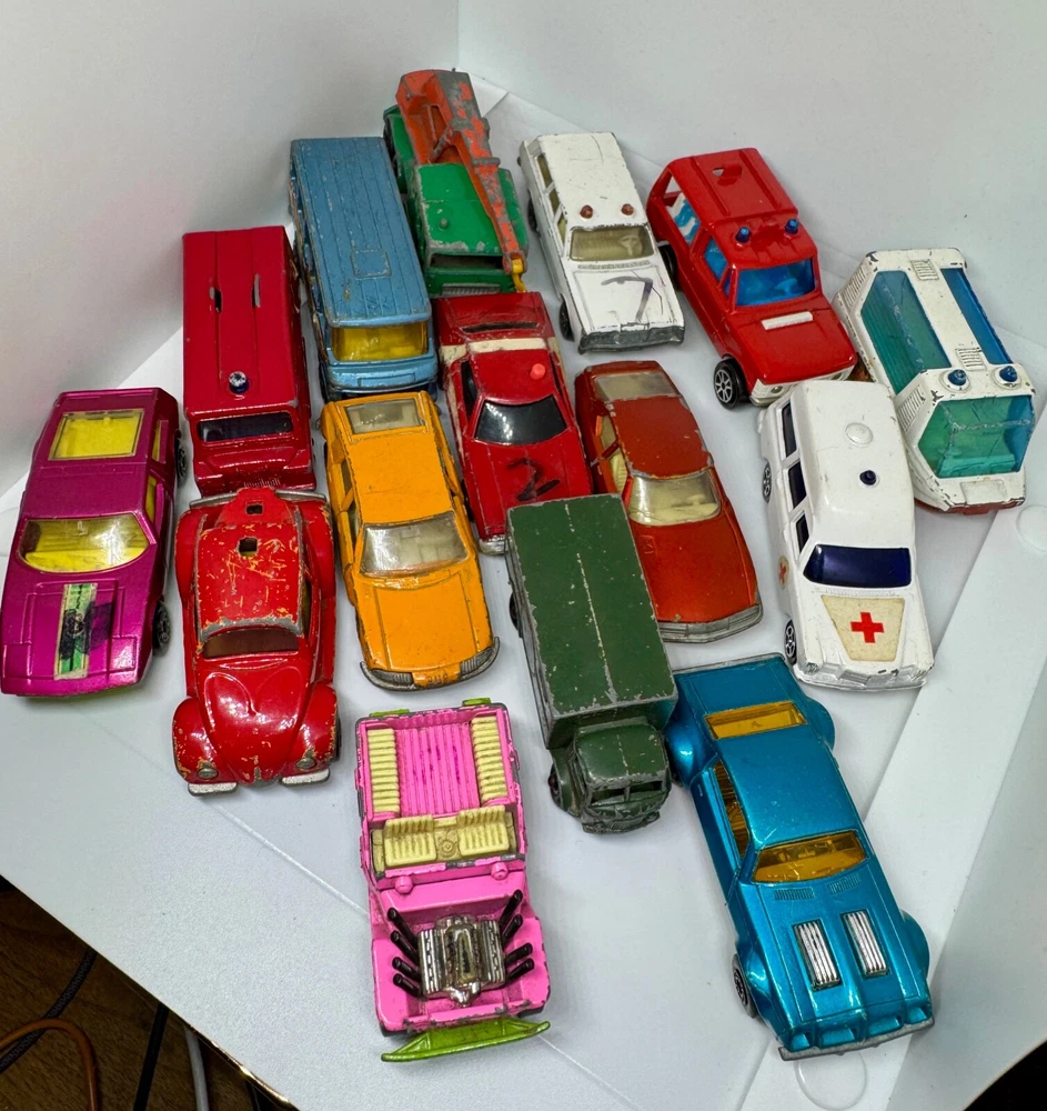 Job Lot Group Vintage Matchbox Lesney Corgi Diecast Metal Model Toy Cars Approximately 30 individual pieces. They come in an original vintage Matchbox Carry Case. This lot comes from a house clearance, and I am selling them as found. They are in various, play-worn conditions, so please expect paint chips, wear, damage, missing parts, etc. Some of them have numbers painted in black on them. The carry case is also well worn and has been taped over the years. They would be great for restoration / parts, etc or for a starter collection. 99p start - no reserve. UK postage will be via Royal Mail Tracked 48.