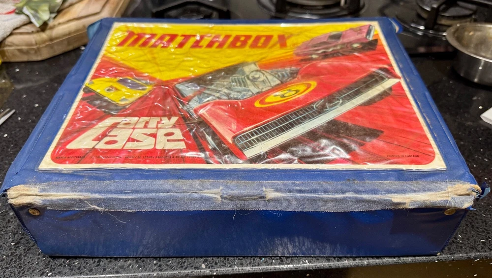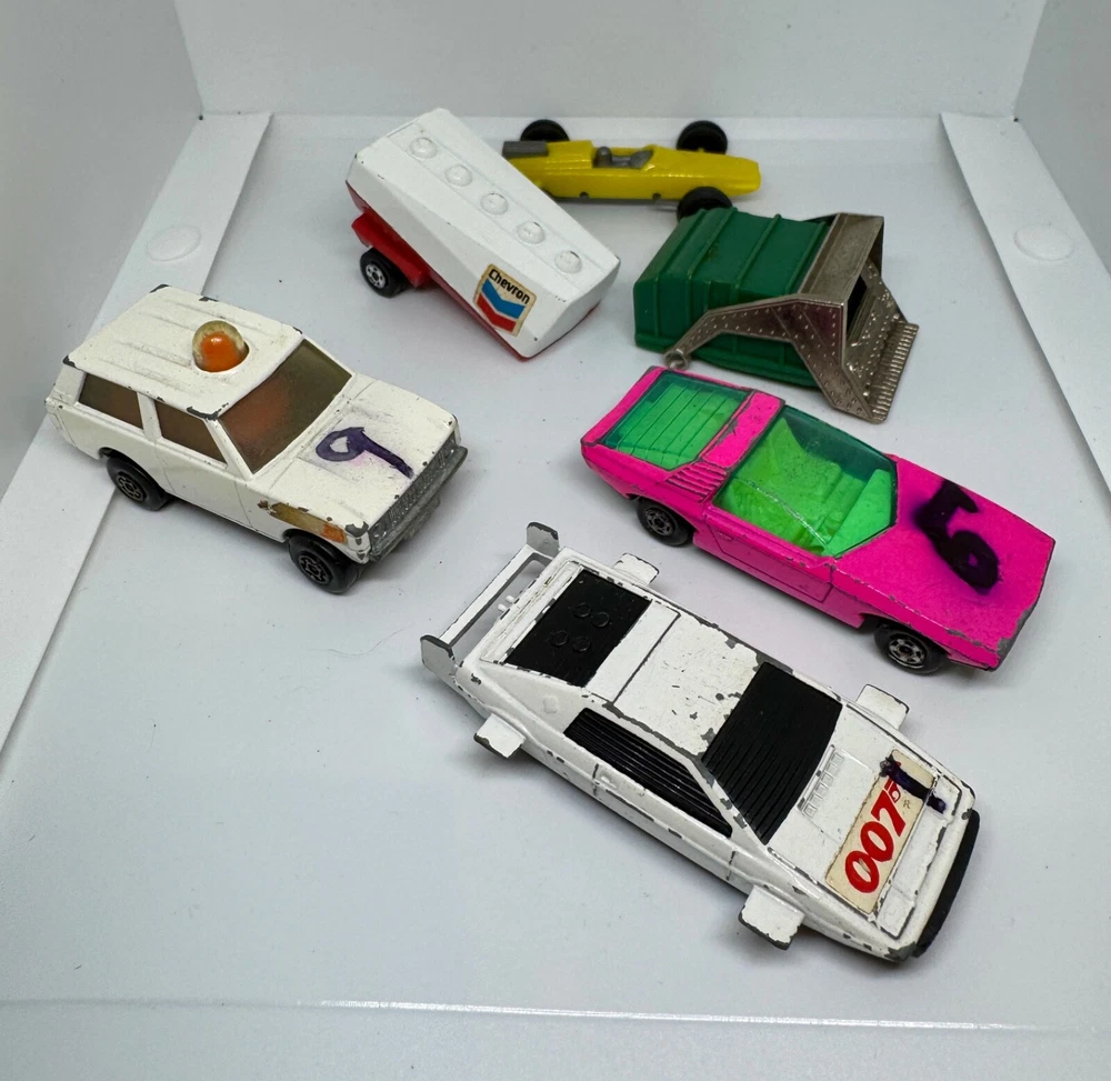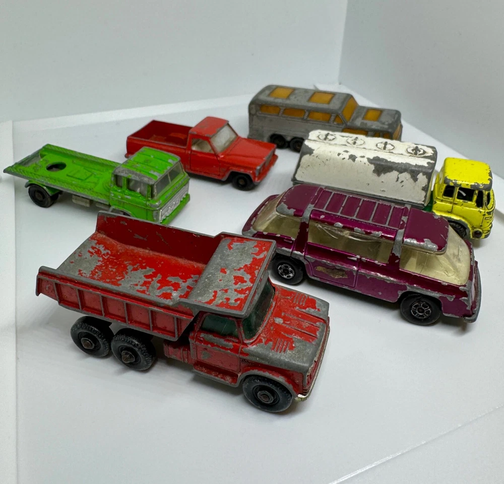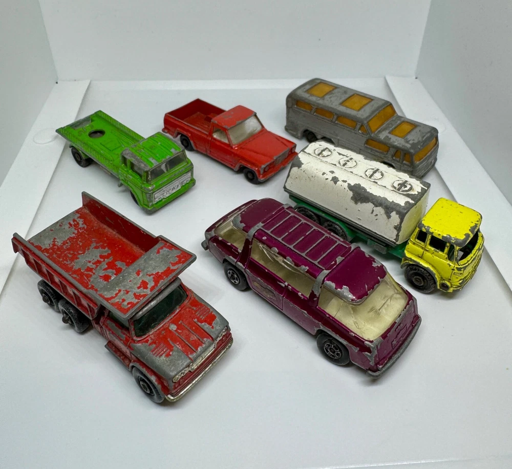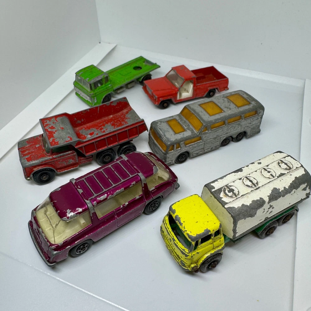 Job Lot Group Vintage Matchbox Lesney Corgi Diecast Metal Model Toy Cars Approximately 30 individual pieces. They come in an original vintage Matchbox Carry Case. This lot comes from a house clearance, and I am selling them as found. They are in various, play-worn conditions, so please expect paint chips, wear, damage, missing parts, etc. Some of them have numbers painted in black on them. The carry case is also well worn and has been taped over the years. They would be great for restoration / parts, etc or for a starter collection. 99p start - no reserve. UK postage will be via Royal Mail Tracked 48.