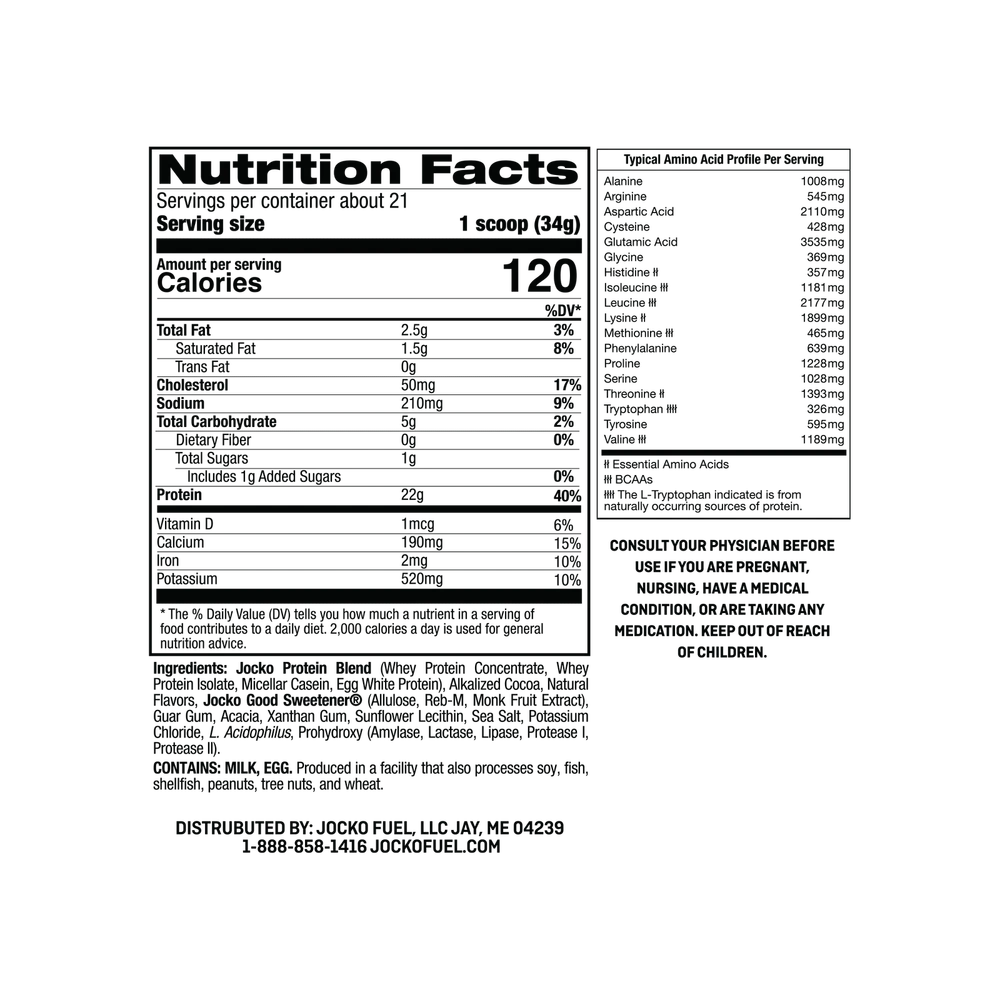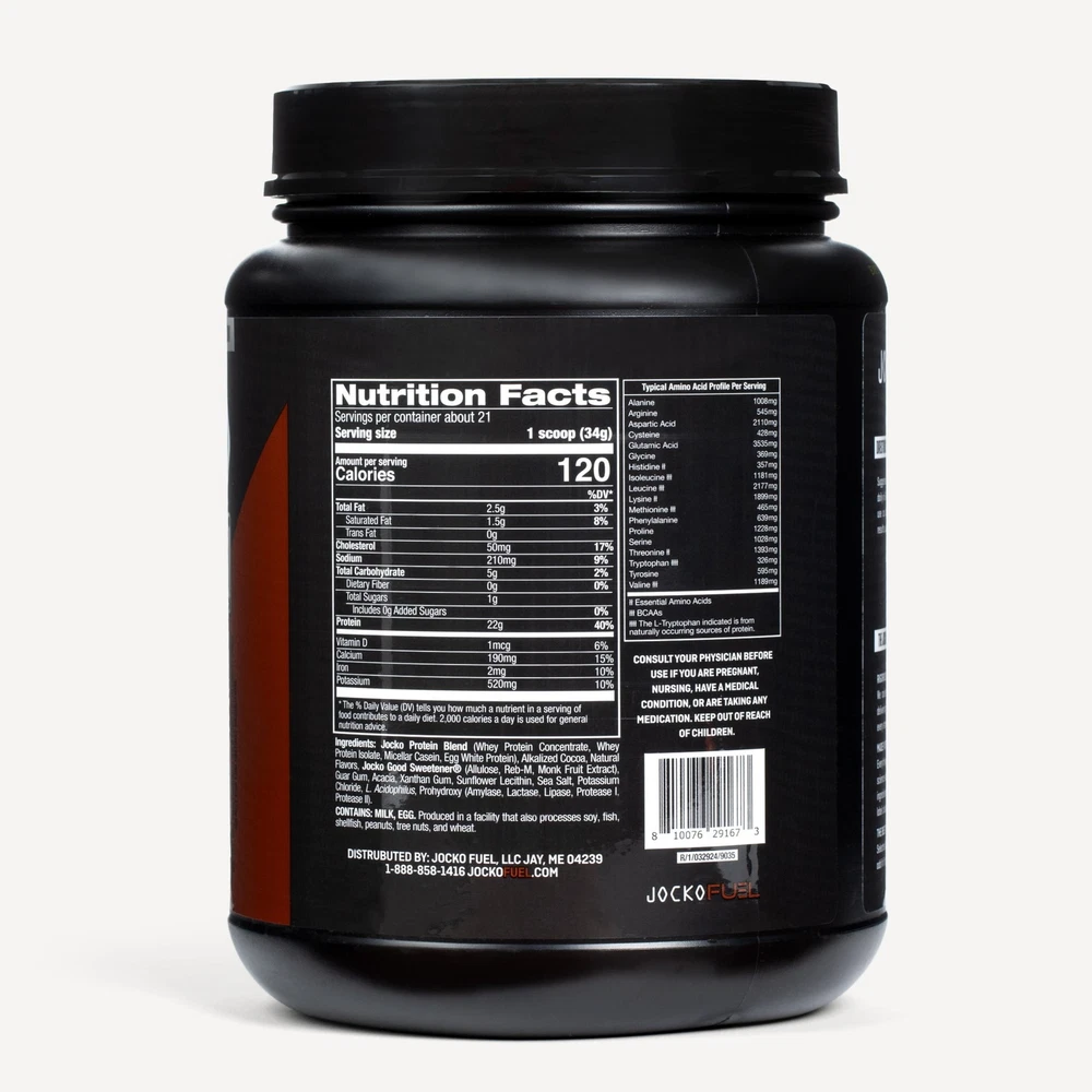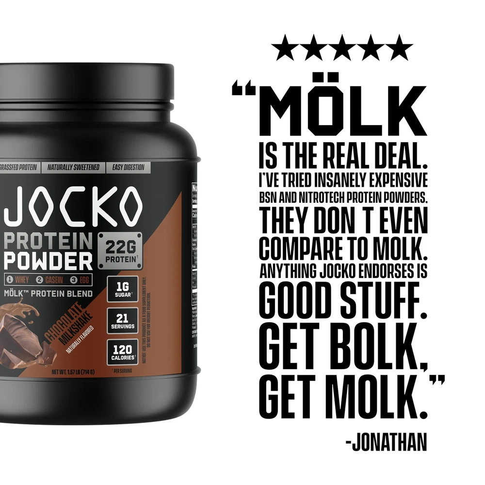 Fuel your fitness journey with Jocko Mölk Whey Protein Powder, meticulously crafted to support muscle recovery and growth. Developed by Navy SEAL and fitness expert Jocko Willink, this premium protein powder is designed to help you achieve your athletic and fitness goals with maximum efficiency and delicious taste. Combining the finest ingredients with cutting-edge formulation, Jocko Mölk provides a comprehensive protein solution that ensures you get the most out of your workouts. Each serving delivers a powerful blend of proteins, promoting sustained amino acid release to aid in muscle repair and development. Whether you're looking to enhance your athletic performance, build muscle mass, or simply incorporate a high-quality protein source into your diet, Jocko Mölk Whey Protein Powder is your perfect partner on the path to peak fitness. The delicious sugar free chocolate flavor transforms your post-workout routine into a delightful experience, making it easier than ever to stay on track with your nutritional goals. Elevate your protein intake with Jocko Mölk and experience unparalleled support for muscle recovery and growth. JOCKO MÖLK: Designed and engineered with a time-release blend of whey concentrate, whey isolate, micellar casein, and egg. This whey isolate protein powder slowly digests in your system and fuels muscle growth and muscle recovery all day long. DIGESTIVE ENZYMES & PROBIOTICS: With added digestive enzymes and probiotics to fuel growth and muscle recovery all day long, Mölk’s complex mix of digestive enzymes and probiotics keeps your gut in check and ensures everything moves smoothly. GRASS-FED PROTEIN, NO HORMONES OR SOY: We’ve developed the best protein powder from four different types of protein: whey concentrate, isolate, casein, and egg. Our whey protein powder comes from happy, grass-fed cows and is soy- and hormone-free. SUGAR FREE CHOCOLATE FLAVOR: Get your protein shake without the unwanted sugar. Mölk is sweetened with monk fruit only. It has no added sugar, no artificial sweeteners, and no added flavors. AMINO ACIDS: Blended with a plethora of amino acids, the building blocks of protein, these necessary components help your body with building muscle and regulating immune function. Check out the amino acid profile on the bottle! The Jocko Fuel Standards: - No fillers - No vanity ingredients - No banned substances - Responsibly Sourced - Transparent Label - Natural Sweeteners / No Artificial Sweeteners - Third-Party Tested Supplements Muscle Health, Strength & Recovery