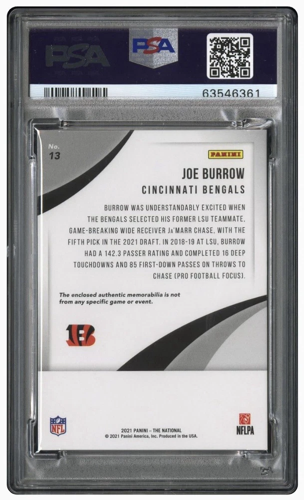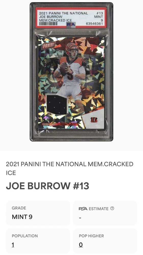 Joe Burrow 2021 Panini The National Memorial Cracked Ice Quad Number Match. Numbered 9/9 PSA 9 Joe Burrow number 9.