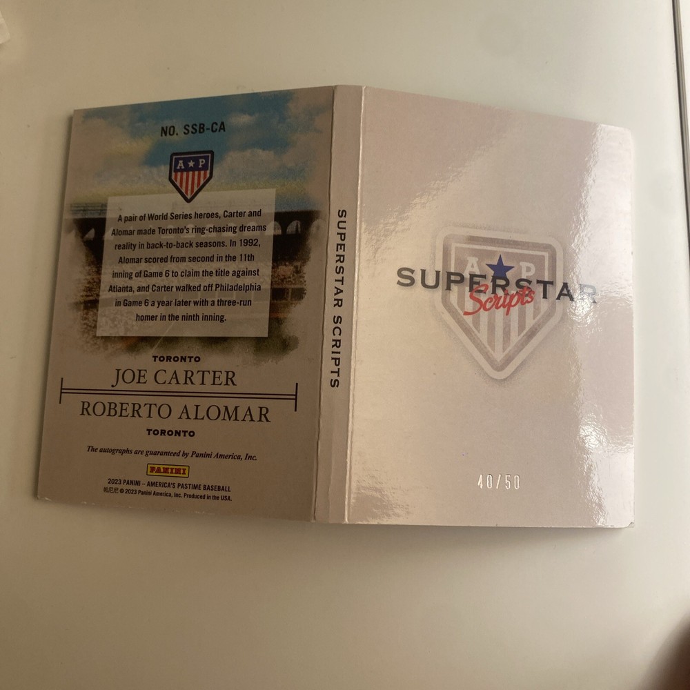 Discover a treasure for baseball memorabilia collectors with the Joe Carter Roberto Alomar 2024 Boys of Summer Dual On Card Booklet Auto /50. This limited edition sports trading card features two of baseball's cherished legends, captured in a sleek booklet format that showcases their greatness on the field. With only 50 of these dual-autograph booklets in existence, this piece is a must-have for fans and collectors alike. The card bears the authentic signatures of both Joe Carter and Roberto Alomar, making it a standout addition to any collection. It's a unique piece of baseball history that celebrates the legacy of these iconic players.🔥🔥🔥