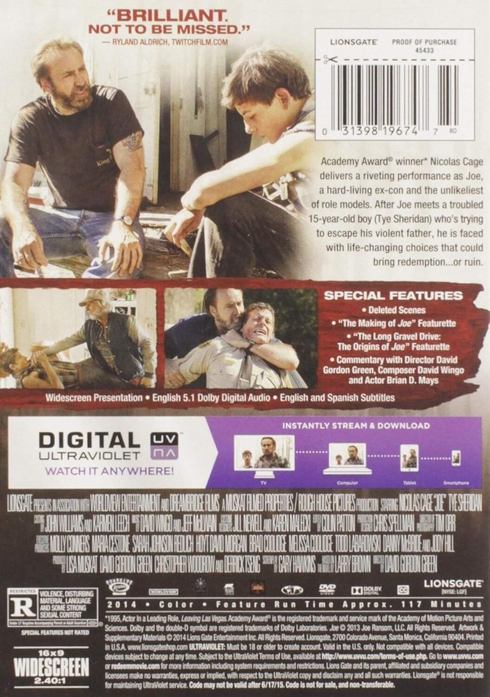Further Details Title: Joe Format: DVD Condition: New Number Of Discs: 1 Actors: Nicolas Cage, Tye Sheridan, Ronnie Blevins, Heather Kafka, Sue Rock Director: David Green Audio Language: English Runtime: 1 hour and 57 minutes Region Code: DVD: 1 (US, Canada...) Studio: Lionsgate Subtitle Language: English, Spanish Certificate: MPAA R Description: A gripping mix of friendship, violence and redemption erupts in the contemporary South in this adaptation of Larry Brown's novel, celebrated at once for its grit and its deeply moving core. Directed by David Gordon Green (PRINCE AVALANCHE, PINEAPPLE EXPRESS, UNDERTOW, ALL THE REAL GIRLS), the film brings Academy Award winner Nicolas Cage back to his indie roots in the title role as the hard- living, hot-tempered, ex-con Joe Ransom, who is just trying to dodge his instincts for trouble -- until he meets a hard-luck kid, (Tye Sheridan) (MUD, TREE OF LIFE) who awakens in him a fierce and tender-hearted protector. The story begins as Joe hires teenaged Gary Jones and his destitute father onto his 'tree- poisoning' crew for a lumber company. Joe might be notoriously reckless with his pick-up, his dog and especially with women, but he sees something in Gary that gets to him: a determination, a raw decency and a sense of resilience he can barely believe in anymore. Gary has truly had nothing DVDs ARE REGION 1 UNLESS OTHERWISE STATED Missing Information? Please contact us if any details are missing and where possible we will add the information to our listing.