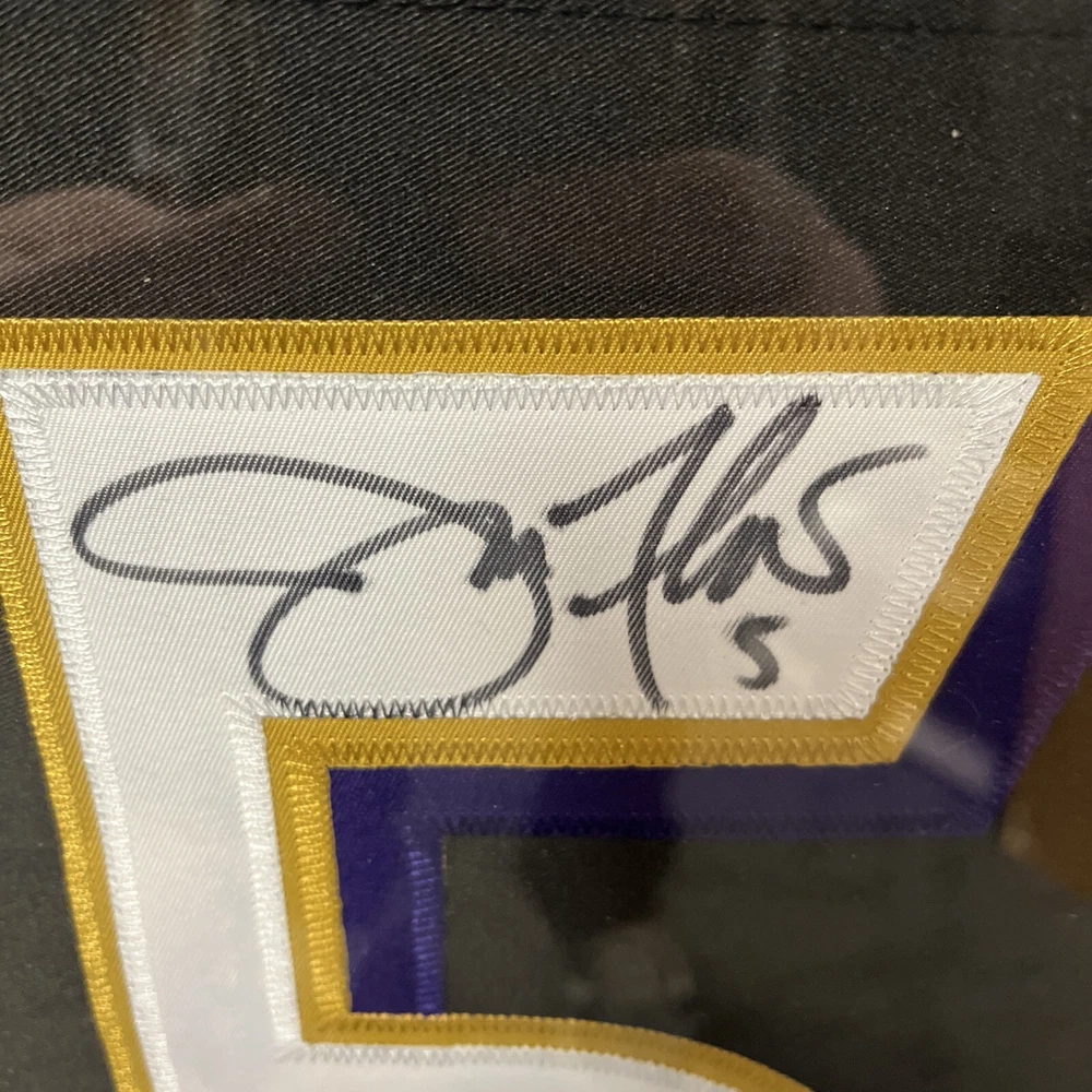 We're offering this Joe Flacco Autographed Baltimore Ravens Jersey. It's beautifully matted and framed along with multiple photo's as well as a Ravens Patch. It comes with a Hologram issued by JSA Authentication ( W460941 ) and his signature is guaranteed to be 100% authentic. We will combine on shipping for similar items! The entire frame measures approx. 34"x42".