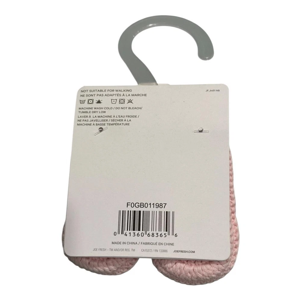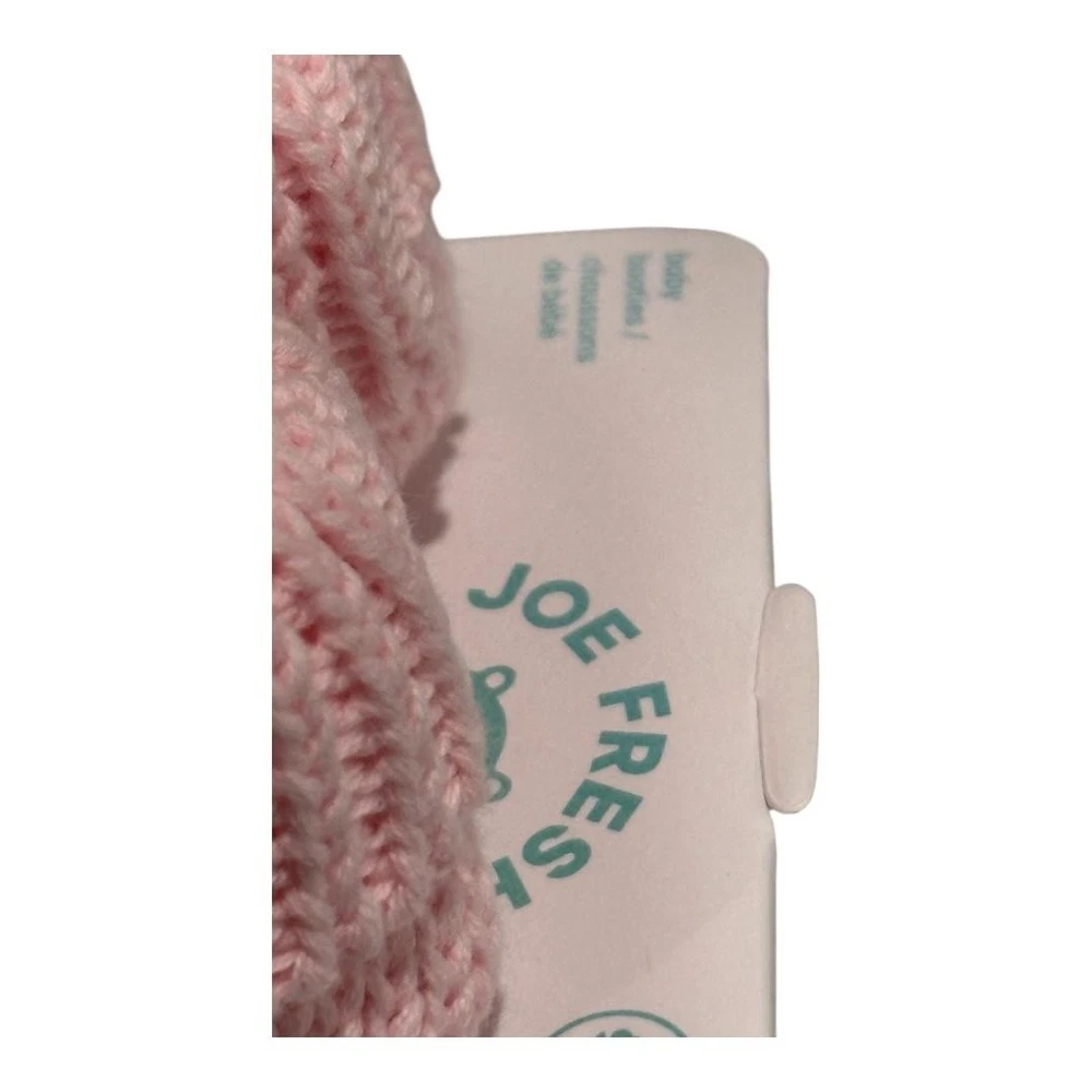 Brand: Joe Fresh Style: Baby slipper booties with soft knit construction, ribbed foldover cuffs, and cozy crib-friendly design. Color: Light pink solid knit; Department: Girls; Size: 0-3 months. Materials: Fabric upper with knit texture, fabric lining and insole, soft fabric outsole; not suitable for walking; machine wash cold and tumble dry low per tag. Made in China; Style/Model code: F0GB011987; UPC: 041360683656.