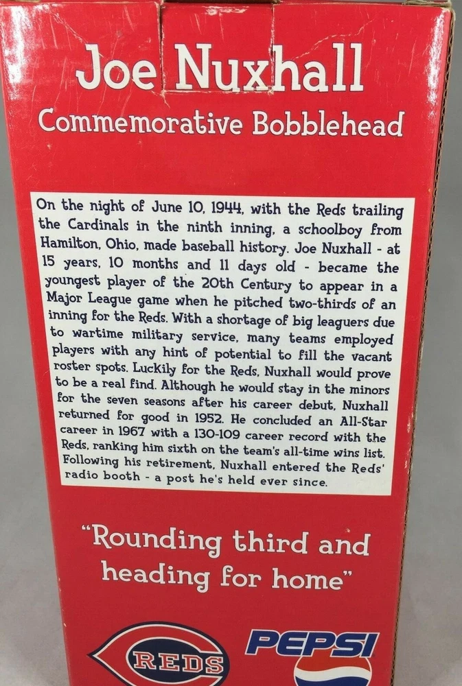 Joe Nuxhall Cincinnati Reds Baseball Bobblehead 2004 The OL' Lefthander Limited NEVER DISPLAYED JOE NUXHALL BOBBLEHEAD FROM 2004 GREAT REDS PITCHER AND BROADCASTER WITH THE HALL OF FAMER MARTY BRENNAMAN THIS BOBBLE HEAD BROUGHT BACK INSTANT MEMORIES OF LISTENING TO JOE CALL THE GAMES JOE WAS ONLY 15 WHEN HE PITCHED FOR THE REDS IN 1944 THE YOUNGEST MLB PLAYER OF ALL TIME LIMITED EDITION EXCELLENT CONDITION NO SIGNS OF ISSUES THE BOX AND STYROFOAM CONTAINER IS ALSO IN VERY GOOD SHAPE ✨✨✨✨✨✨✨✨✨✨✨ The VinKris Collection is committed to delivering a great experience! We will ship to you with the greatest of care All items are shipped in sturdy boxes We use packing materials appropriate for the product to help ensure safe delivery Shipments to the United States and Protectorates are handled via USPS International shipments will ship via Ebay's International Shipping Program All packages are shipped within 1 business day of payment We ship daily Monday through Saturday Worry free purchases, we stand behind everything we sell with free 30 day returns We have thousands of happy customers and our goal is 100% customer satisfaction We are happy to answer any questions