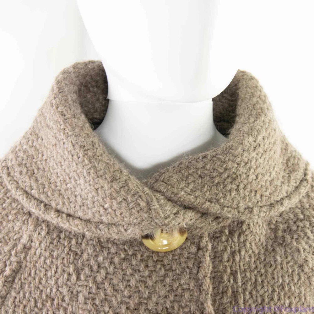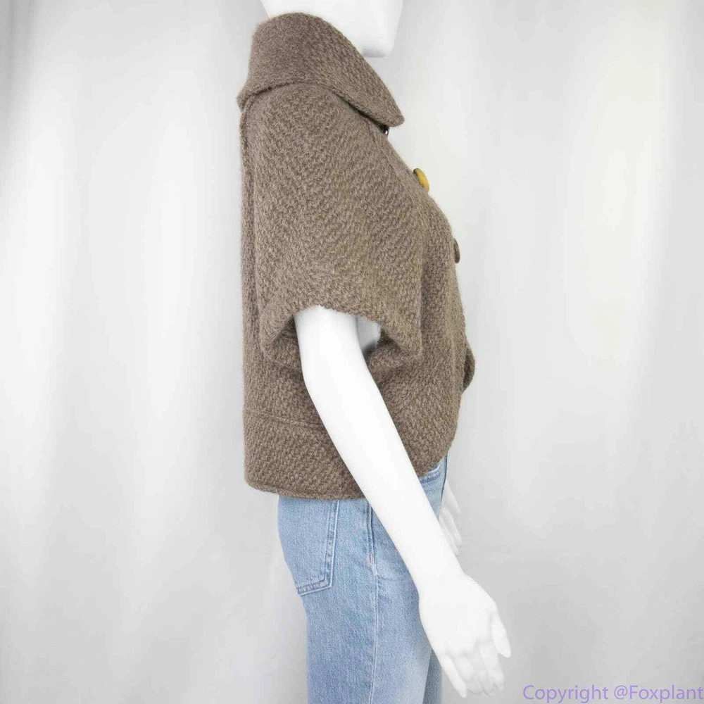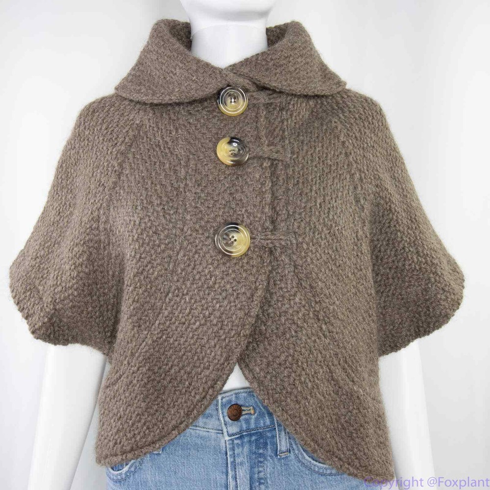Women's Wool Alpaca button front short sleeves cardigan by John Branigan Branigan weavers Wool Alpaca Big retro button Curvy design front Poncho style Round collar Made in Ireland Materials: 85% Wool, 15% alpaca One size. Please check approx. laid flat measurements before purchasing: Back length from high point of shoulder down: 20 1/2'' Excellent condition. No noticeable flaws or stains or damages.