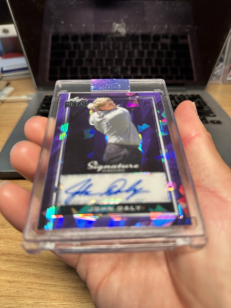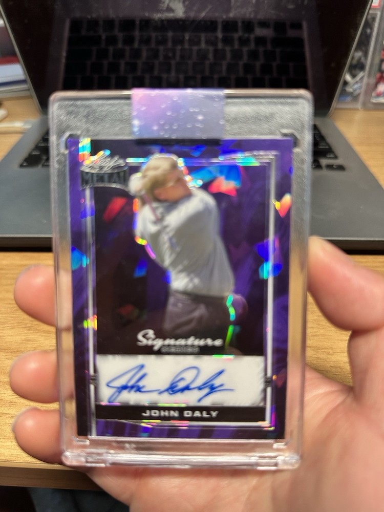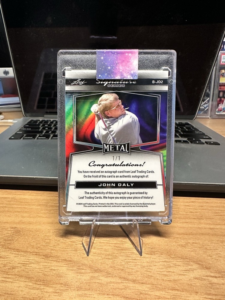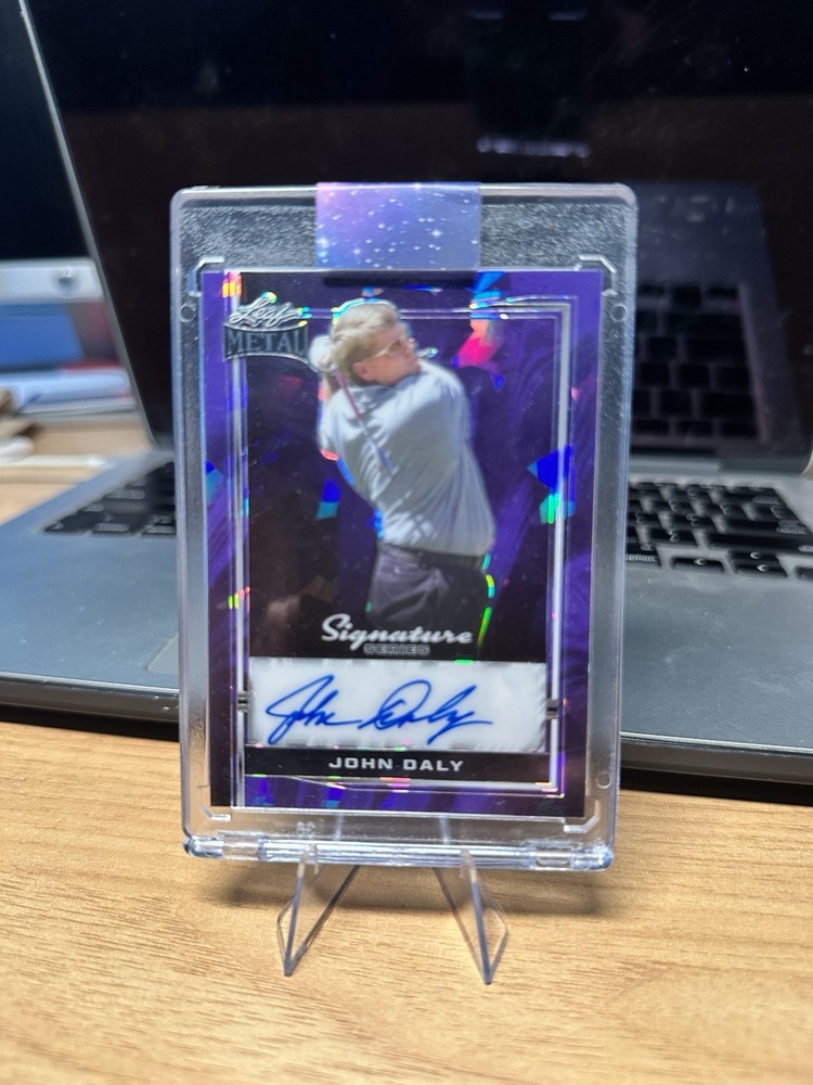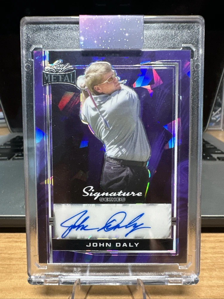 John Daly autographed 1/1 Leaf Metal Signature Original autograph from PGA Tour golf legend John Daly. Coolest card you will ever own. The card is made of durable metal material and comes with authentication from Leaf, ensuring its authenticity and rarity. With only ONE in existence, this one-of-a-kind card is a prized possession for collectors looking to own a piece of golf history.