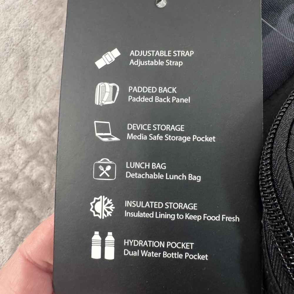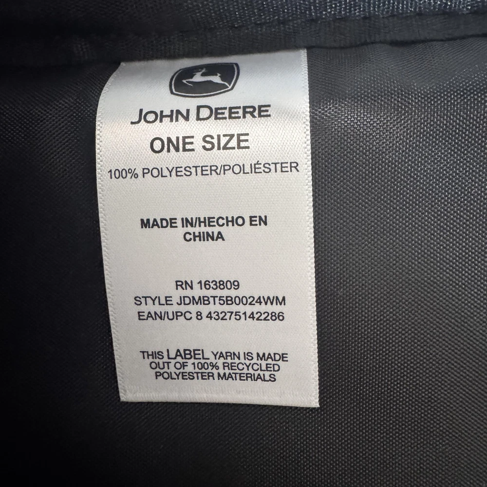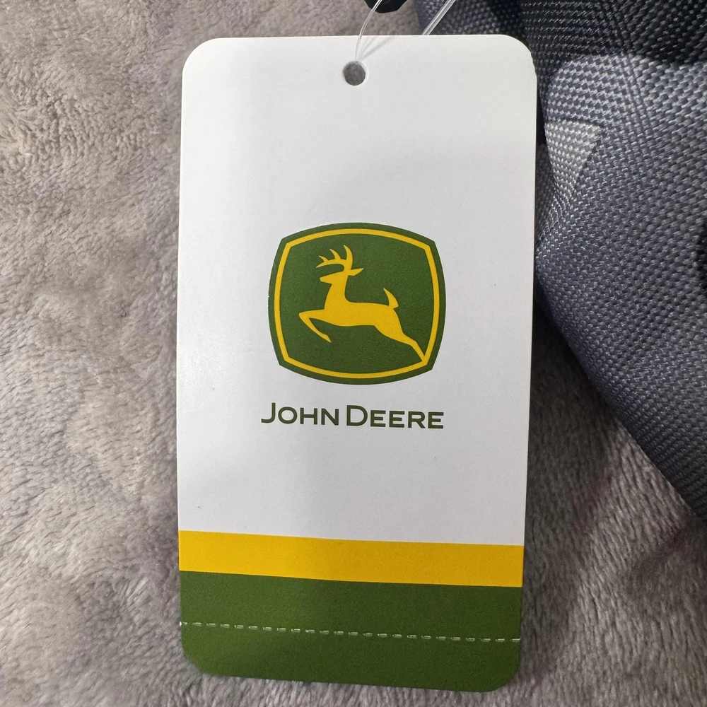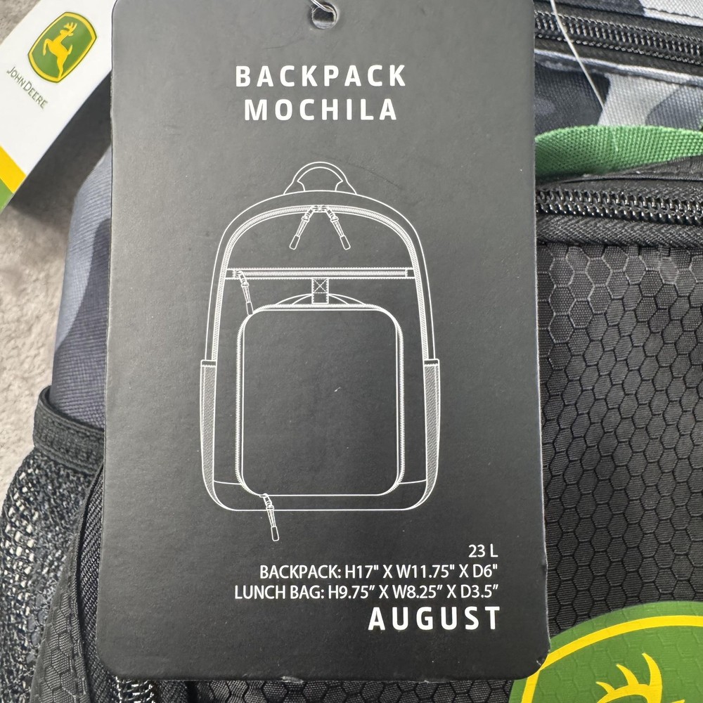 Brand: John Deere Style: August backpack and detachable lunch bag set in a black and gray camo pattern with black front pocket and green/yellow John Deere logo accents. Color: Black camo with green trim and yellow logo details. Size on tag: One Size; capacity 23 L. Materials: 100% polyester shell; label yarn made from 100% recycled polyester materials. Style/Model code: JDMBT5B0024WM; RN 163809. UPC: 843275142286. Details: Adjustable shoulder straps, padded back panel, top carry handle, dual mesh side water bottle pockets, large main compartment with padded media/laptop storage sleeve, front zip pocket, and matching detachable lunch bag that mounts on the front of the backpack. Lunch bag features: Insulated lining to help keep food fresh, front John Deere logo, zip closure, and top handle. Actual Measurements (printed on hang tag): Backpack H17 x W11.75 x D6 inches; lunch bag H9.75 x W8.25 x D3.5 inches.