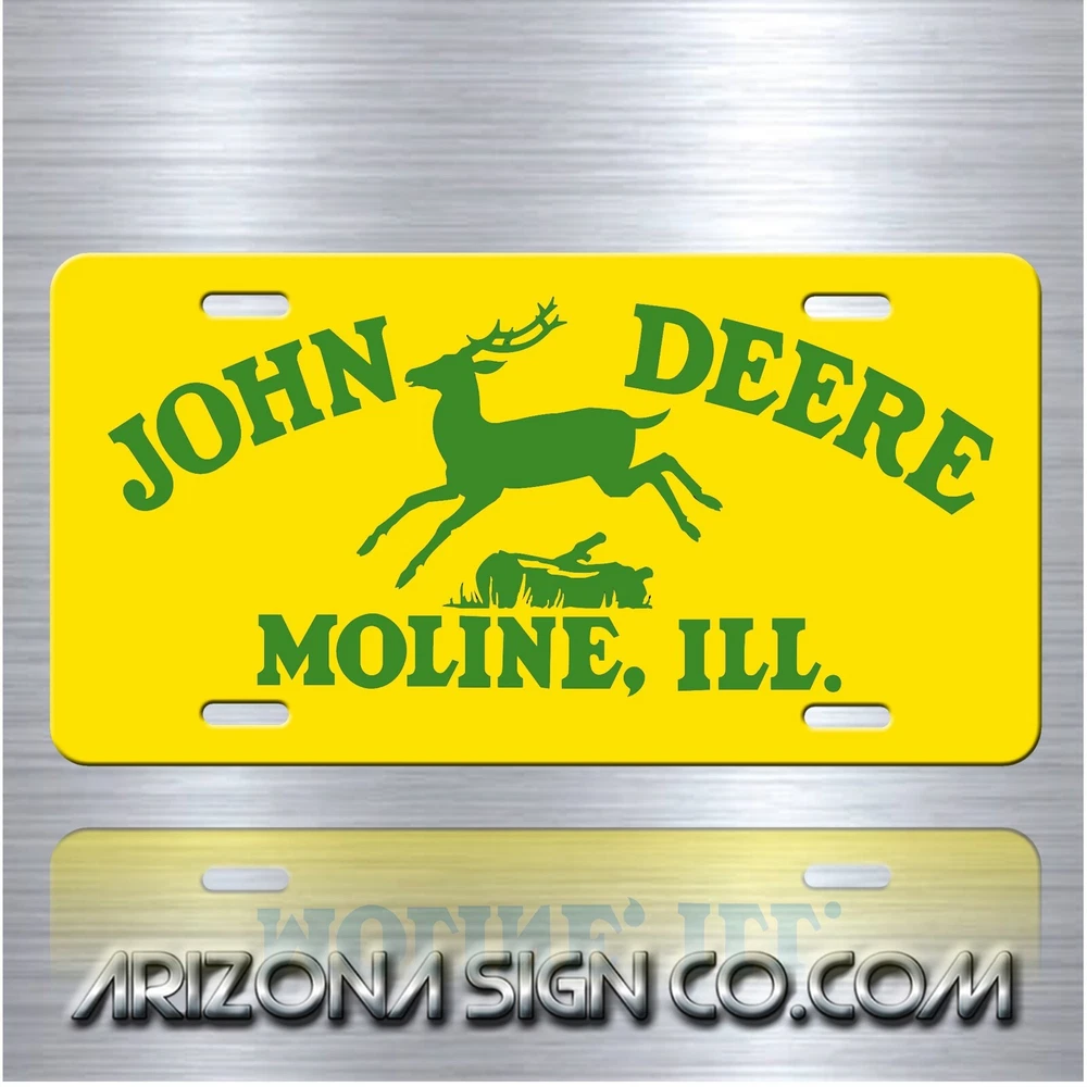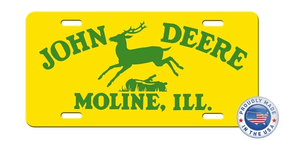 This license plate/ sign is painted on a sturdy .32 gauge aluminum blank . There is no actual emblem or chrome used, nor is it actual brushed aluminum or bare steel. What you see is simulated to look like what you see in the listing photo. Any questions please ask. Thank you. 0 John Deere inspired Art on Yellow and GreenVanity Aluminum License Plate Tag New Please read the entire listing description BEFORE purchasing: These are NOT embossed or textured or raised in any way. They are smooth, glossy and maintenance free. Features: Our High-Quality License Plates Are Sturdy and Constructed of Super Durable 32-gauge Aluminum with a baked-on clear gloss finish Designed to Hold Up to the Elements So Your License Plate Will Last for the Long Haul. Universal Fit for All Cars and Trucks. Approximate Dimensions Are 12"X6". Plate Is Secured In Place Via Fasteners On Top and or Bottom with the standard screws/bolts that hold a license plate to your car (Not Included). Makes A Great Gift: Ideal Gift for Family or Friend That has Everything. SATISFACTION GUARANTEED: Our friendly, knowledgeable staff is here to help, and customer satisfaction is our top priority! If you have any issues with your order or you’re not happy for any reason, just let us know and we’ll be there to help! PROUDLY MADE IN THE USA: Buy with confidence from an American owned and operated company! NuggetWorld Products are produced in our state-of-the-art facility in Chandler, Arizona, proudly made in the U.S.A.! Thank you for considering my items! Any questions please feel free to message me. I will respond within minutes This aluminum license plate tag features an art style inspired by John Deere. It's a great addition for any fan of the brand or collector of television and entertainment memorabilia. Made in the United States, this vanity plate is a unique piece that can be displayed proudly.