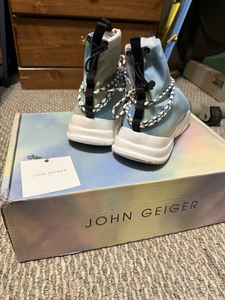 This John Geiger 002 Coachella sneaker in size 11 is a pre-owned athletic shoe for men. In great condition with box. Worn once! It features a unique tie dye design that was individual to each sneaker set when released. Low quantity of this shoe produced! Great material and adds a rare piece to any collector’s closet.