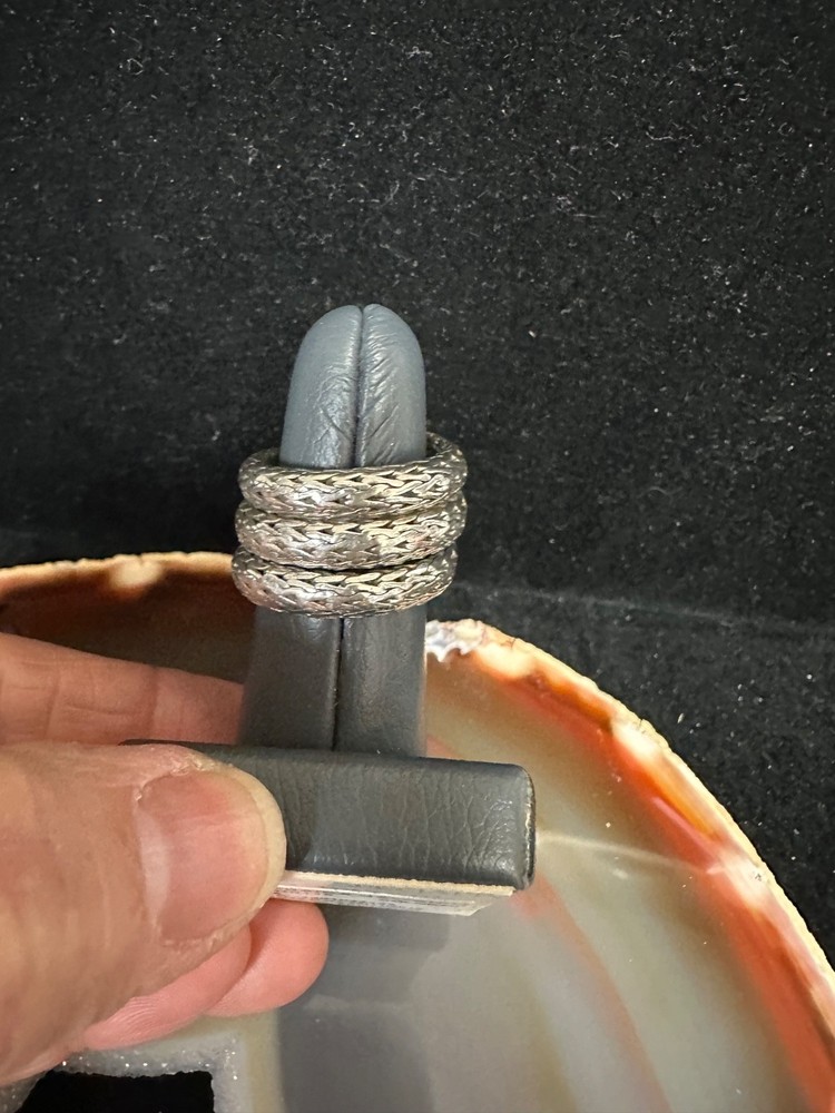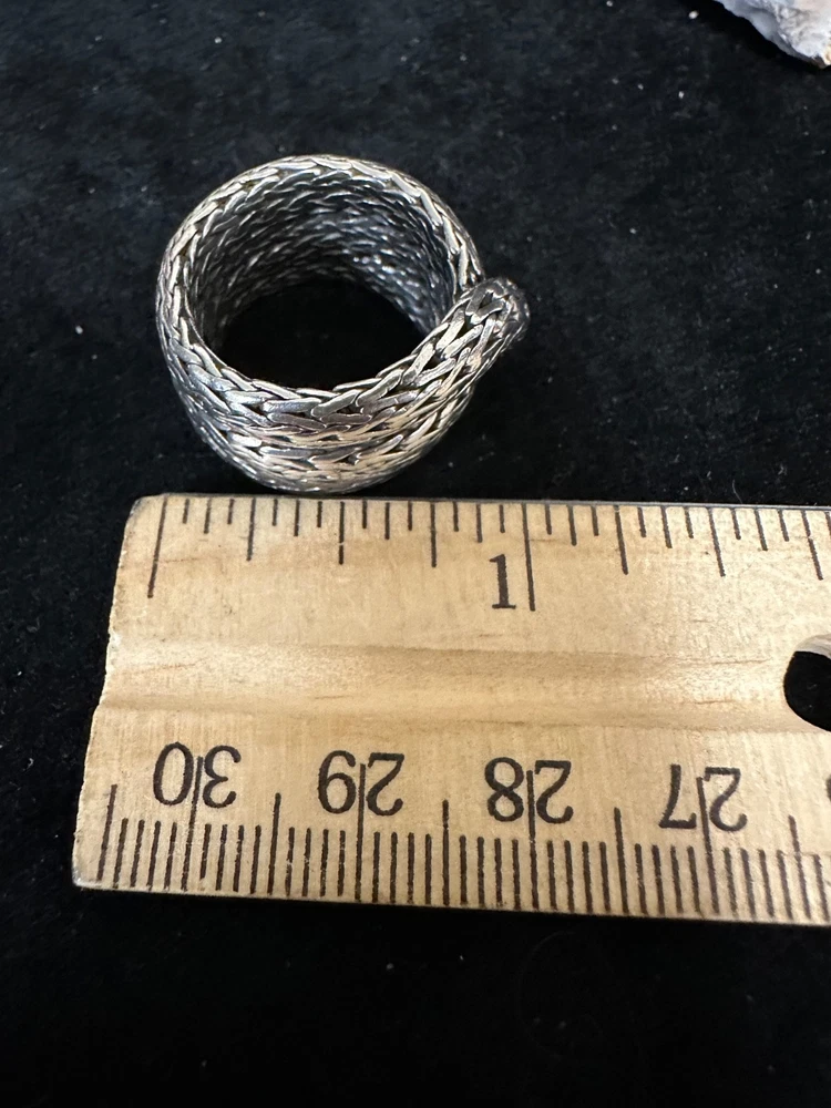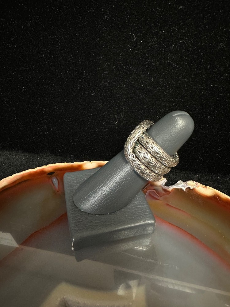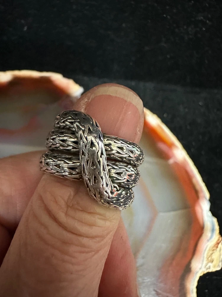 JOHN HARDY STERLING SILVER THREE ROW BAND IN EXCELLENT PRE OWNED CONDITION. THIS BEAUTY HUGS THE FINGER. PLEASE NOTE THE WIDTH, SEE PHOTO.