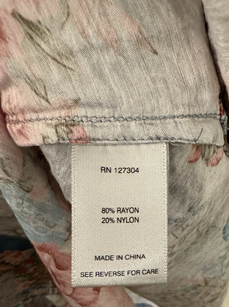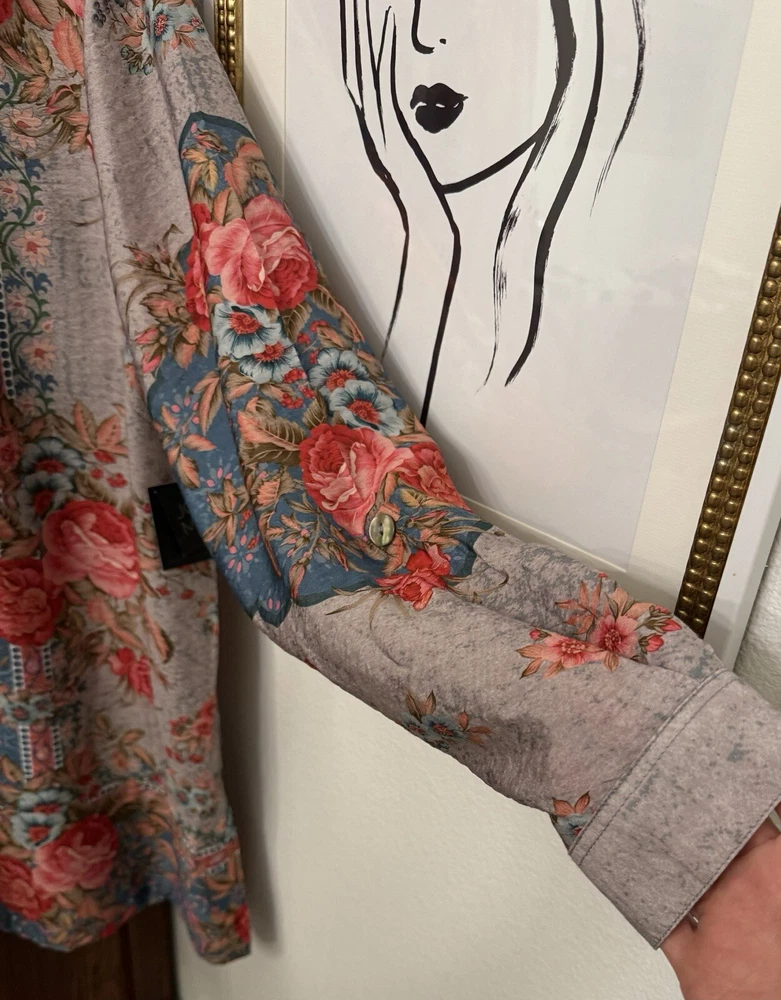 This chic John Mark Women's Floral scarf print with Roll-Tab Long Sleeve Sheer Tunic is versatile allowing for effortless pairing with your favorite jeans or leggings, making it a go-to for laid-back yet stylish look. With its roll-tab sleeves and sheer viscose material, this tunic blends comfort with a touch of elegance. Crafted to fit beautifully in a size small, the tunic features a classic button closure that adds a timeless touch to its contemporary style. From John Mark, this top features: floral scarf print point collar neckline Long roll tab sleeves center front button closure approx. 32-32.5" length rayon/nylon machine wash/tumble dry Measurements: Back Length 32.5 " (from top seam under the collar to bottom of hem); Width: 23" (from armpit to armpit); Sleeve 26" (from shoulder seam to end of cuff) Color: We photograph items as accurately as possible; however, colors may vary depending on your monitor and the lighting.