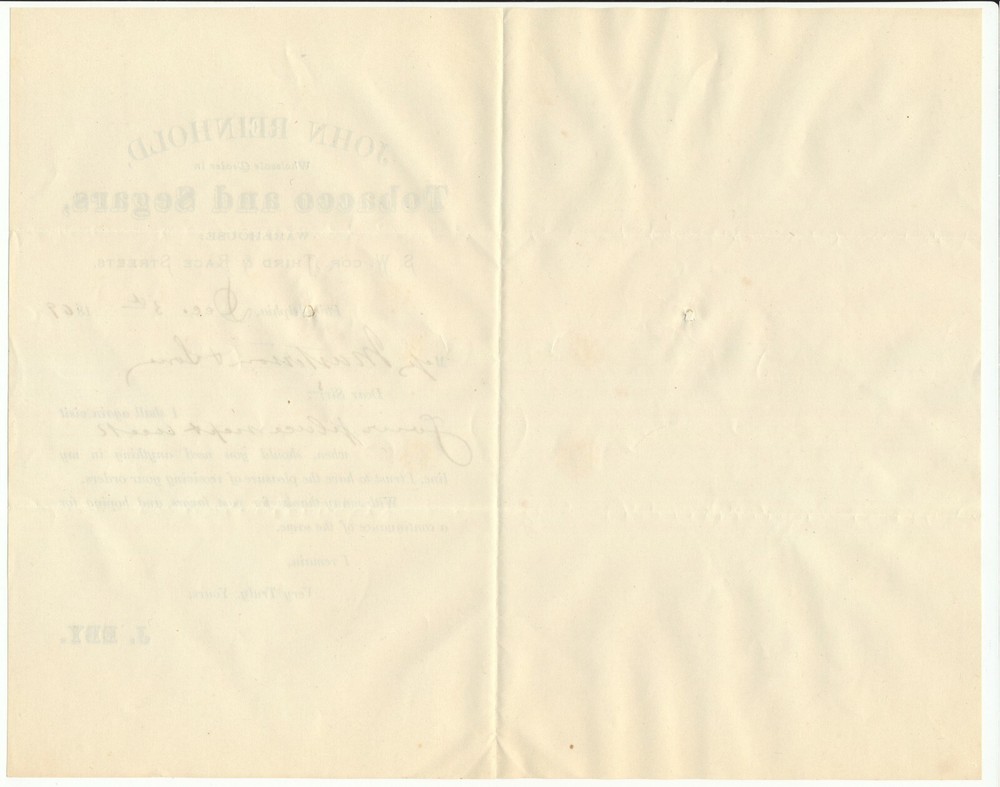 John Reinhold, Wholesale Dealer in Tobacco and Segars. Southwest corner Third Street & Race Street, Philadelphia, Pennsylvania. 1869-12-03. 1 sheet (10 × 8 in, unfolded).