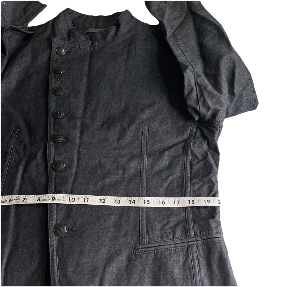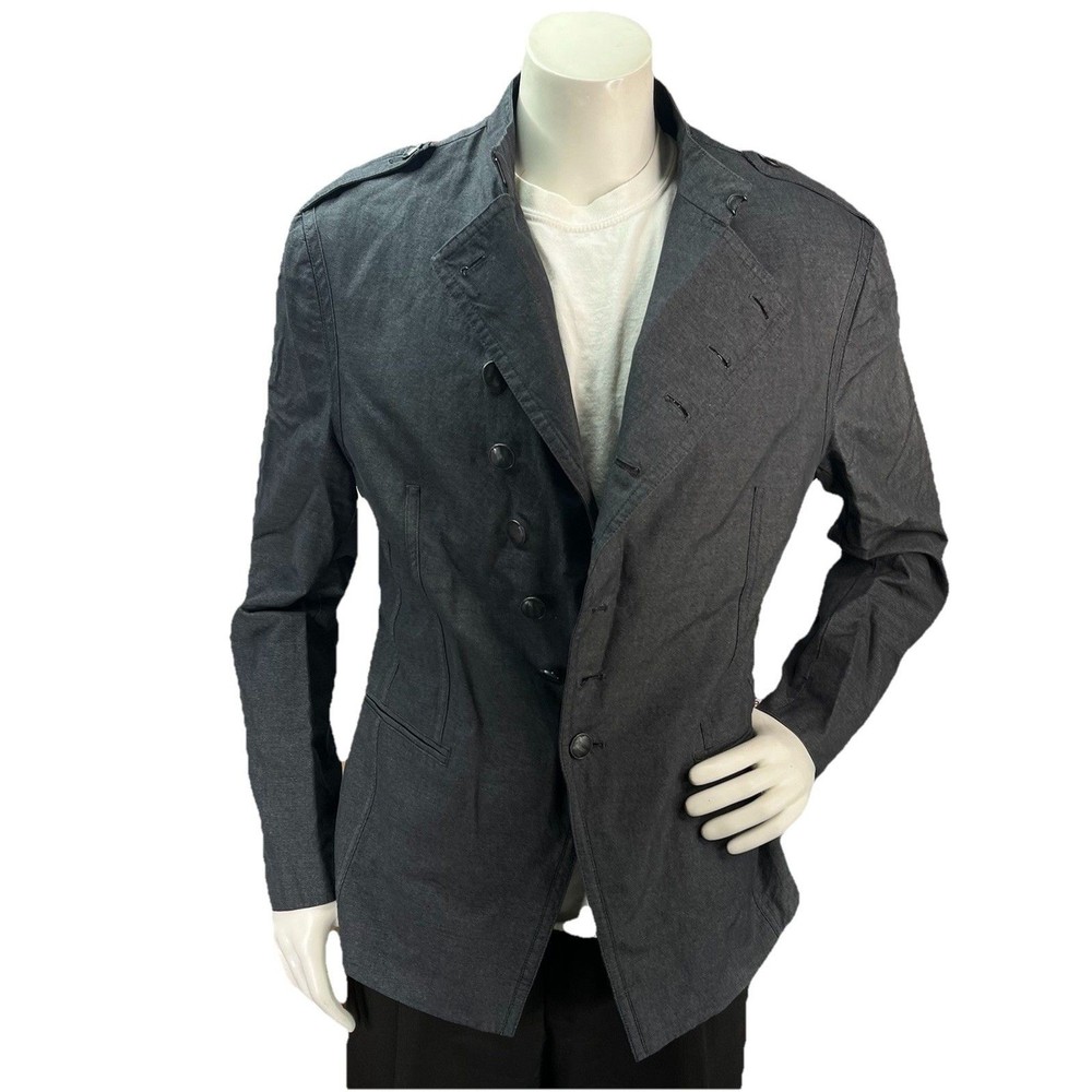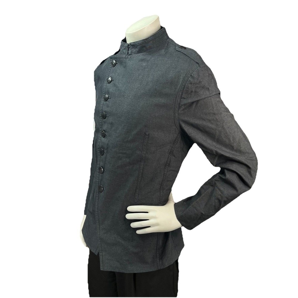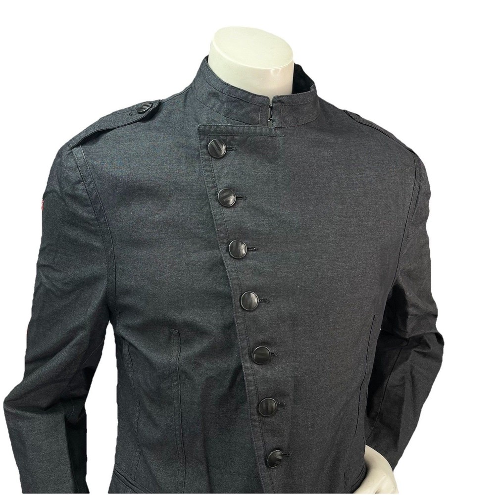 The John Varvatos Men's Asymmetrical Military Jacket in size 42 is a stylish and versatile piece perfect for a casual occasion. Made with a solid cotton outer shell in a sleek gray color, this jacket features a button closure, stand-up collar, and a military-inspired design. Crafted in Italy, this jacket showcases a unique half-lined fler de lis pattern and embodies themes of USA, biker, and motorcycle culture. Ideal for the modern man looking for a regular fit with a touch of edgy style, this jacket from John Varvatos is a standout addition to any wardrobe.