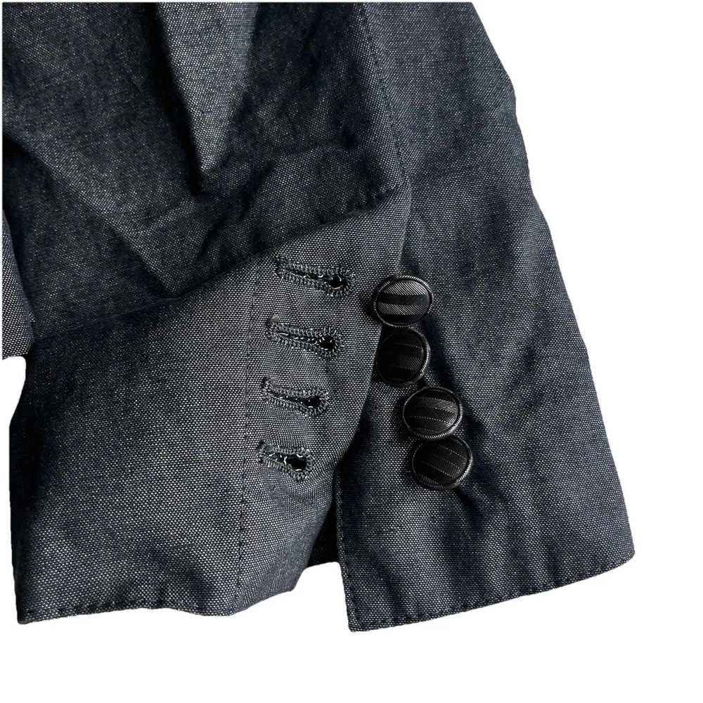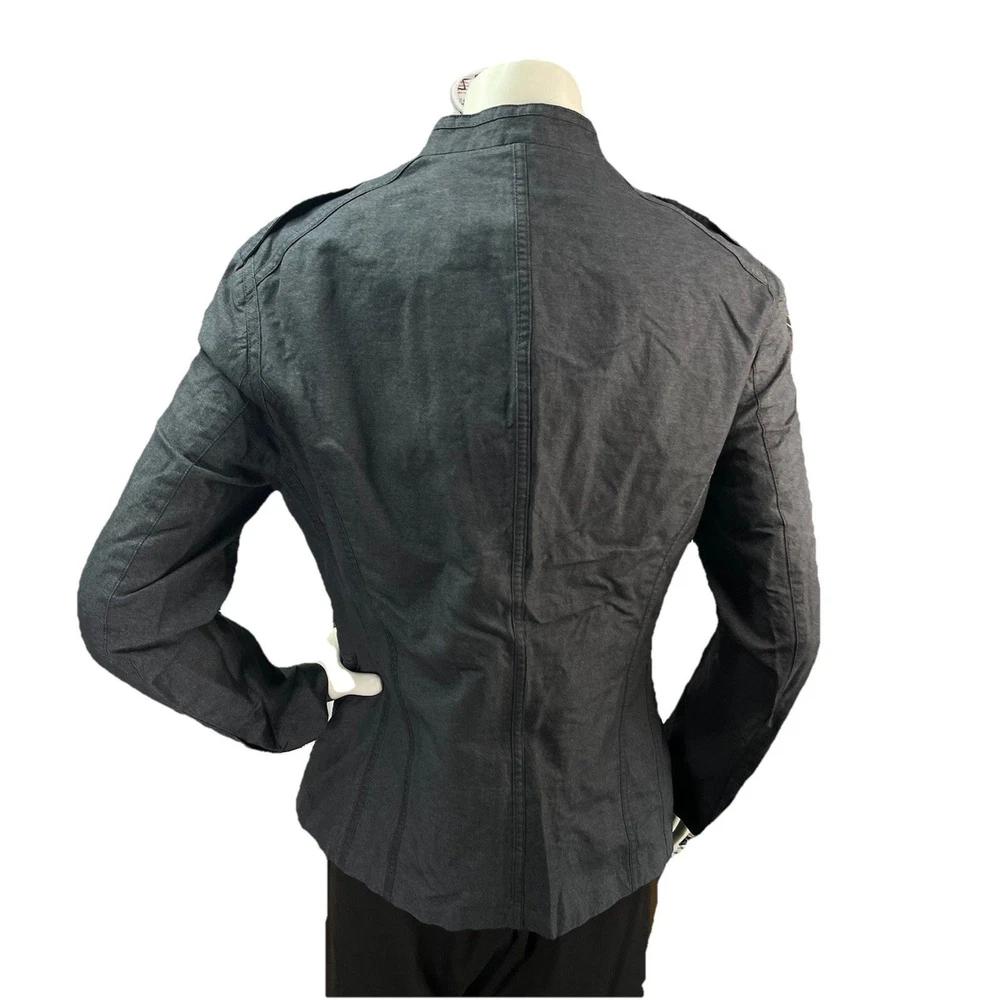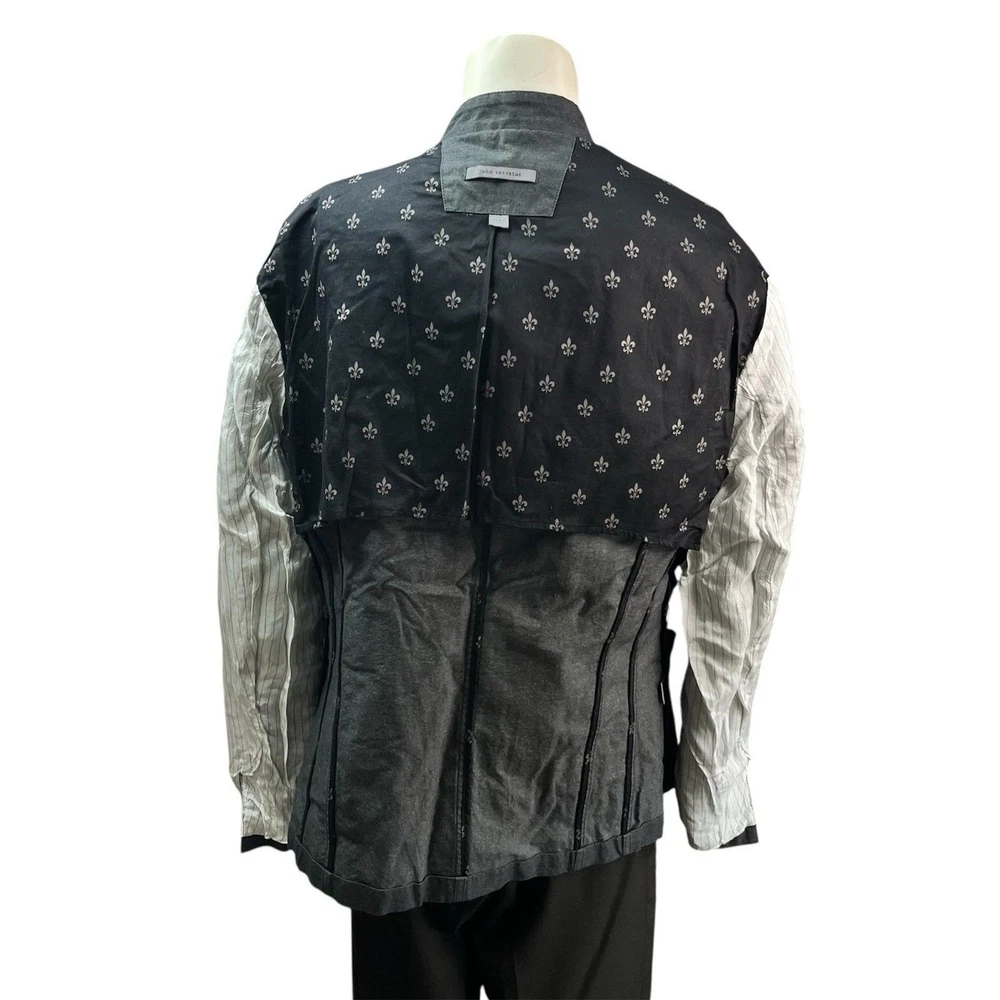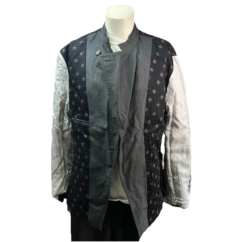 The John Varvatos Men's Asymmetrical Military Jacket in size 42 is a stylish and versatile piece perfect for a casual occasion. Made with a solid cotton outer shell in a sleek gray color, this jacket features a button closure, stand-up collar, and a military-inspired design. Crafted in Italy, this jacket showcases a unique half-lined fler de lis pattern and embodies themes of USA, biker, and motorcycle culture. Ideal for the modern man looking for a regular fit with a touch of edgy style, this jacket from John Varvatos is a standout addition to any wardrobe.