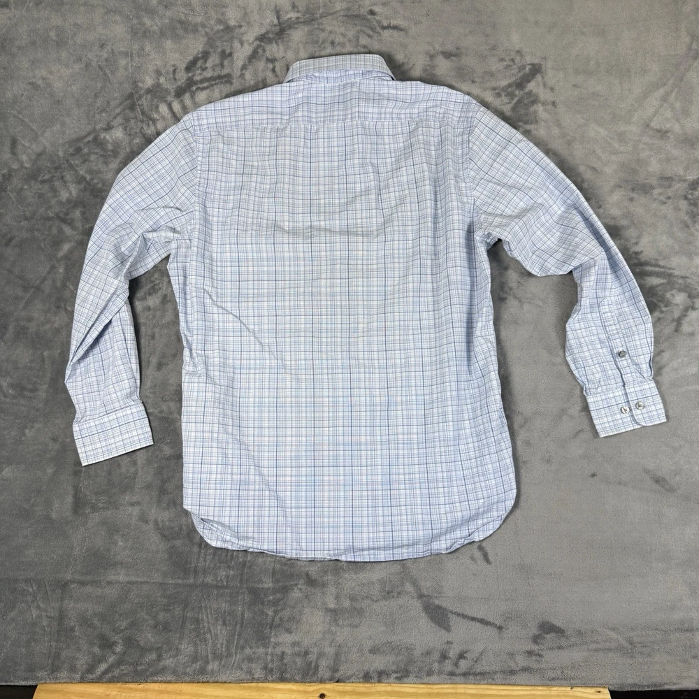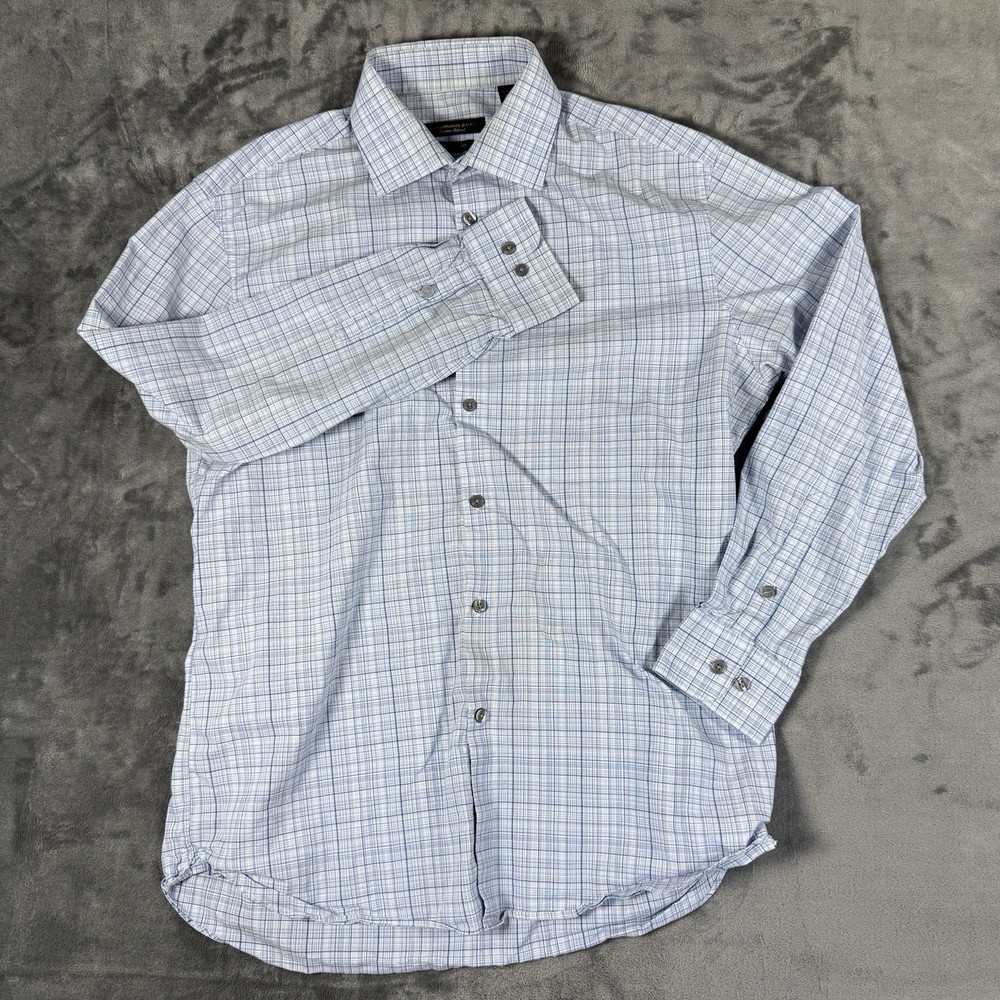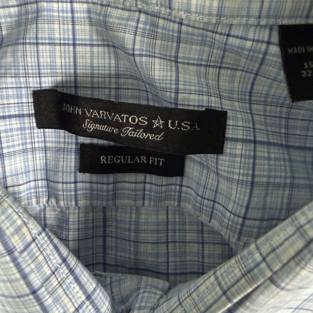 The John Varvatos USA Signature Tailored Regular Fit Dress Shirt in Blue Plaid is a classic and versatile piece suitable for casual and business occasions. Made from cotton with a woven fabric type, this shirt features a collared neckline, button closure, and long sleeves with a barrel cuff style. The shirt is adorned with accents such as buttons and the John Varvatos USA logo, adding a touch of sophistication to the overall look. With a chest size of 24 inches and a neck size of 15.5 inches, this dress shirt is designed for a regular fit and is suitable for all seasons.