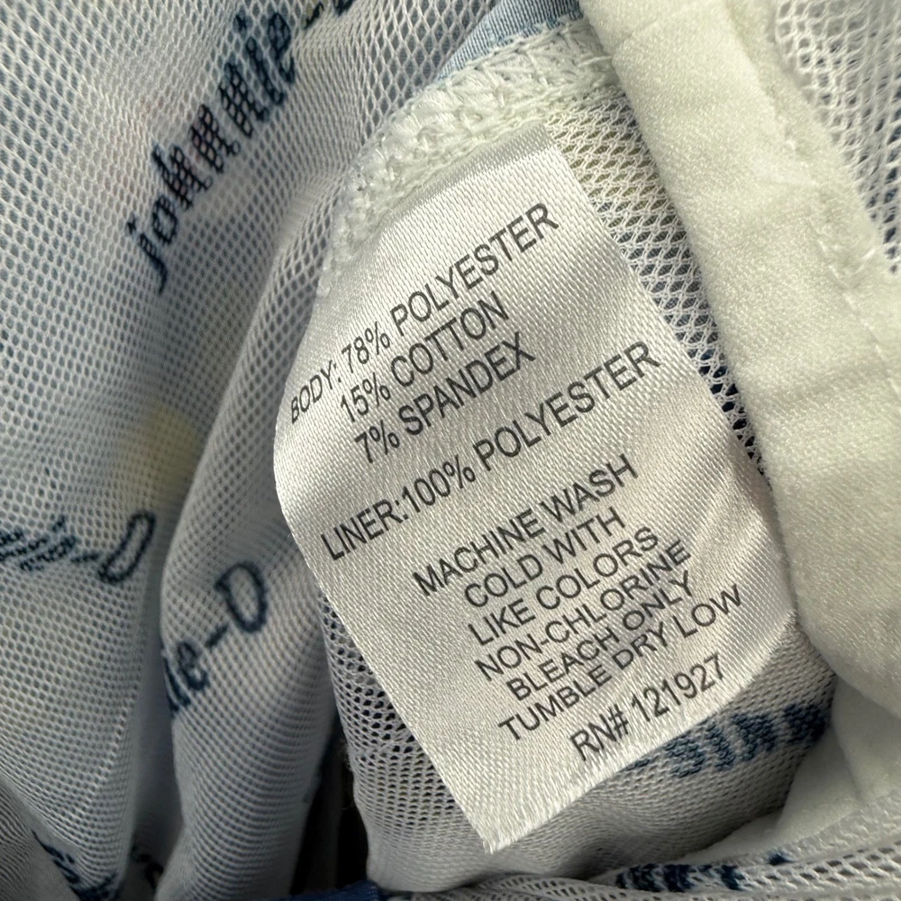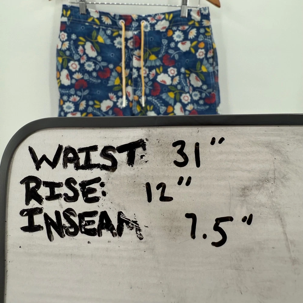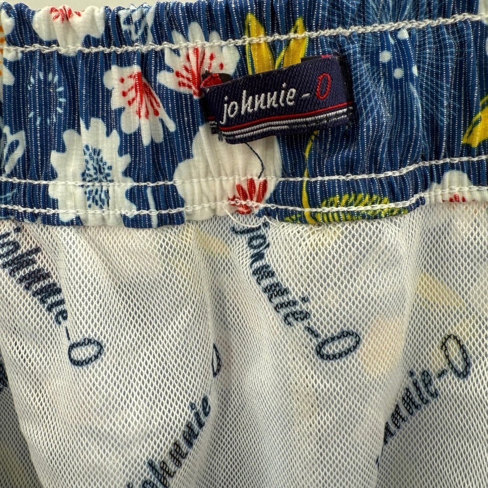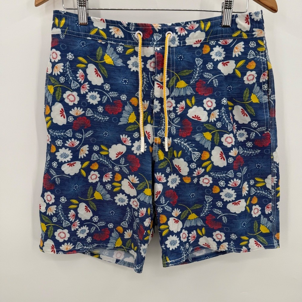 Stylish floral swim trunks by Johnnie-O, featuring a vibrant pattern of red, white, and yellow flowers against a blue background. These shorts have a comfortable elastic waistband with a drawstring for a secure fit. Functional design includes a back pocket with a button closure, as well as a front pocket, perfect for storing small items. The interior is fully lined with mesh for breathability and comfort, enhancing the overall wearing experience. These swim trunks are ideal for adding a pop of color and style to your beach or poolside look. Measurements: • Waist: 31" • Rise: 12" • Inseam: 7.5" Color: Blue Swim Bottom Style: Swim Shorts Department: Men Pattern: Floral Features: Back Pocket, Elastic Waist, Drawstring, Lined, Pockets, Quick Dry Material: Polyester, Spandex, Cotton Performance/Activity: Surfing, Recreational Keywords: Johnnie-O, swim trunks, floral shorts, mens swimwear, beach shorts, pool shorts, blue floral, size 31, elastic waist, drawstring, casual shorts, summer fashion, vacation wear