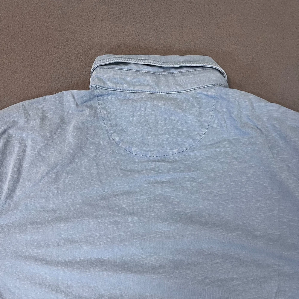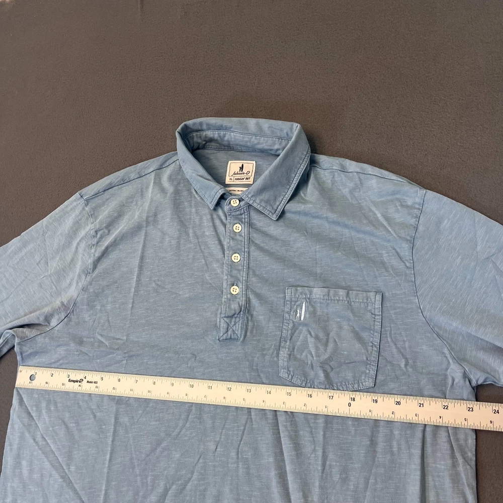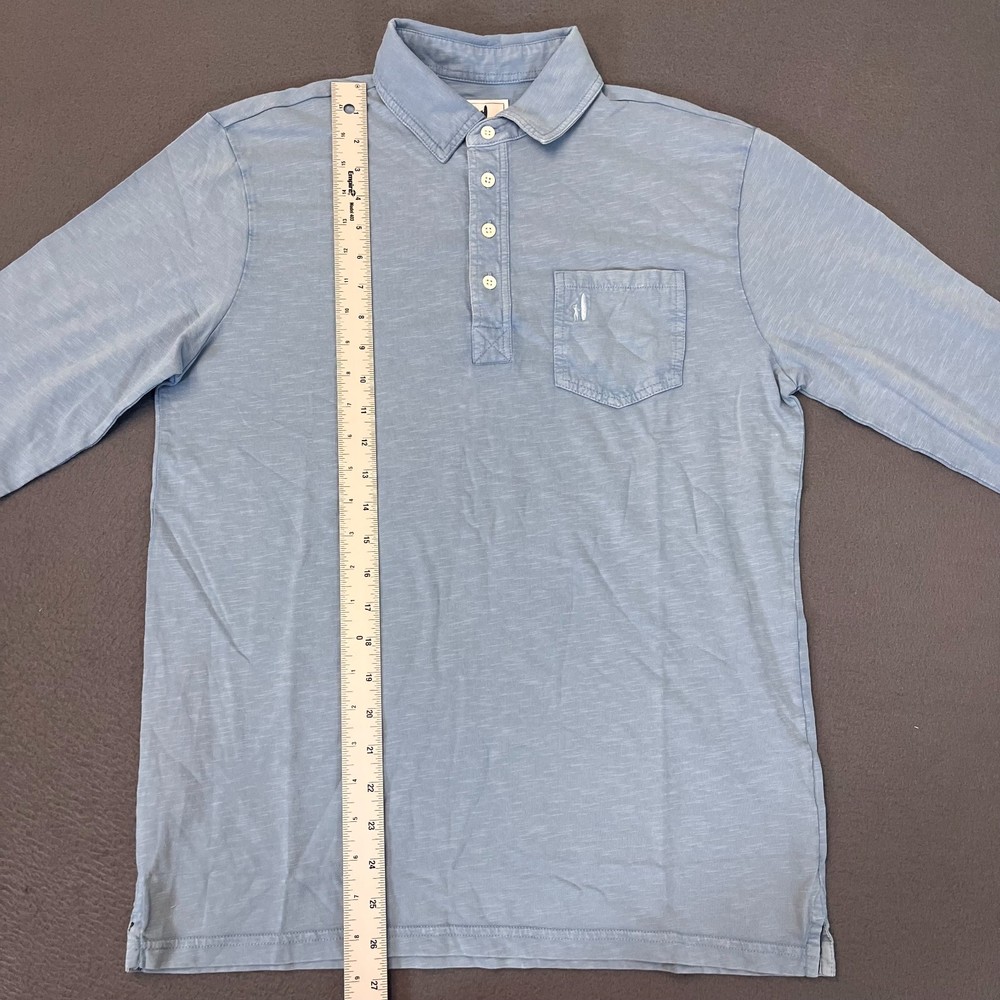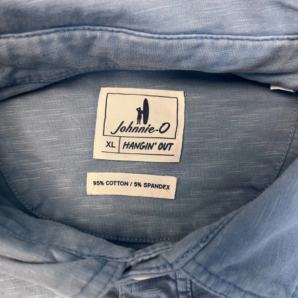Measurements are approximate S - Chest 38 in, Front Length 27 in M - Chest 42 in, Front Length 27 in L - Chest 44 in, Front Length 28 in XL - Chest 46 in, Front Length 29 in XXL - Chest 50 in, Front Length 39 in The Johnnie-O Hanging Out Polo Shirt is a stylish and versatile addition to any man's wardrobe. Made from a comfortable blend of spandex and cotton, this Maliblu blue Malibu long sleeve polo features a classic collared neckline and logo accents. Perfect for various activities such as walking, beach outings, or even golf, this lightweight and stretchy shirt is machine washable for easy care. With a nature-themed design and a hint of California coastal style, this polo is suitable for all seasons and can be dressed up or down for any occasion.