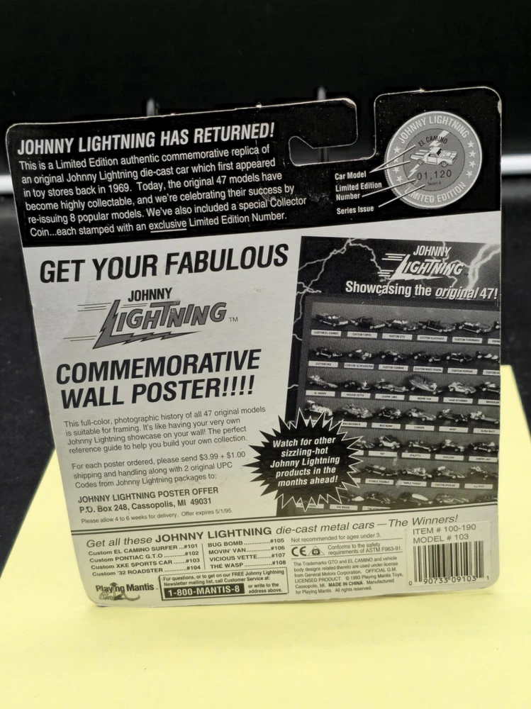 MPN: 100-190 Model #103 Material: Diecast Modified Item: No Recommended Age Range: 3+ Features: Limited Edition, Unopened Box, Collector Coin with Limited Edition Number Gender: Boys & Girls Country/Region of Manufacture: China gtin13: 090733091031 UPC: 090733091031 Scale: 1:64 Vehicle Make: Jaguar Year of Manufacture: 1993 Theme: Commemorative Replica Redline Series: Johnny Lightning Challengers! Vehicle Type: Car Color: Gray Model: Custom XKE Brand: Johnny Lightning