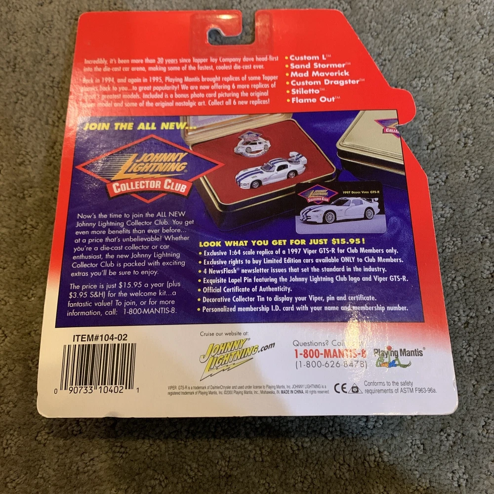 Features:Unopened BoxVehicle Year:2000Character Family:NAMaterial:Diecastgtin13:Does Not ApplyYear of Manufacture:2000Color:Multi-ColorScale:1:64Theme:NAUPC:Does Not ApplySeries:Topper SeriesVehicle Type:CarBrand:Johnny LightningVehicle Make:NAModel:Stiletto