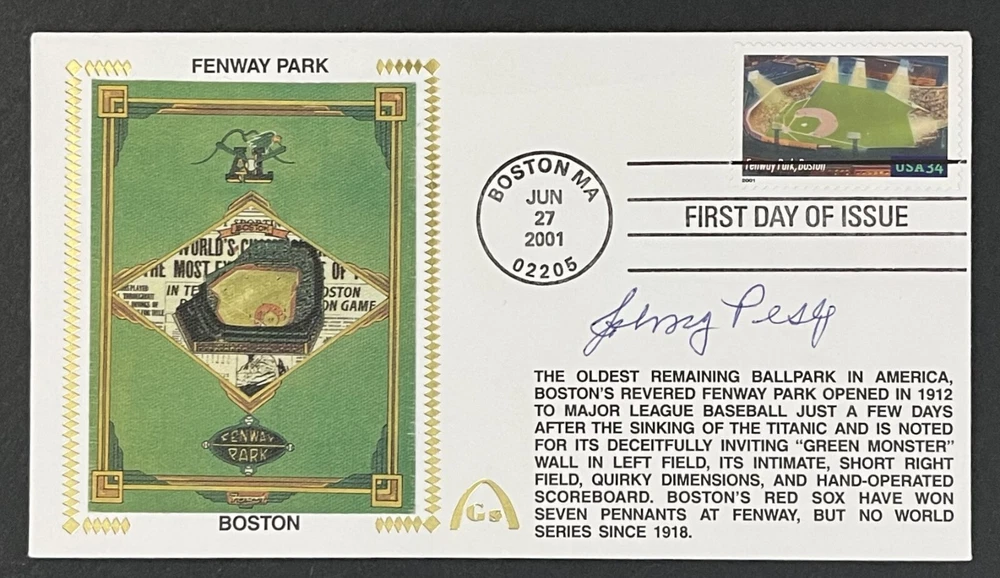 Items in the 8:00 pm Eastern group are (subjectively) in better condition. 8:05pm EDT are the second tier, and 8:10 and 8:15 will have more noticeable imperfections. ------------------------------------------------------------------ Player(s): Johnny Pesky Event: Fenway Park USPS Stamp – Legendary Playing Fields – First Day Of Issue – First Day Cover Postmark: June 27, 2001 in Boston, MA Bio: Boston Red Sox, Detroit Tigers & Washington Senators You are bidding on a Gateway Stamp Cachet that has been personally autographed by Johnny Pesky. This limited edition, collectable & philatelic envelope cannot be reproduced beyond the original inventory of postmarks. ---------------------------------------------------------------------- The condition of items in this store can vary greatly. Please double-check the provided images for imperfections before placing substantial bids. Only less-common blemishes or those difficult to see in the photos may be noted in the “Item specifics” section. Please double check all images provided to ensure you are comfortable with the product. Questions are always welcome! SHIPPING: Includes bubble protected envelope, hand-cut styro-board protection, and plastic top-loader for even more protection. Standard Shipping & Handling is $3.99 to the United States. Combined shipping for multiple items at no charge. All scheduled auctions in this store end on Sunday evenings. Each 5-minute interval will contain several auctions (usually 6-12 items). Mistakes in auction scheduling do occur from time to time, but the expected scheduling of items will be from 8:00 until 8:10 PM (Eastern Time). Note: Many of the items that we offer on eBay have a starting price of around 90% OFF the retail price.