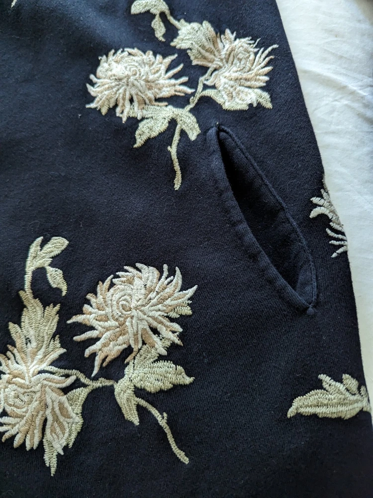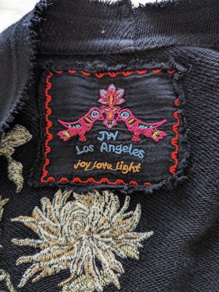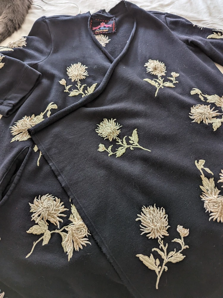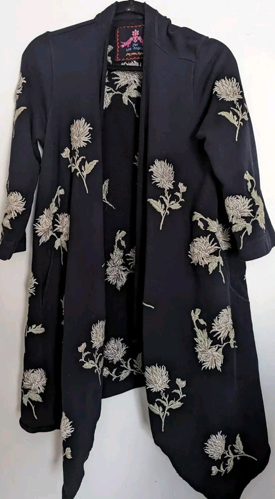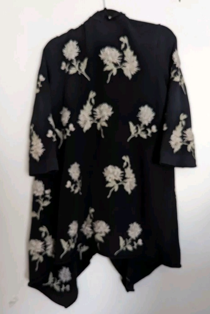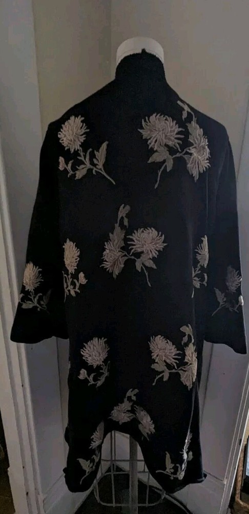 This gorgeous Johnny Was duster hooded cardigan is perfect for any occasion. The embroidered chrysanthemum floral pattern on black with taupe & beige is stunning and the cotton blend outer shell material is comfortable to wear. The kimono style and relaxed fit make it a great addition to any wardrobe. The long sleeve sweater is perfect for all seasons, from winter to summer. It is recommended to dry clean only to keep it looking its best. This jacket is versatile and great for travel, parties, casual events, formal occasions, and business meetings. The theme is designer, flower, beach, art, Aztec, bohemian, Southwestern, tribal themes.