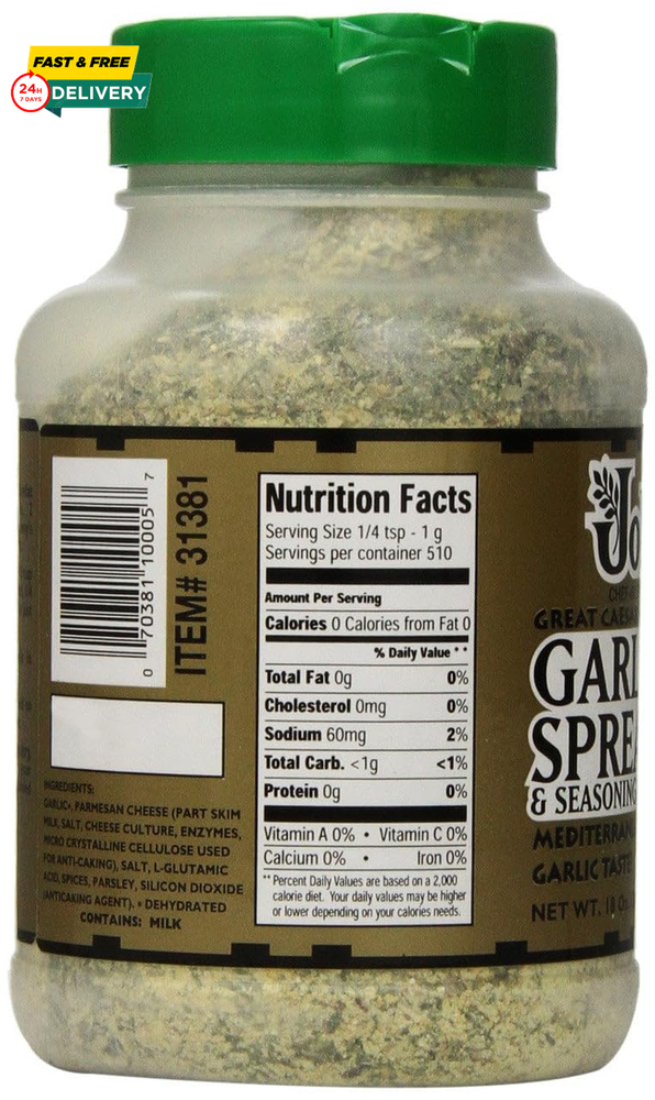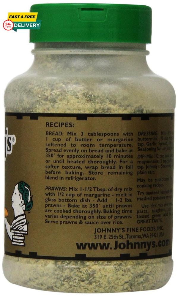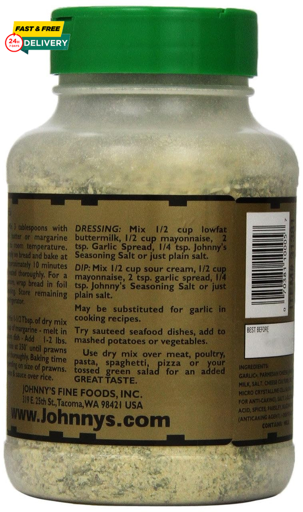 Menu Other Items Feedbacks About Us Contact Us Add To Favorites Johnny'S Garlic Spread and Seasoning, 18 Oz Blend of premium Parmesan cheese, garlic and other spices. Versatile and a quick solution to spice up any meal. Goes great on breads, pastas, or vegetables. Looking for a new flavor? Pour some on a bowl of popcorn. Trust us, you’ll be glad you did. A truly unique seasoning with real Parmesan cheese, garlic and our own special spices. Mix with butter for great garlic bread! Makes a tasty dressing or dip. Sprinkle over meat, chicken, pork, pasta, spaghetti, pizza, seafood and salad. Adds a wonderful garlic flavor to any of your favorite dishes. Item Specification Item model number 10005 Unit Count 18 Ounce Number of Items 1 Is Discontinued By Manufacturer No Product Dimensions 3.54 x 3.54 x 6.14 inches; 1.13 Pounds Specialty Garlic Units 18 Ounce Manufacturer Johnny's Item Form Powder Brand Ogefine Size 18 ounce (Pack of 1) Dimensions Shipping Returns Additional Info Product Dimensions: 3.54 inches x 3.54 inches x 6.14 inches. Weight: 1.13 lb Fast shipping is very important for us. Our standard shipping service is FREE. Your order will be shipped within 1-3 business days upon full payment received. Most items are delivered within 3-5 business days, however, please allow 3-10 business days. We are shipping only to USA. We only ship to the confirmed Paypal address. We reserve the right to cancel any order for any reason at any time. We are not responsible for undeliverable addresses. We offer a 30 day return policy from checkout winning date. Your satisfaction is guaranteed! If for any reason you are unhappy with your item, just return it within 30 days for a full refund, minus shipping cost. Please contact us prior to initiating a return so that we can issue you a refund authorization. Items defective upon receipt must be packaged in their retail packaging as if new and returned with a detailed description of the problem. Return shipping fees are not refundable. We reserve the right to decline any returns if the above guidelines are not followed. All of our items, unless otherwise stated, will only run on 120 volts. Please check to make sure your country complies with these specifications. If you have a problem or question regarding your transaction please contact us before leaving any type of feedback. We will work with you to resolve any problem you may have.