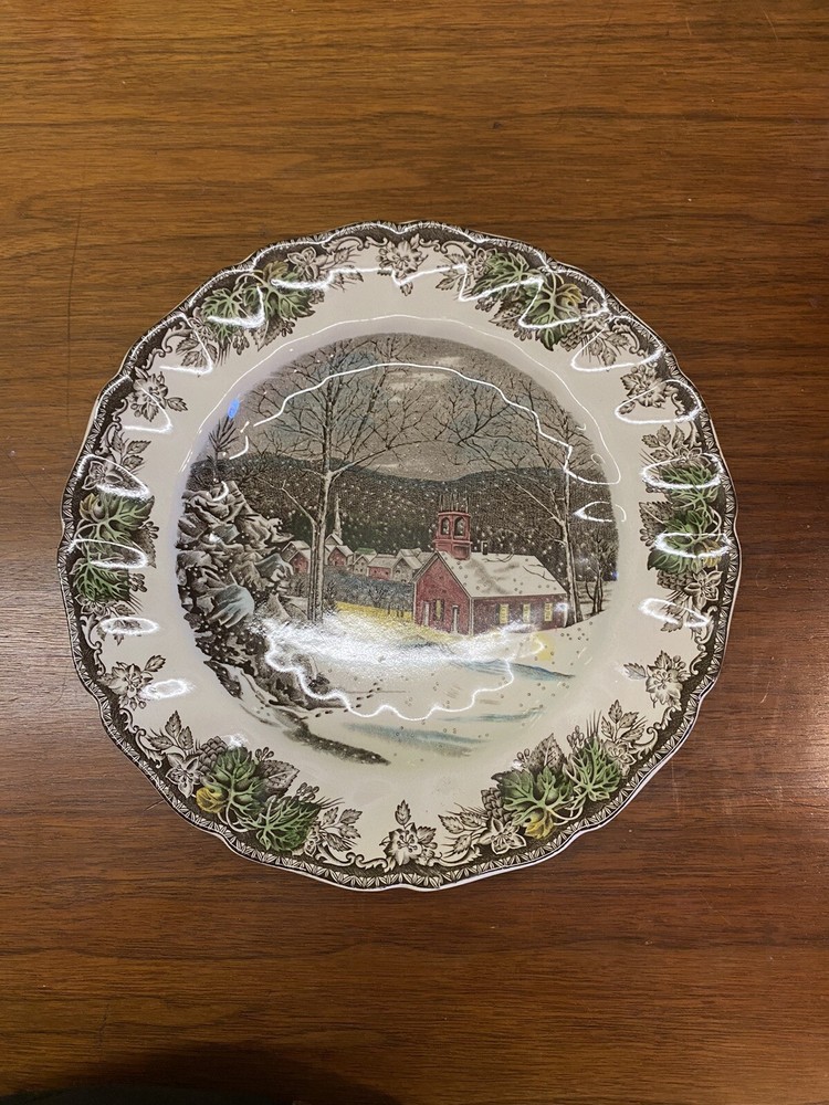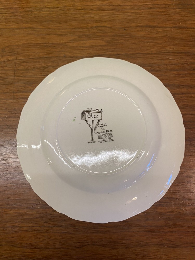 Type:Dinner PlateColor:Multi-ColorStyle:American DirectoireBrand:Johnson BrothersMaterial:PorcelainModel:The Friendly Villagegtin13:Does not applyUPC:Does not applyOriginal/Reproduction:Vintage OriginalPattern:Friendly VillageScene Pattern:The School HouseOccasion:School