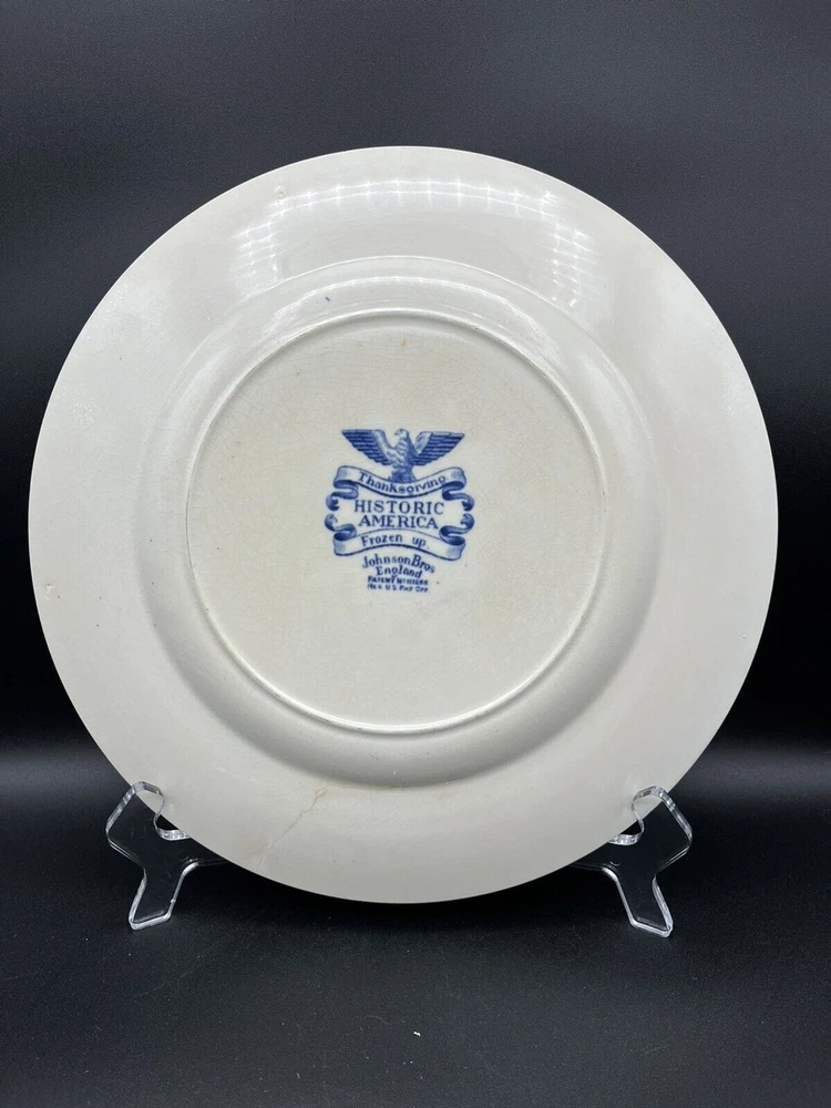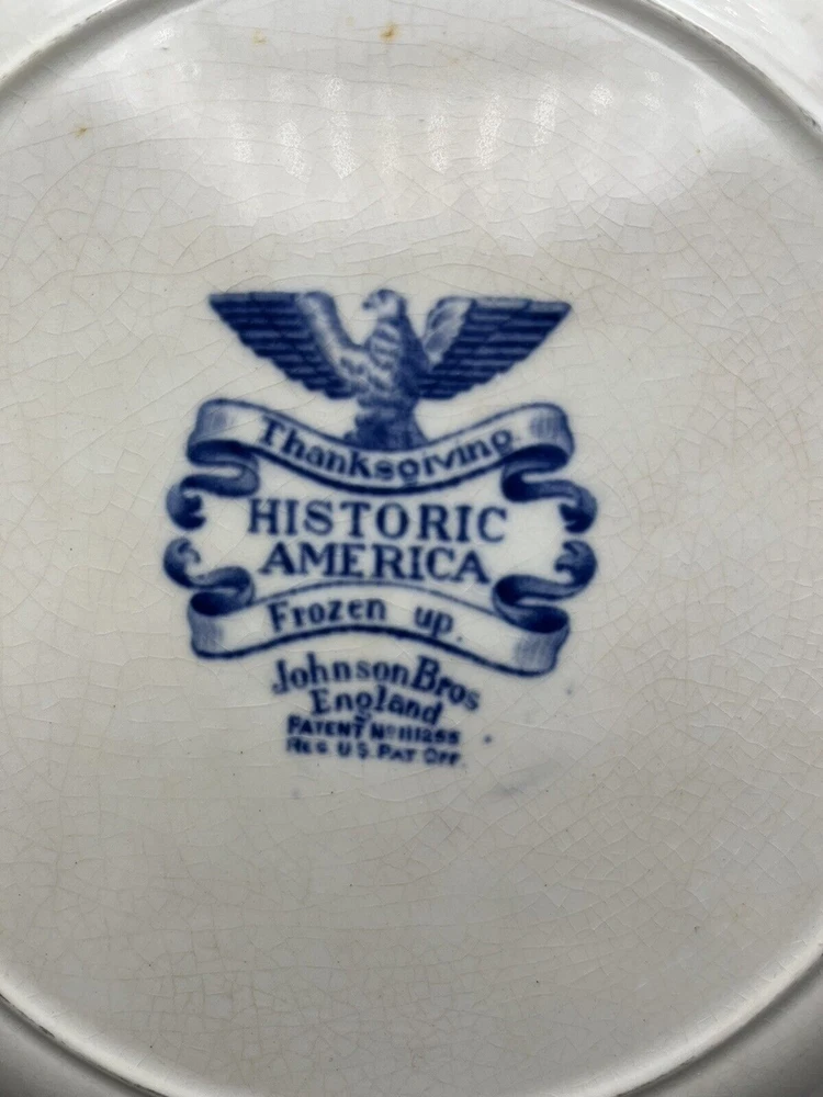 Handmade: No Type: Dinner Plate Production Technique: Pottery Backstamp: Printed Shape: Round MPN: N/a Origin: England Vintage: Yes Original/Licensed Reproduction: Original Country/Region of Manufacture: United Kingdom Material: Porcelain Occasion: Thanksgiving Pattern: Historic America Production Style: Blue and White Pottery Set Includes: Dinner Plate Theme: Thanksgiving Product Line: Historic America Color: Blue Plate Diameter: 10.5” Brand: Johnson Bros Finish: Glossy