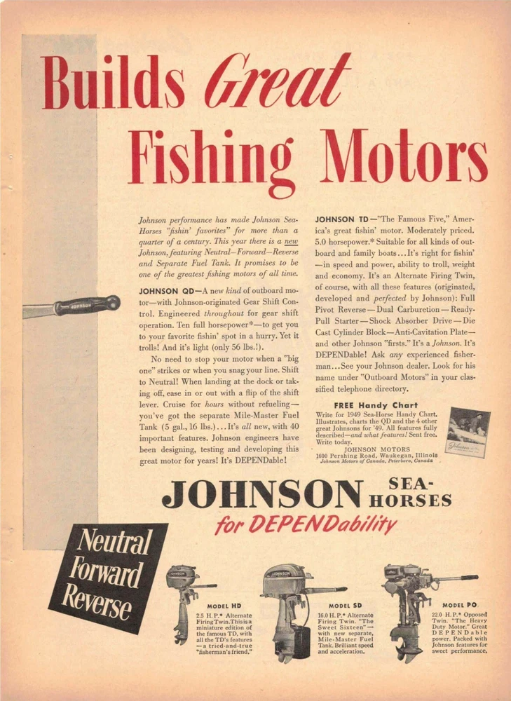 Original 1949 2 page Johnson Sea Horse Outboard Motors Vintage Ad Approximately 8 1/2" x 11" Excellent condition Will be shipped in a magazine bag with backing board and cardboard to prevent damage during shipping. **FREE SHIPPING** All of my items are ORIGINAL not reprints, reproductions etc. Please look at the photo(s) and ask any questions you might have before bidding.