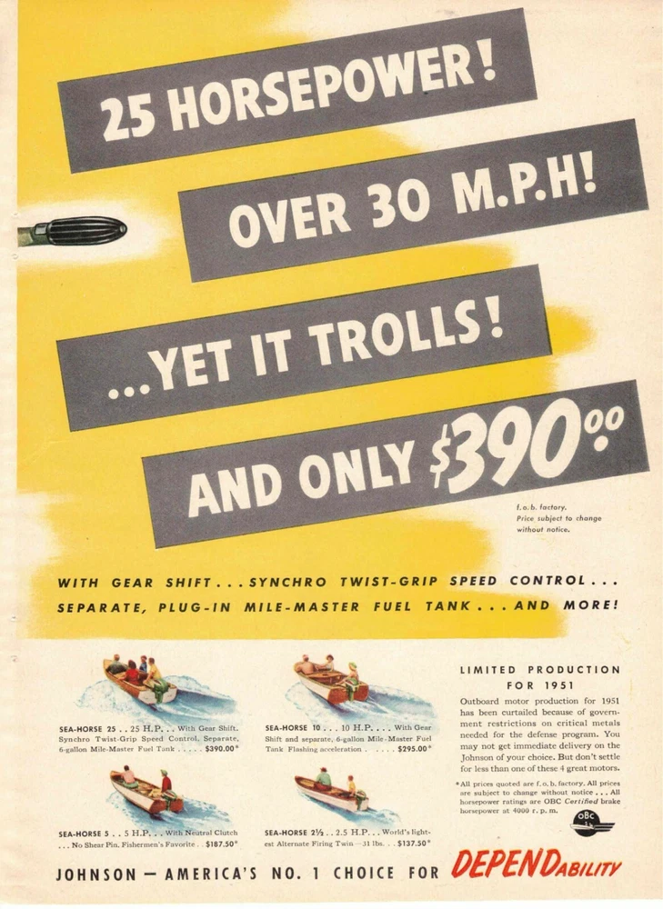 Johnson Sea Horse Outboard Motor 2 pages 1951 This is it Waukegan IL