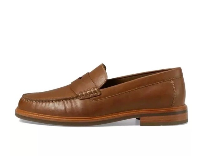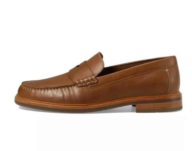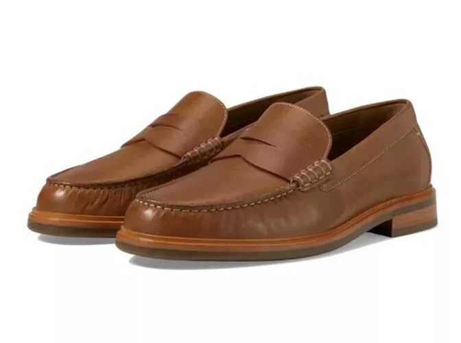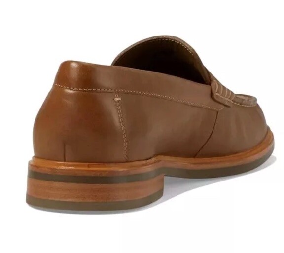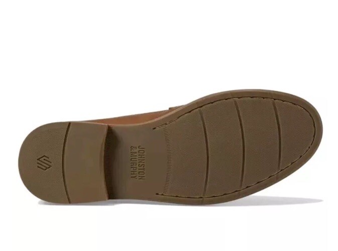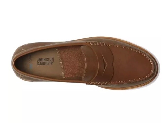 This is a Johnston & Murphy Lyles men's penny loafer in tan full grain Venetian moc style. It features a solid pattern, round toe shape, and slip-on closure. The shoe is made with leather upper, lining, and insole materials, and has a rubber outsole. The shoe width is M and the size is 9. This is a dress shoe that is suitable for formal occasions.