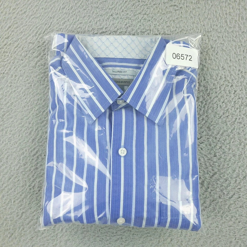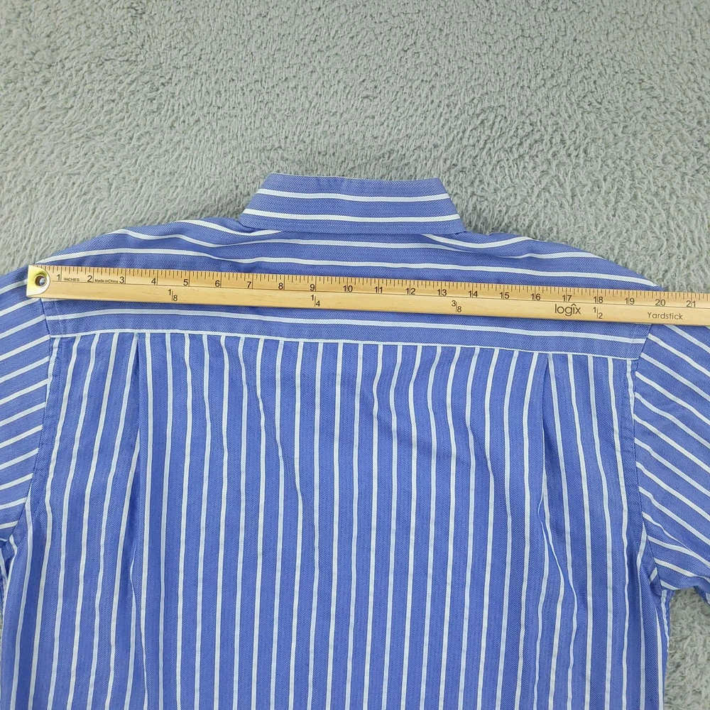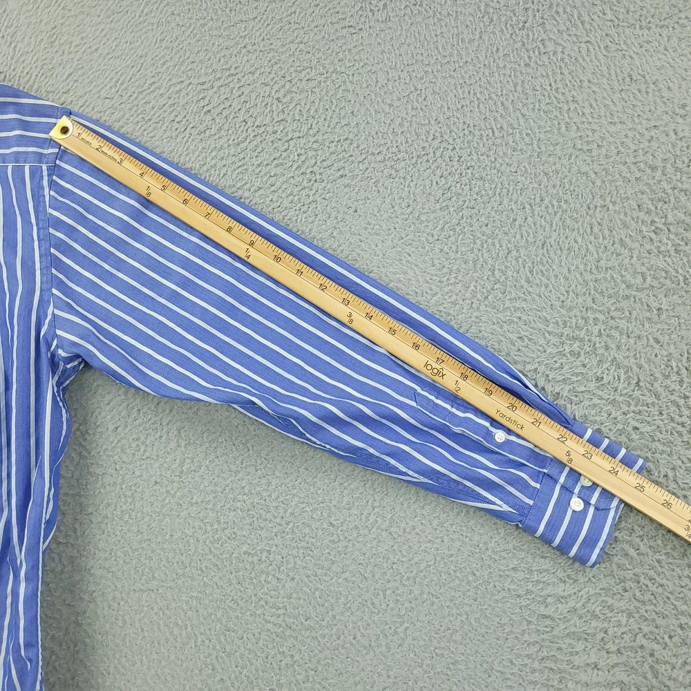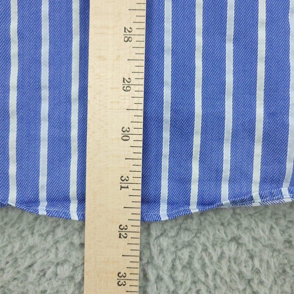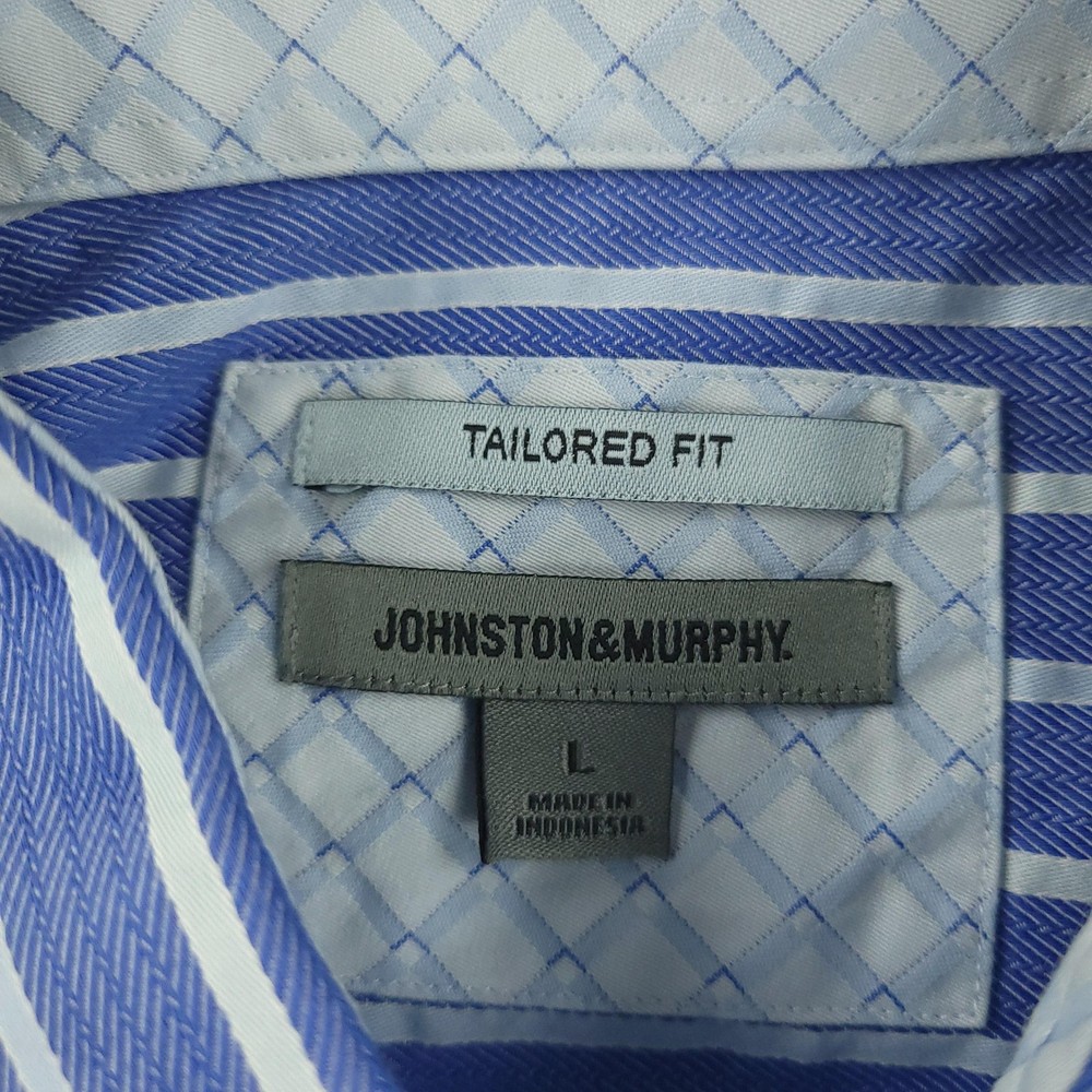 Brand: Johnston & Murphy Style: Mens long sleeve button-front dress shirt in a tailored fit with vertical blue and white stripes and subtle herringbone texture. Color: Blue with white stripe pattern; contrast inner collar and cuffs feature a light blue diamond check design. Material Cotton Size on tag: Large (L) Details: Point collar, front button closure, single chest pocket, adjustable button cuffs, curved shirttail hem with small "J&M" embroidery near the front hem. Made in Indonesia. Washed and dried with Fragrance Free Detergent & Dryer Sheets. Measurements are included in the photos, compare measurements with your item to ensure proper fit. (Measurements are done with the item lying flat). I ship next business day and all items include tracking. Items are added daily to my store Visit My Store Buy More & Save! Combined shipping for US customers - $1.99 for each additional item (Add items to shopping cart and discounts will automatically calculate during checkout)