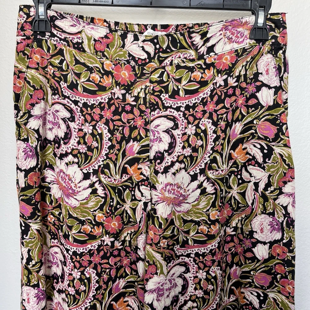 Get ready to embrace the bohemian spirit with these stunning Joie wide-leg pants. Made of 100% linen, these ankle-length pants feature a high-rise waist, flat front, and back elastic for a comfortable fit. The pull-on closure and multicolor dark floral pattern make them perfect for any casual or travel occasion. These pants are a must-have for any summer or spring wardrobe, with a relaxed fit and a 24-inch inseam. The linen fabric type ensures breathability and comfort, while the wide-leg style adds a touch of sophistication. Whether you pair them with a simple tee or a statement blouse, these pants will elevate any outfit. In excellent condition, look almost new Measures approximately 16” across waist laying flat with a 24” inseam and a 12.5” rise 4