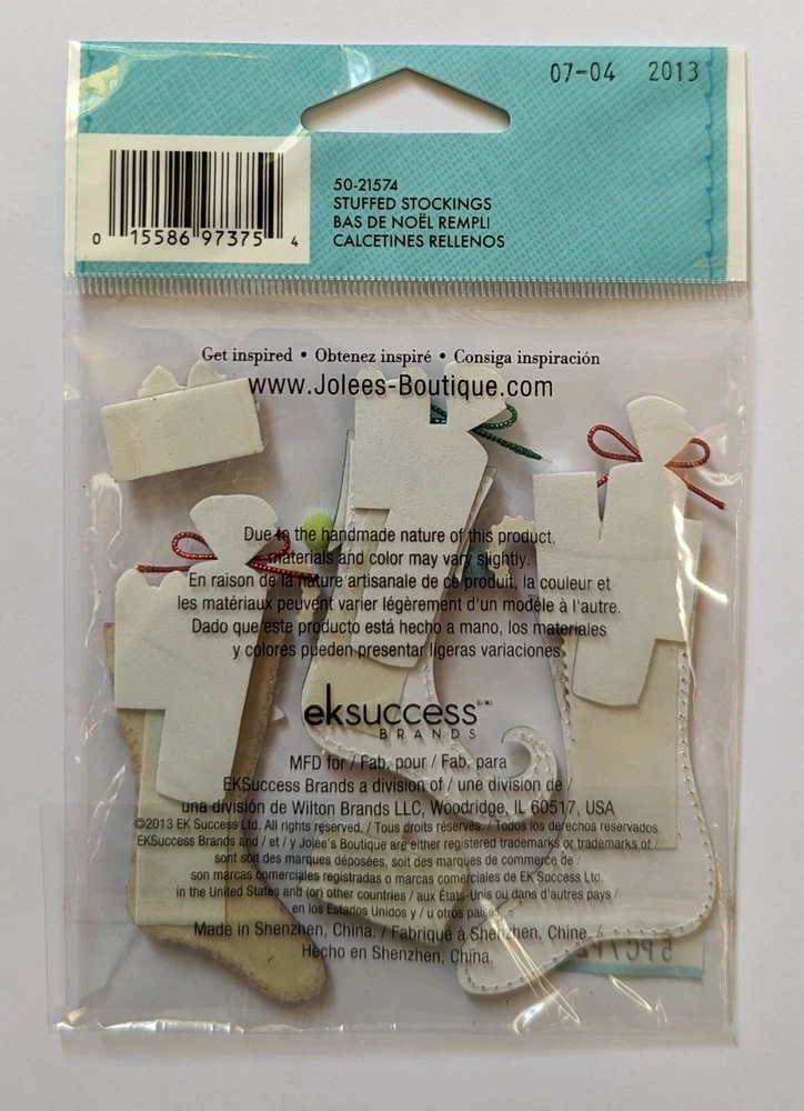 1 pack of "Stuffed Stockings" scrapbooking stickers by Jolee's. (50-21574) New, from a smoke free & pet friendly home. I cannot guarantee the stickiness of older or retired packs of stickers. If there are loose stickers in a pack I always do my best to state that in the listing, but sometimes pieces can detach during shipment. If this happens you will need glue or adhesive to attach them to your project. Please ask all questions prior to purchase because I do not accept returns or cancellations. I'm happy to combine shipping for multiple items, please request an invoice from your cart. A note on shipping times- my handling time is up to 3 business days, but I almost always ship sooner. The estimated delivery date eBay shows at checkout is just that - an estimate! No matter how quickly I send your order USPS can sometimes take a long time to deliver. Items sent with eBay Standard Envelope can take up to 2 weeks (or more) to arrive. Unfortunately I can't control what USPS does once a package is in their possession. Feel free to message me with any questions. Thanks for looking!