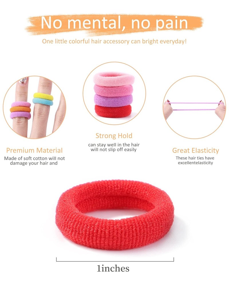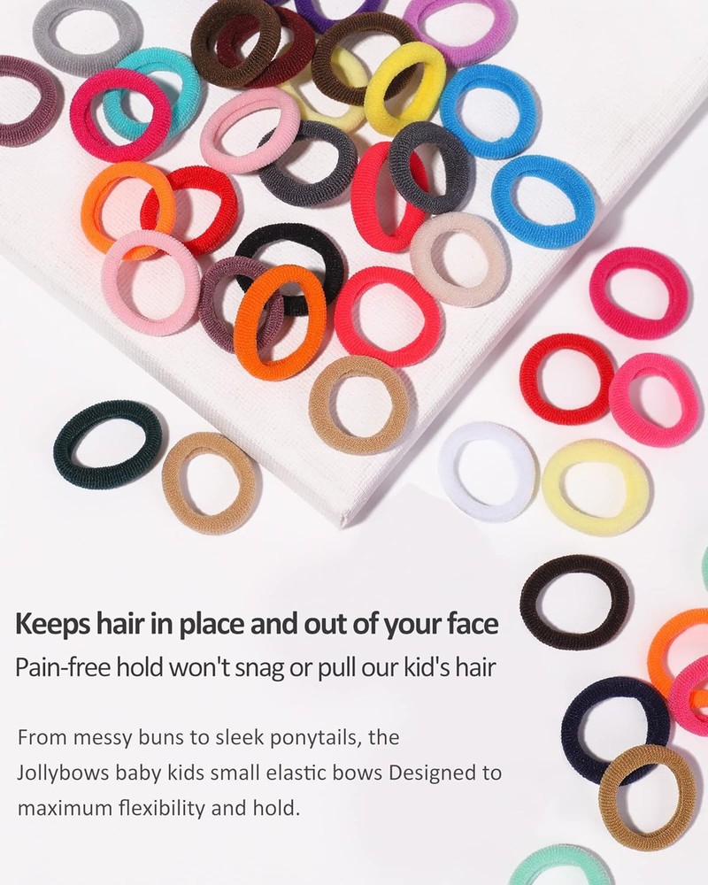Jollybows 300pcs Baby Hair Ties Girls Elastic 1" Multicolored Product Details Package Dimensions : 5.51 x 5.28 x 0.71 inches; 2.65 ounces Manufacturer : jollybows Material: Nylon Item Form: Elastic Brand: jollybows Hair Type: All Number of Pieces: 300 Durable and Stylish:Made of high elastic thick material, the hair bands are soft and stretchy which can hold our or our baby's hair without damage. These girl's hair ties can also keep hair firmly and not easy to loose up Natural Color:30 neutral & highlight colors can easily match different hair colors, also can match all your dressing and hairstyles. 300 pcs 30 colors hair ties are economical to use for a long time. Suitable for ponytail holder for daily use, Homecoming Day or workout No Hair Damge:With seamless design and soft material, the kids and women hair bands are gentle enough to use and remove, will not snag or pull your hair. These hair ties can be stretched up to 3 inches but will not be stretched out easily, which is great elasticity and good for thin hair Widely Used:The 300pcs colorful hair ties with 1 inch diameter make it great for thin hair, thick hair, straight hair, heavy hair and curly hair, easy to form beautiful low or high ponytails, adorable and stylish to perfectly match all kinds of outfits or hairstyles Great for Kids and Women:The rainbow colors hair ties are simple but practical, they can hold your ponytail well for your daily use. They can be applied in various occasions such as school, home, office or using them when you are working out