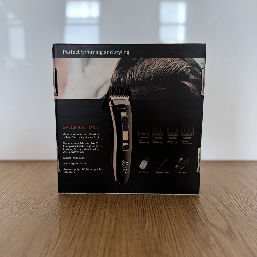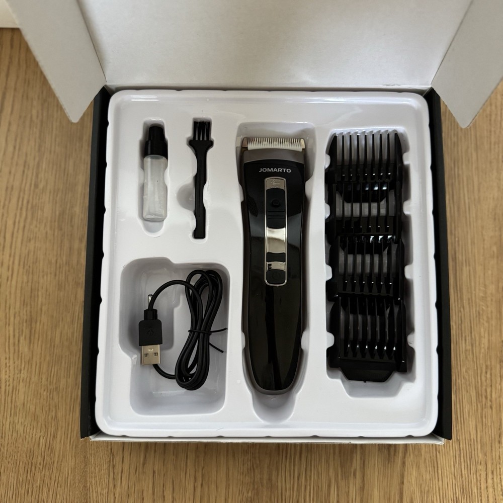 This Jomarto Hair Clipper is an 8 piece set featuring 4 cutting-length attachable combs and an adjustable cutting length control for precise haircuts. The set comes in-box and also includes a cleaning system for proper maintenance and a rechargeable battery for flexible use. It was opened, charged, and tested once to ensure operational quality.
