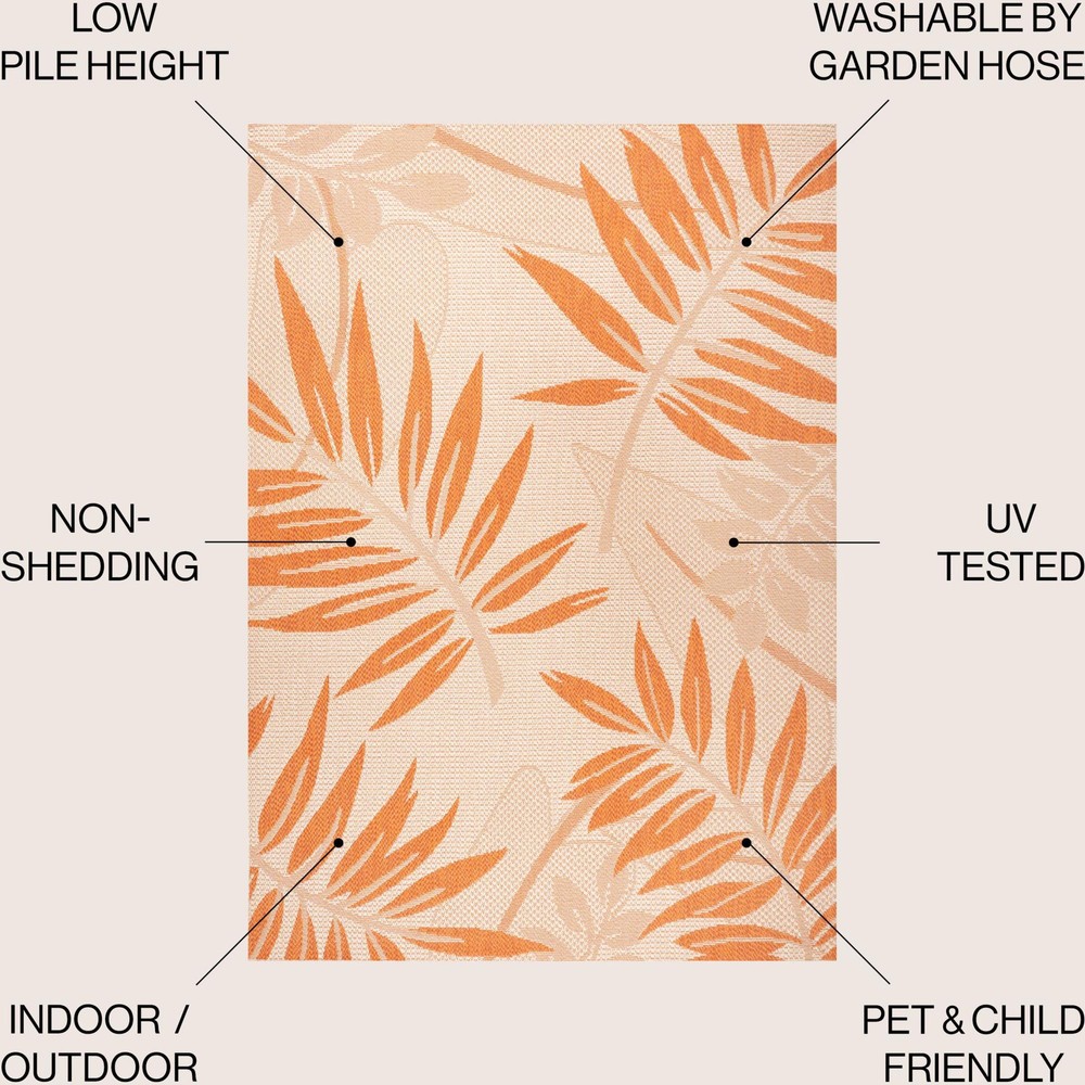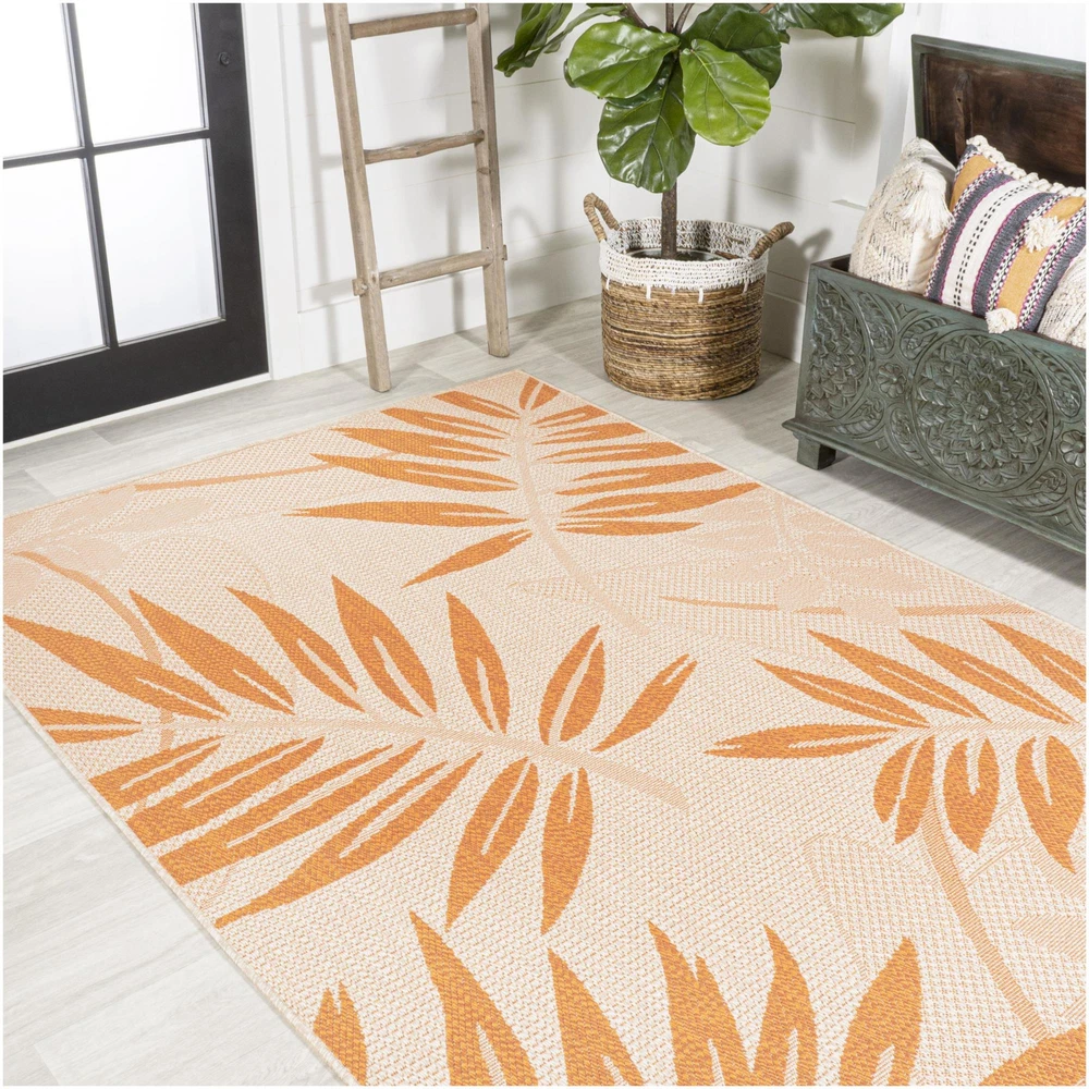 1. This vibrant palm leaf rug adds a tropical touch to any space—indoors or outdoors—with its durable polypropylene construction that resists fading and stains. The colors pop beautifully, and it's easy to clean with just a hose or mild soap. Lightweight yet sturdy, it pairs perfectly with a rug pad for extra comfort. A stylish, low-maintenance upgrade for patios, porches, or sunrooms!