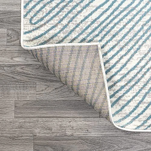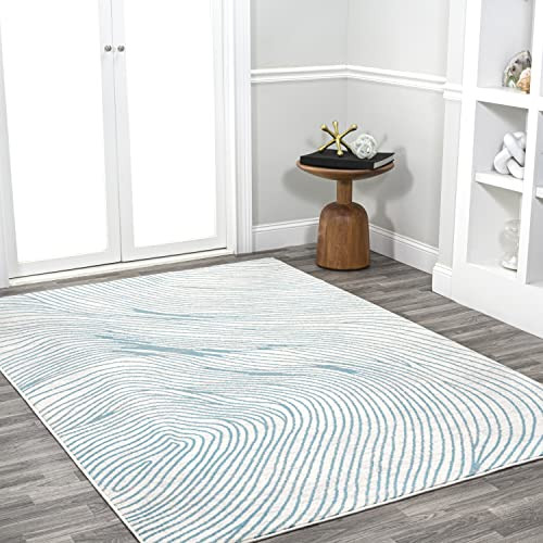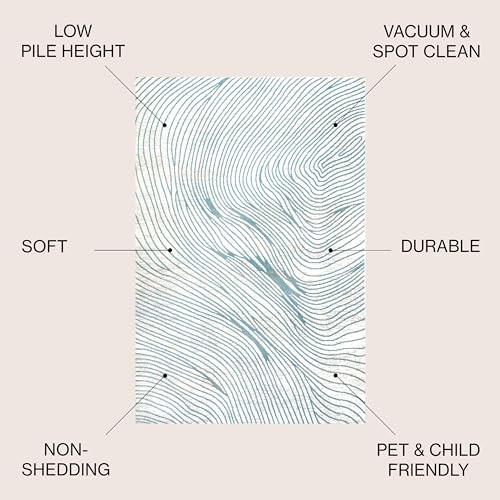 Inspired by the sinuous lines of woodgrain, our bold geometric rug has a modern, coastal vibe. An overall pattern made from easy-care fibers makes it perfect for homes with kids and pets. Use this stylish rug to anchor a living room, dining room or bedroom. The versatile two-tone design is ideal for a contemporary, beach house or minimalist interior. PET-FRIENDLY AND DURABLE: Durable for high-traffic areas, soft and comfortable area rug perfect for families with kids; Low-pile synthetic rug fibers won’t trap dirt and debris, so they’re pet-friendly and easy to clean STAIN-RESISTANT AND NON-SHEDDING: This rug is made from synthetic fibers that are water resistant, stain resistant; It’s been machine-woven so the rug fibers will stay put; When properly cared for, this rug won’t shed fluff into your home EASY TO CARE FOR: Vacuum regularly; Always raise or turn off the beater bars on your vacuum; Spot clean stains immediately with a mild detergent or carpet cleaning product, then rinse thoroughly and blot dry; Professional rug cleaning is recommended Power loomed from durable synthetic fibers, with a short 0.31" pile Against a mingled gray and ivory background, deep blue-gray swirls give this rug its modern abstract look
