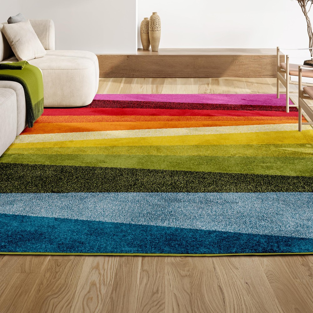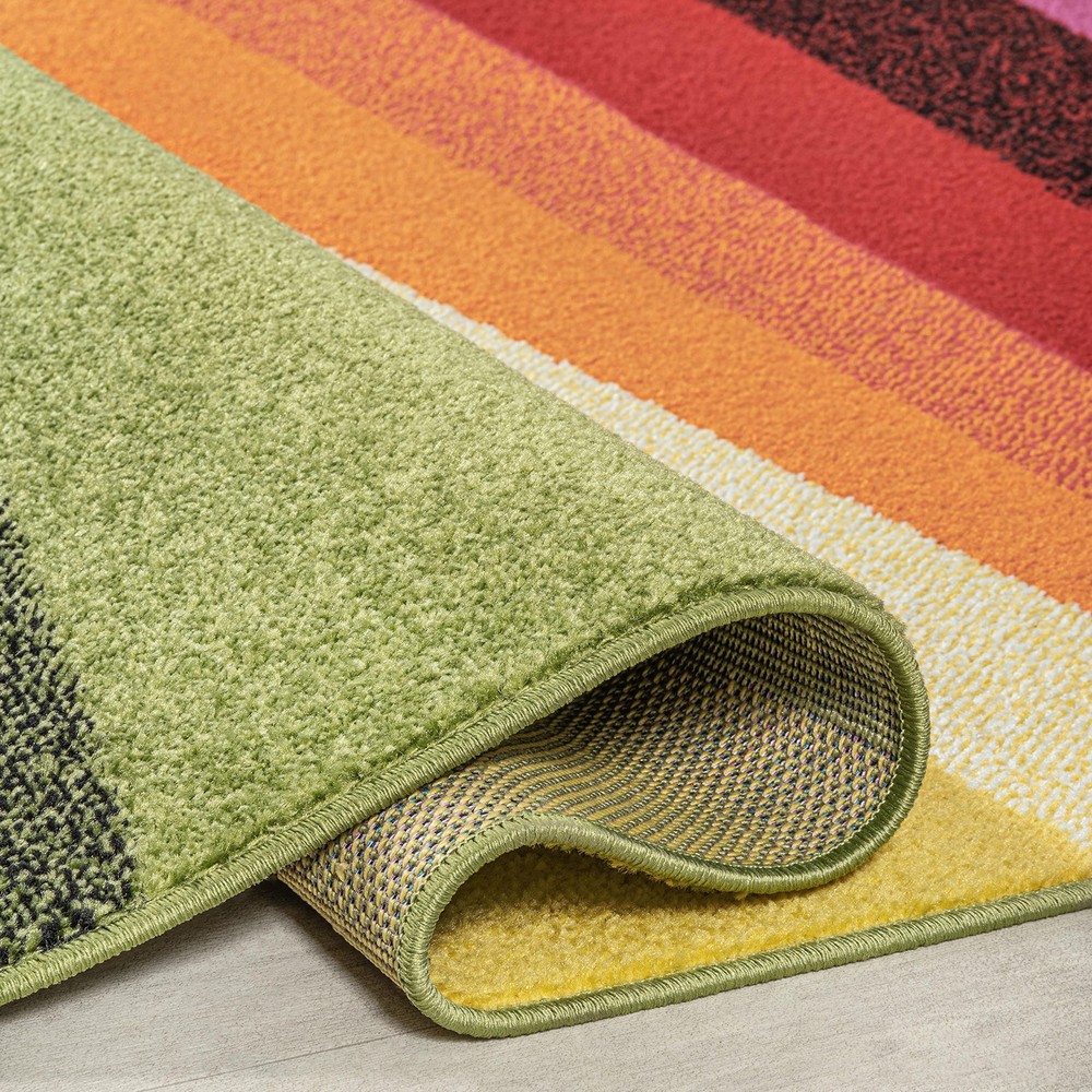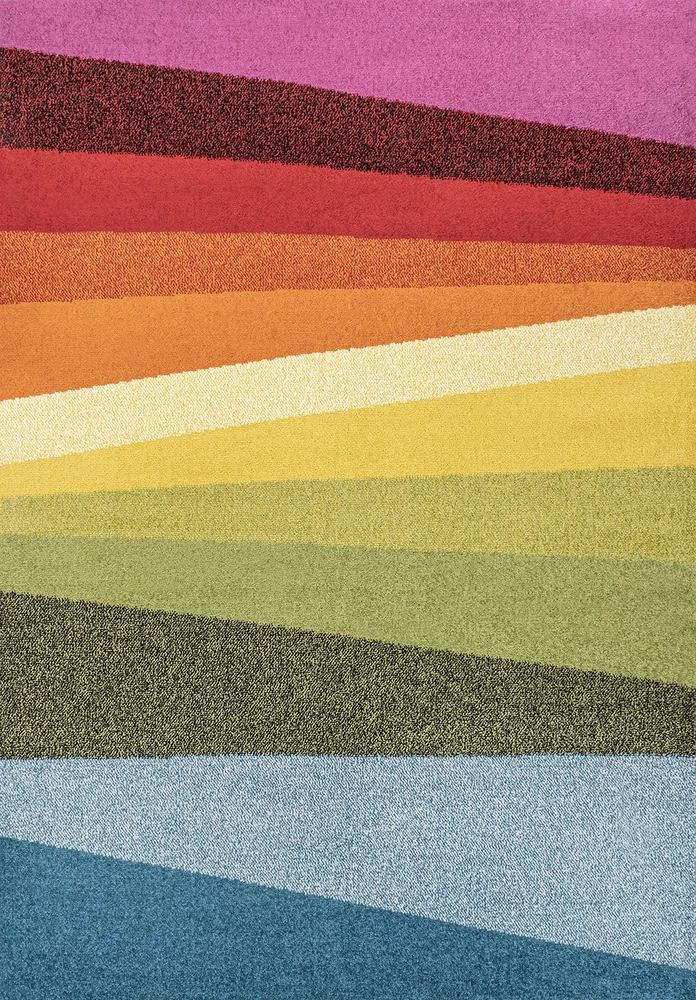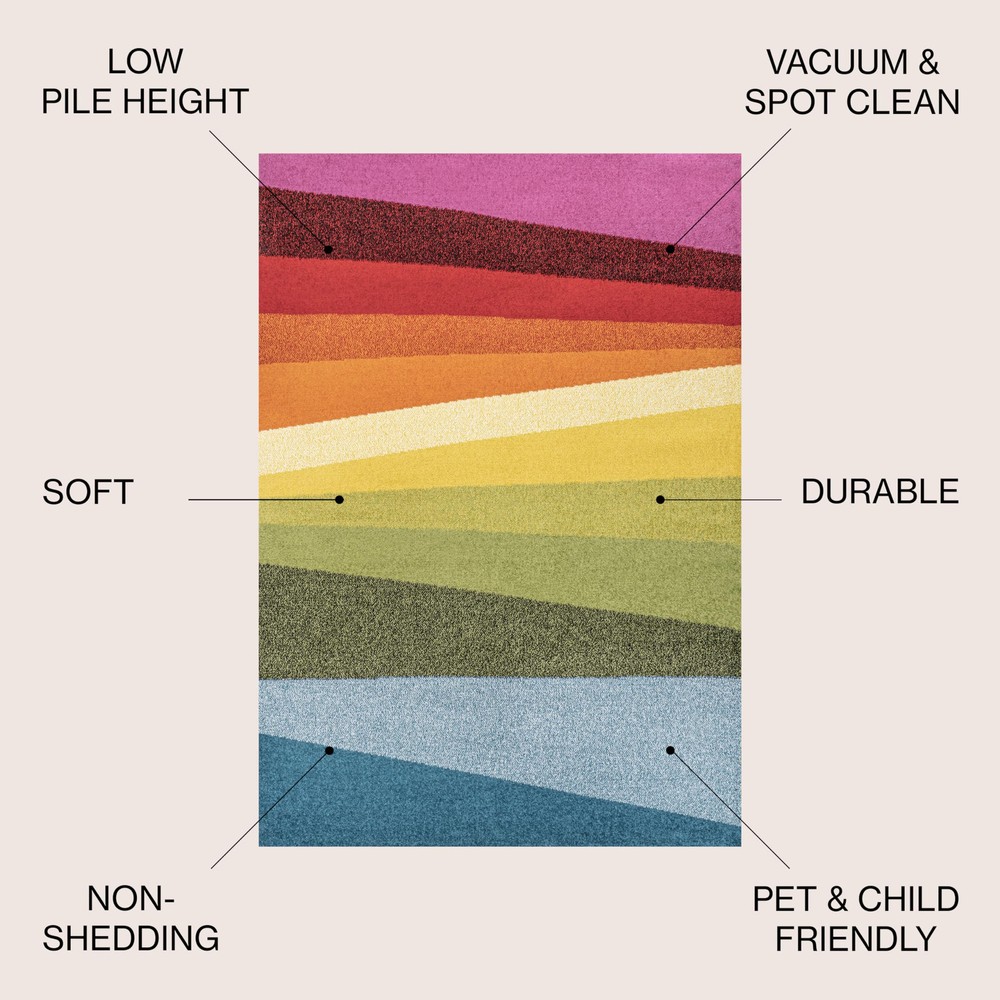 This colorful rug combines geometric angles and stripes for a colorful retro vibe that recalls bold mid-century rug designs. This modern, abstract rug's busy pattern makes it perfect for homes with kids and pets. It's the perfect accent for a mid-century modern or contemporary living room, dining room or bedroom. PET-FRIENDLY AND DURABLE: Durable for high-traffic areas, soft and comfortable area rug perfect for families with kids; Low-pile synthetic rug fibers won’t trap dirt and debris, so they’re pet-friendly and easy to clean STAIN-RESISTANT AND NON-SHEDDING: This rug is made from synthetic fibers that are water resistant, stain resistant; It’s been machine-woven so the rug fibers will stay put; When properly cared for, this rug won’t shed fluff into your home EASY TO CARE FOR: Vacuum regularly; Always raise or turn off the beater bars on your vacuum; Spot clean stains immediately with a mild detergent or carpet cleaning product, then rinse thoroughly and blot dry; Professional rug cleaning is recommended Durable woven design with a short 0.35" pile Our bold design features a bright, retro-inspired rainbow of color