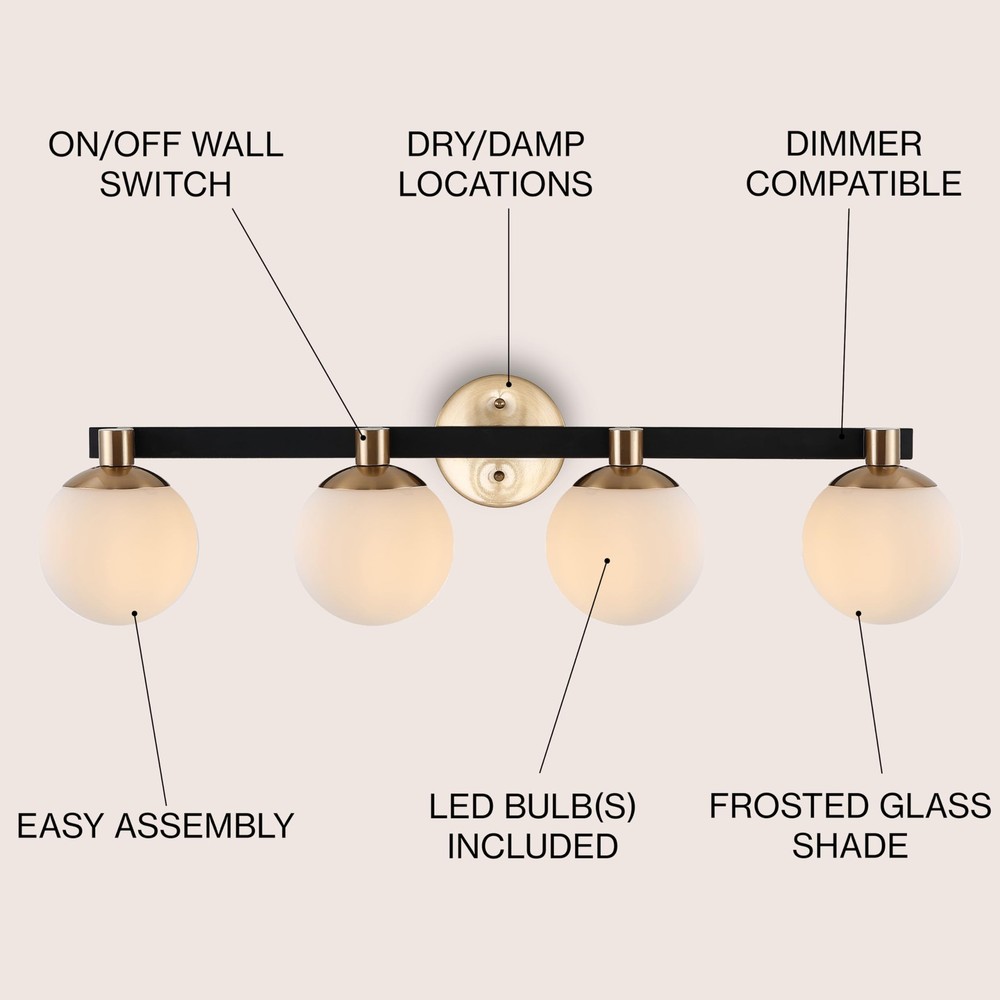 Classic style meets modernism with our Art Deco-inspired frosted globe wall light. Four LED lights cast a warm glow, providing plenty of light. The rich brass-gold finish adds vintage style to your bath vanity, kitchen, hallway or entry. QUALITY CONSTRUCTION: Wall light fixtures are used as general lighting; Available in amazing variety; Replacing old, outdated wall lights is a fast and affordable way to update your home design ENERGY-SAVING LED BULBS INCLUDED: LED bulbs are included with every light fixture; All of our lighting is ETL Listed and meets 120-volt UL standards for safety and quality; Professional installation is recommended for all wall light fixtures SATISFACTION GUARANTEED: Every JONATHAN Y design is created with uncompromising attention to detail, using only the highest quality components; Based in Soho, New York, designer Jonathan and his talented team create affordable high-end home decor Replace outdated wall sconces or vanity lights with this Art Deco classic for an instant midcentury style makeover Our light fixtures work with LED-compatible dimmers; professional installation is recommended