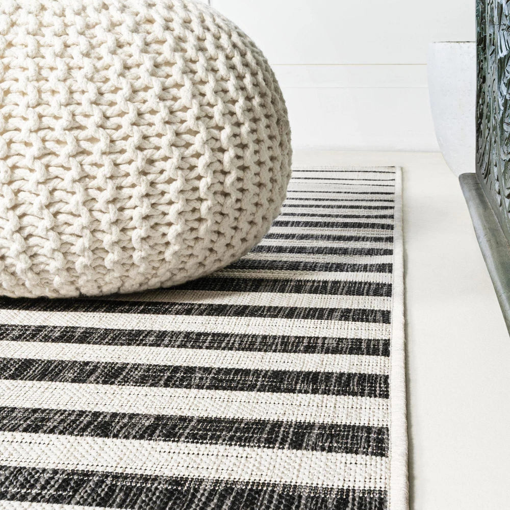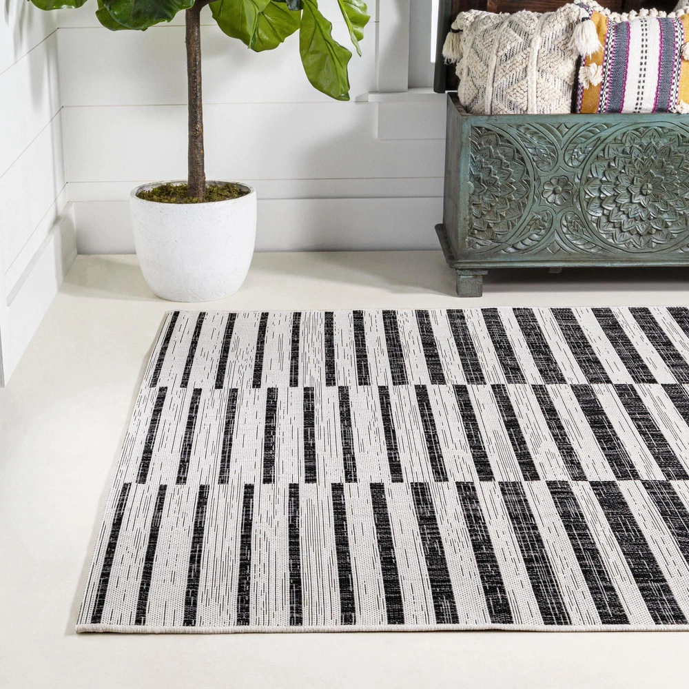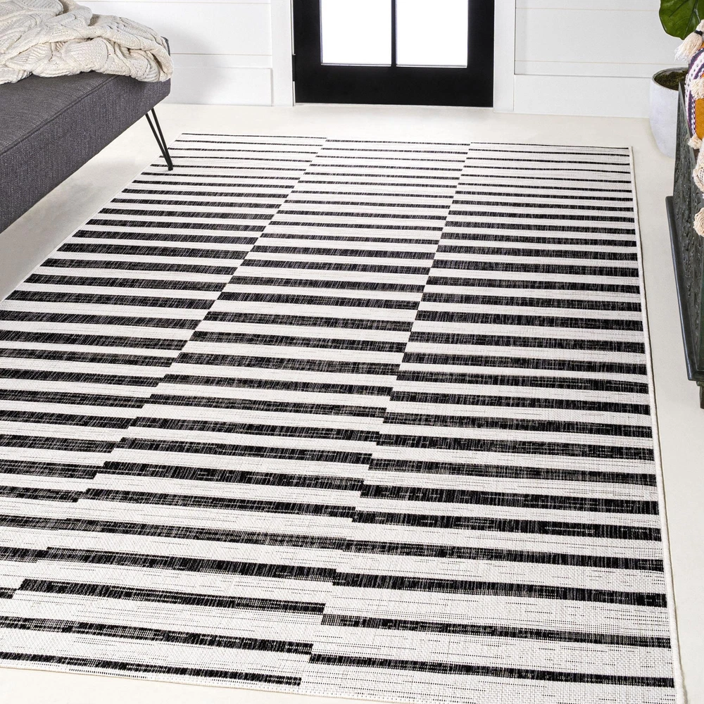 1. This rug is a game-changer! The soft, low-pile polypropylene feels great underfoot and the offset stripes add a stylish mid-century vibe. Perfect for indoor or outdoor use, it’s durable, easy to clean, and instantly elevates any space. The ivory and black color combo is timeless—works in living rooms, bedrooms, or even entryways. Love how versatile and chic it is!